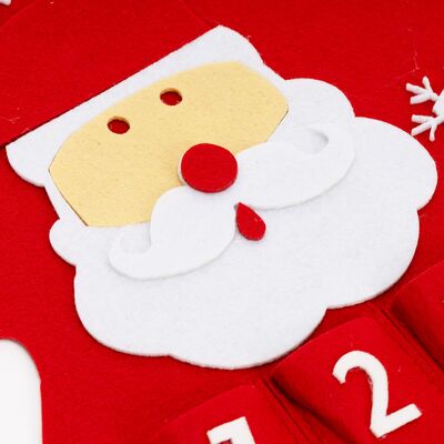 Dekoratívny adventný kalendár s motívom Santy prinesie deťom radostné očakávania Vianoc. Nástenný kalendár obsahuje 24 kapsičiek na drobné darčeky, sladkosti alebo milé odkazy. Vyrobený z prírodných materiálov, doplnený o praktickú stuhu na zavesenie. Skvele sa hodí ako vianočná dekorácia do detskej izby aj obývacej priestoru. Šírka 37 cm, výška 60 cm, rozmery kapsičky 3,5x4,5 cm.