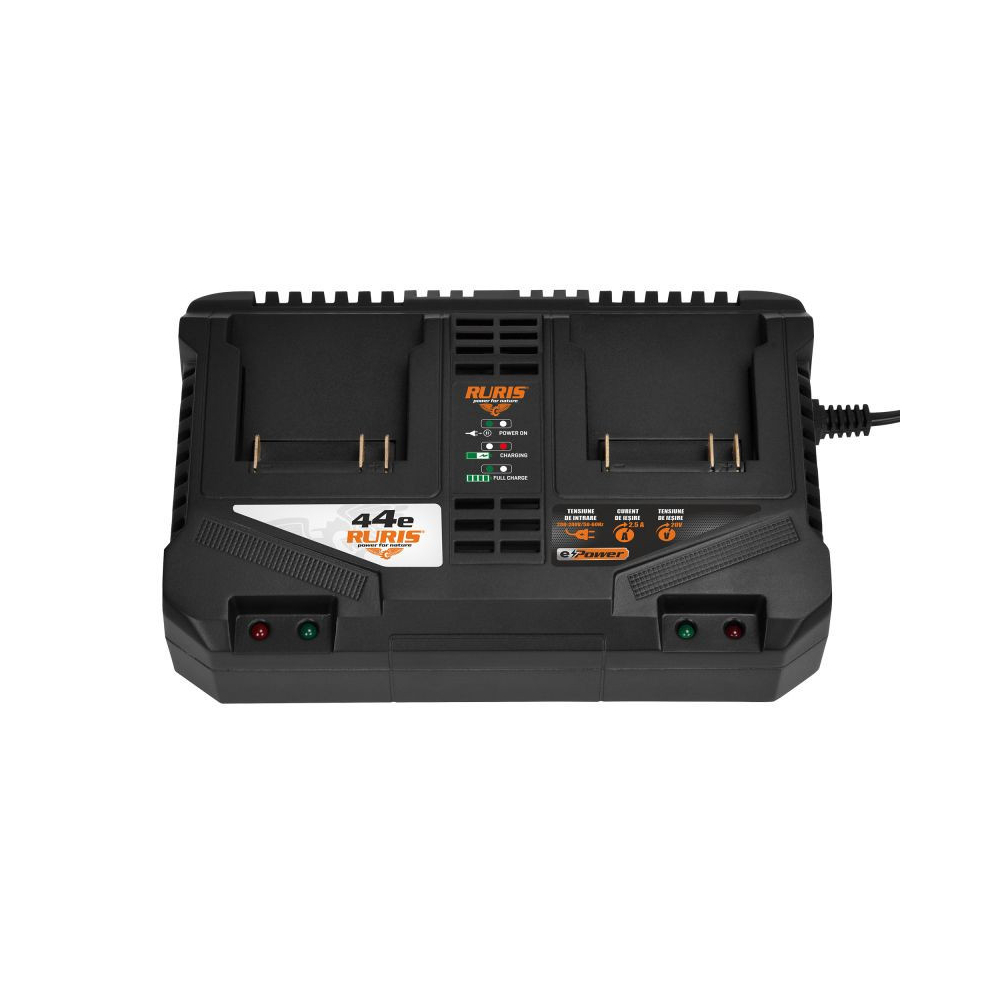 Duálna nabíjačka RURIS 44e je efektívne, rýchle a spoľahlivé nabíjacie zariadenie navrhnuté tak, aby umožňovalo ľahko a rýchlo nabíjať dva akumulátory.