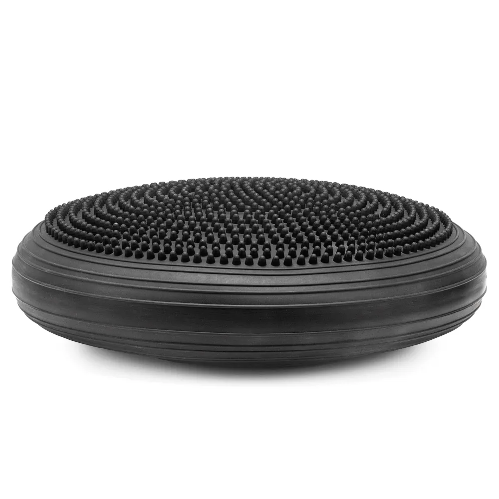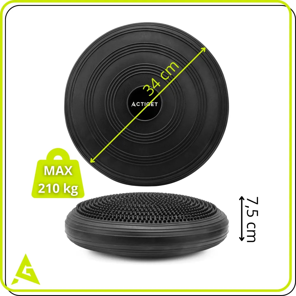 Balančný vankúš z odolného PVC s nosnosťou 210 kg a priemerom 34 cm. Obojstranné prevedenie – jedna strana s masážnymi výstupkami, druhá plochá. Protišmykový povrch pre stabilné použitie. Nastaviteľná tuhosť vďaka pumpičke v balení. Vhodný pre tréning rovnováhy, aktívne sedenie aj masáž chodidiel.