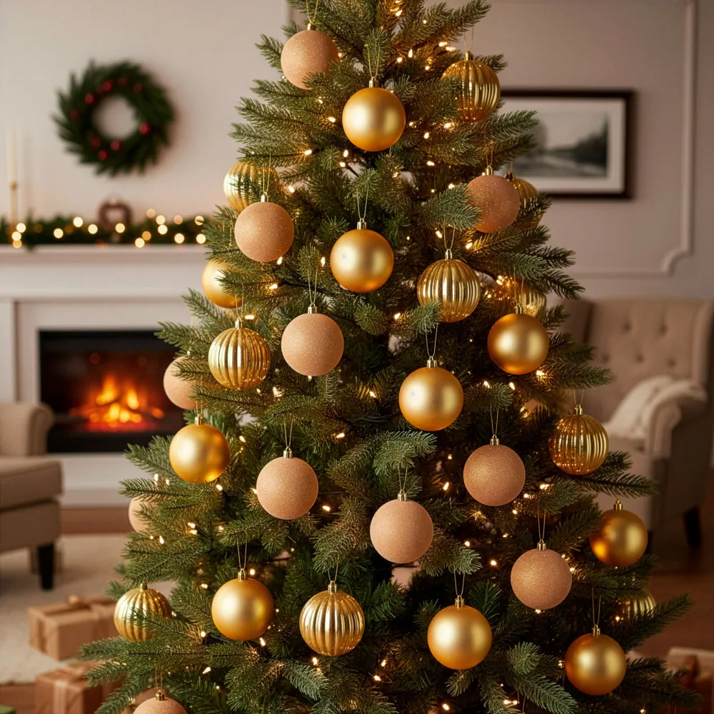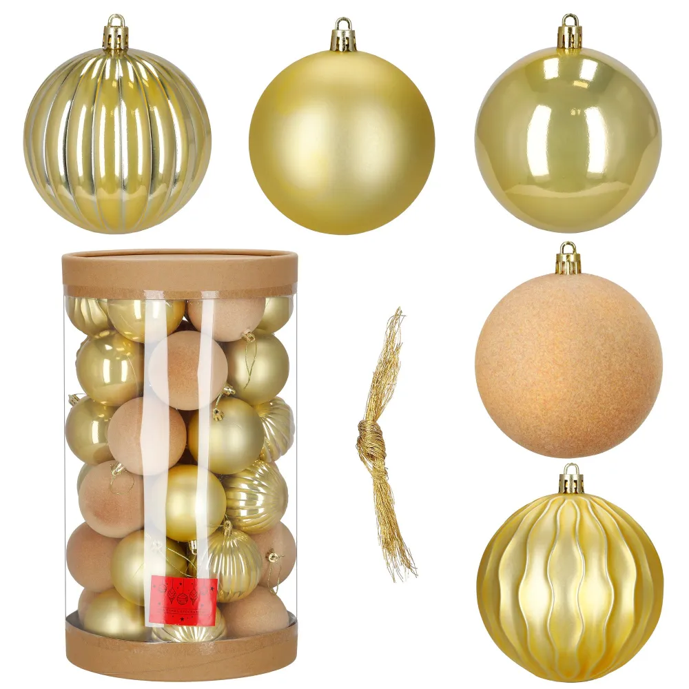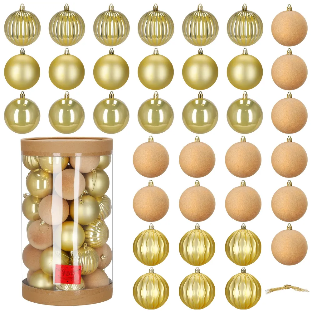 Vianočné banky zlatej mix – 8 cm súprava 36 ks prinášajú harmonickú kombináciu matných, lesklých, dekoratívne tvarovaných a tiež zamatových ozdôb, ktoré dodajú vianočnému stromčeku i celej výzdobe výrazne luxusnú atmosféru. Vďaka rozmanitým povrchom pôsobí dekorácia plasticky a elegantne. Ozdoby sú vyrobené z nerozbitného plastového materiálu , takže sú ľahké, bezpečné a vhodné aj pre rodiny s deťmi či domácimi miláčikmi. Každá guľa je navyše vybavená praktickým pútkom na zavesenie , ktoré uľahčuje umiestnenie na stromček alebo do aranžmánu.