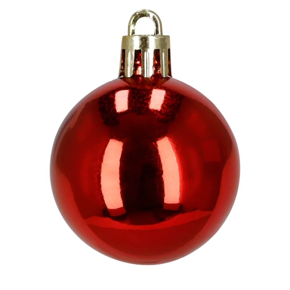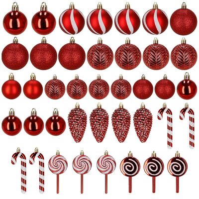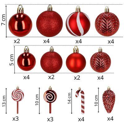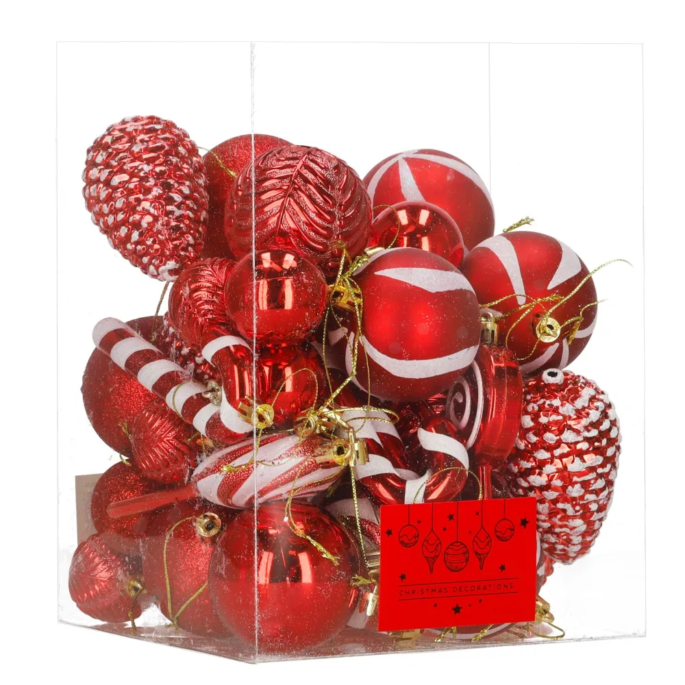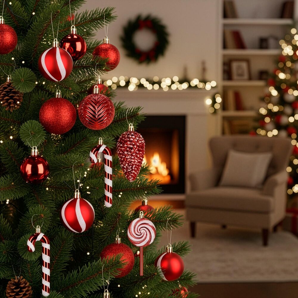 Súprava červených vianočných ozdôb v rôznych tvaroch a povrchových úpravách dodá výzdobe výrazný a hravý sviatočný vzhľad. Obsahuje ľahké, nerozbitné plastové gule, šišky aj ozdoby v tvare lízaniek a cukríkov, všetko s pútkami pre ľahké zavesenie. Vhodné na stromček aj ako dekorácia do interiéru či exteriéru. Priemery gulí: 4 cm, 5 cm a 6 cm.