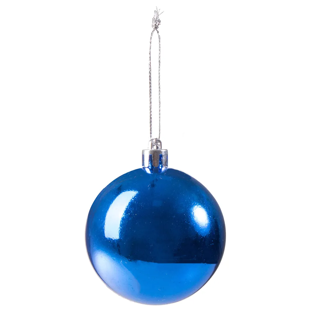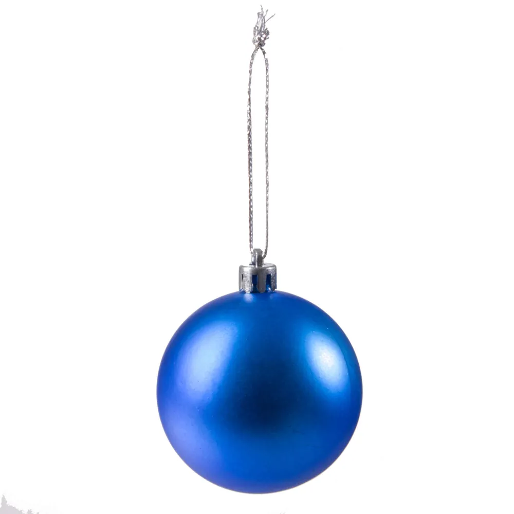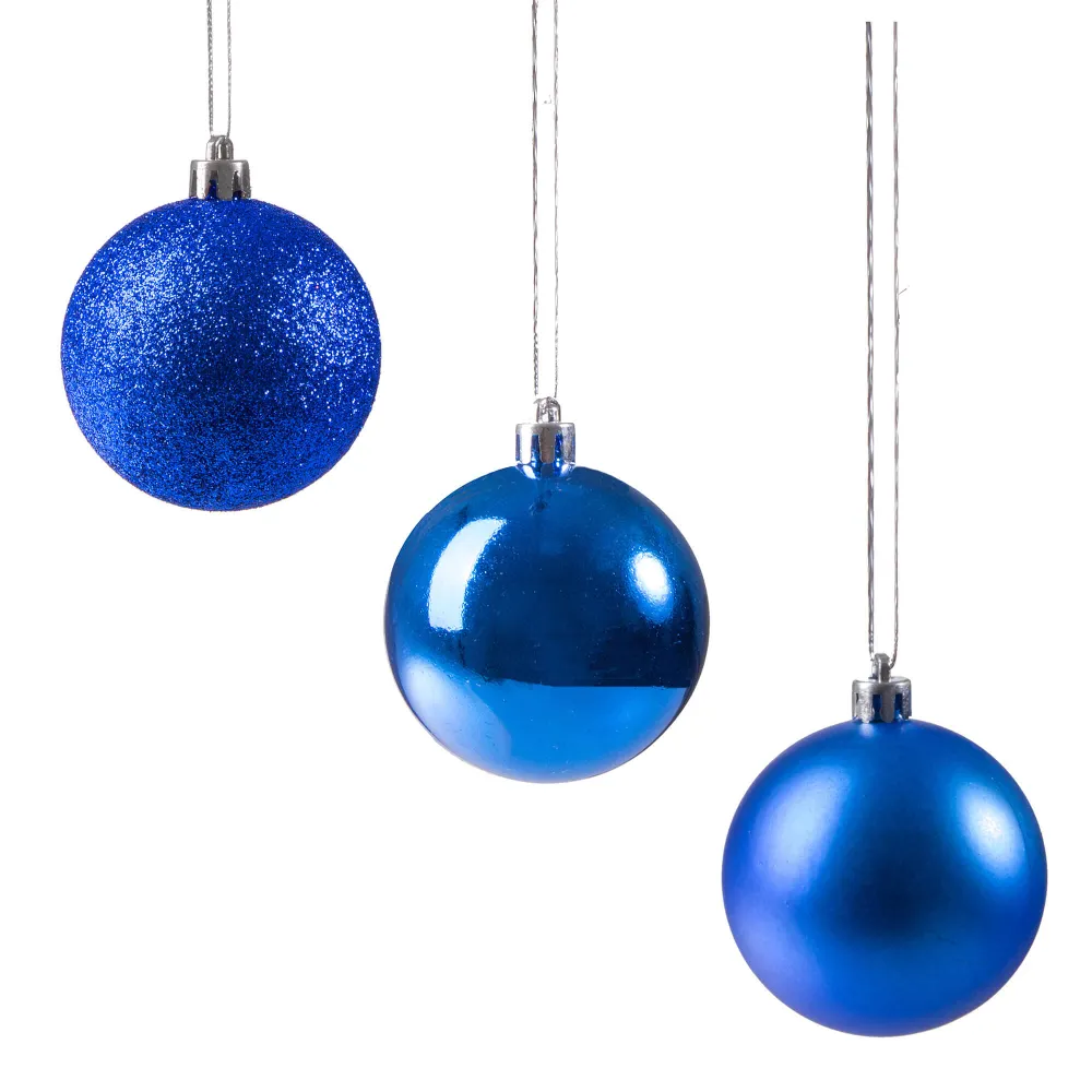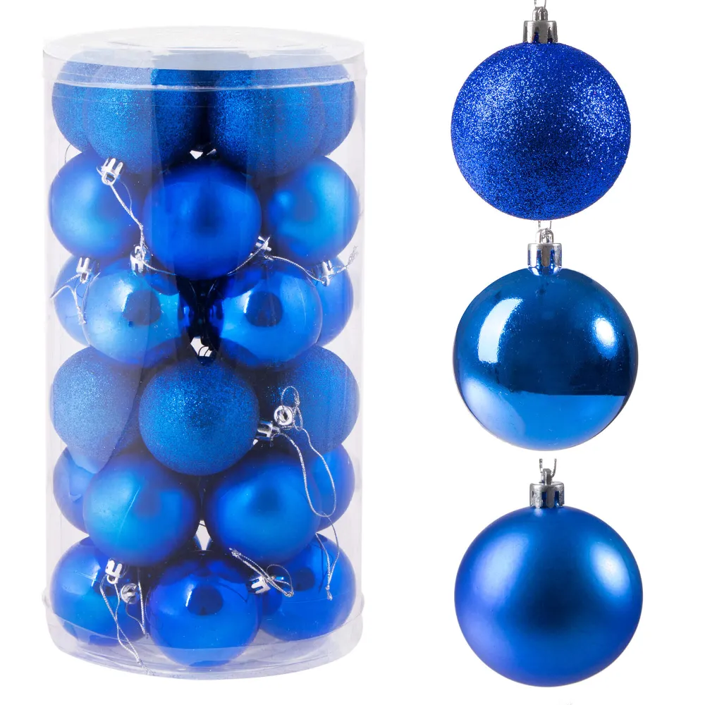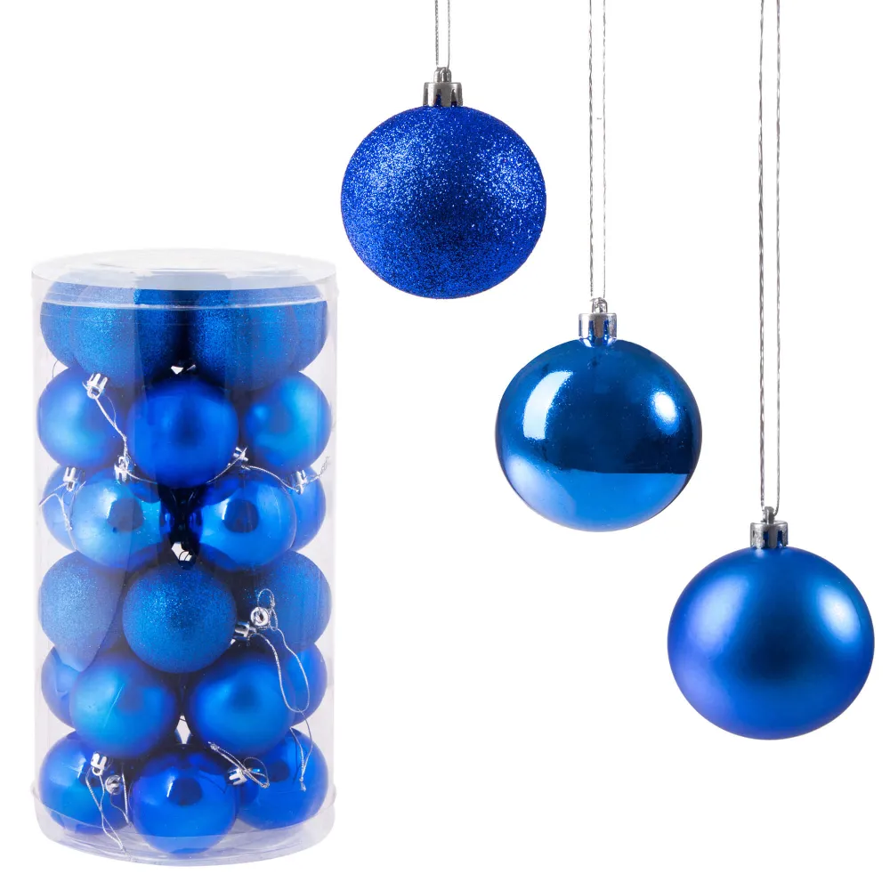 Sada 24 ks modrých baniek na stromček s tromi rôznymi vzormi. Priemer banky je 6 cm. Pútko na zavesenie, nerozbitný plastový materiál. Ideálne na výzdobu stromčeka alebo ako vianočné dekorácie. Zadarmo strieborné povrázky pre ľahké zavesenie.