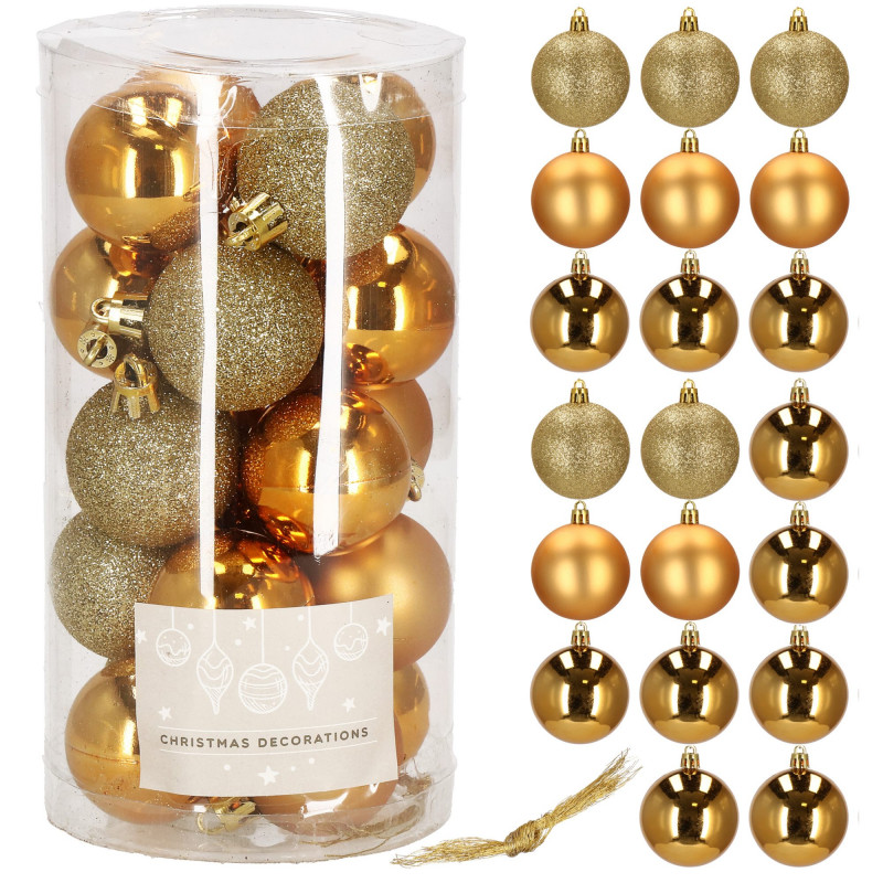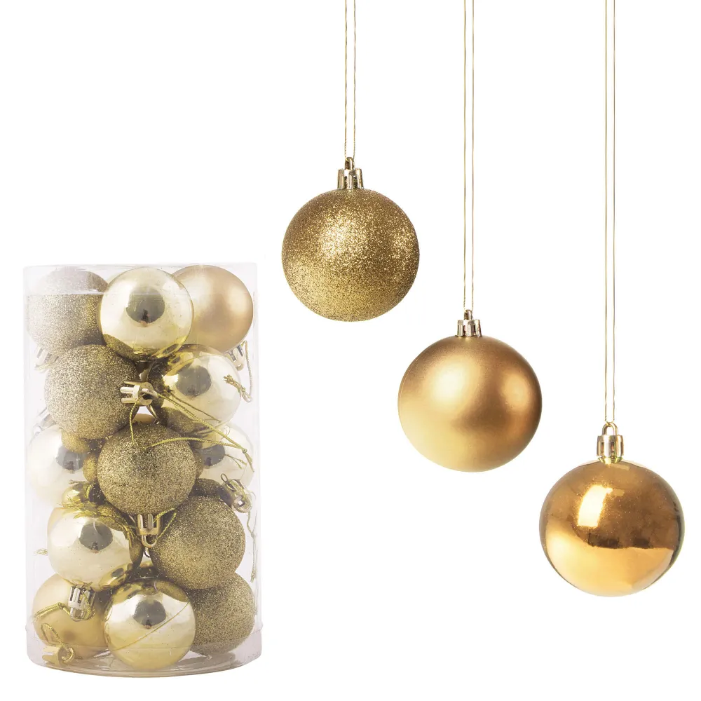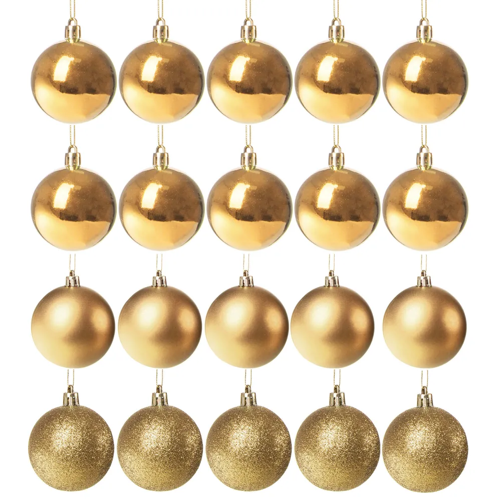 Súprava 20 ks zlatých baniek na stromček s tromi rôznymi vzormi. Priemer banky je 4 cm, pútko na zavesenie, nerozbitný plastový materiál. Ideálne na výzdobu stromčeka alebo ako vianočné dekorácie. Zadarmo strieborné povrázky pre ľahké zavesenie.