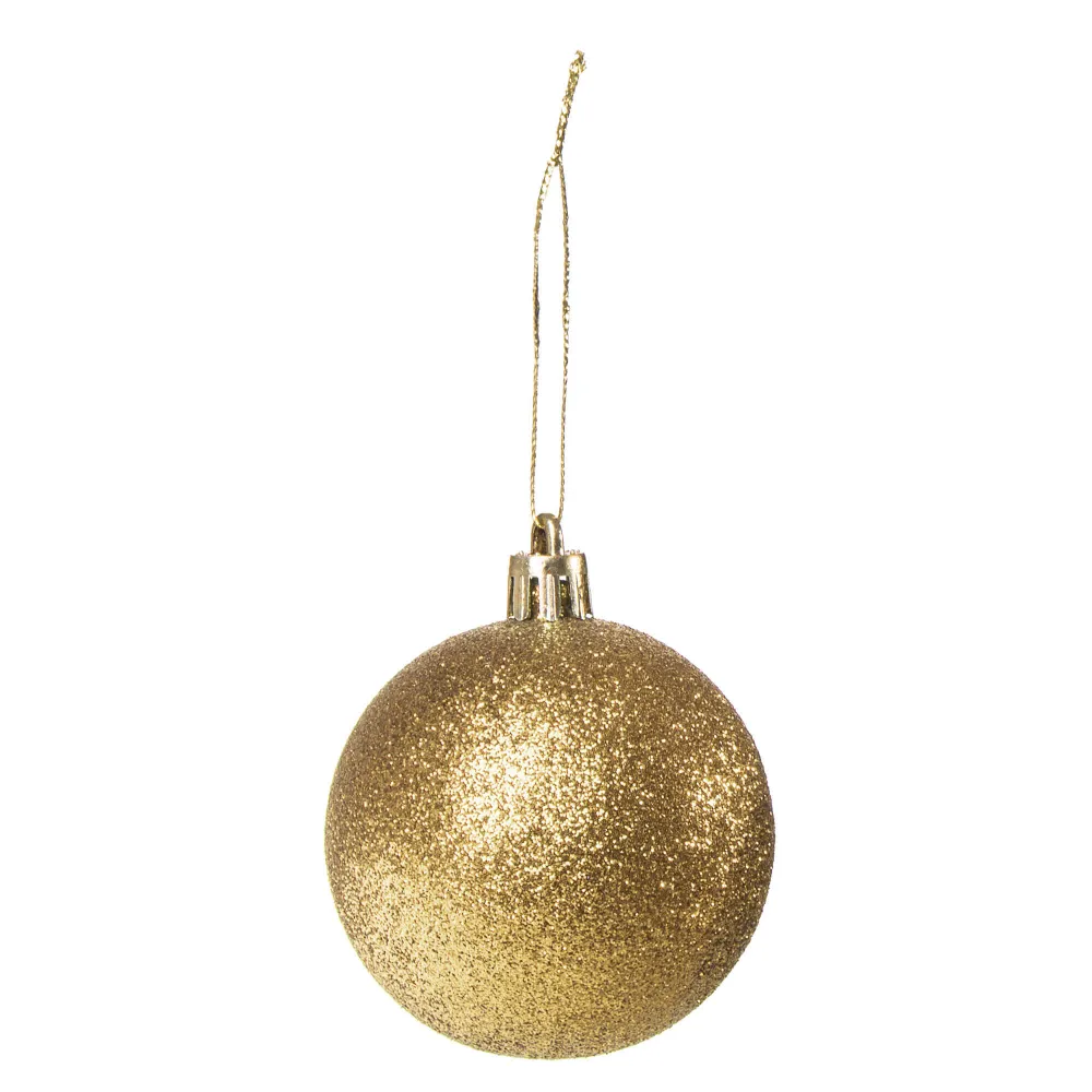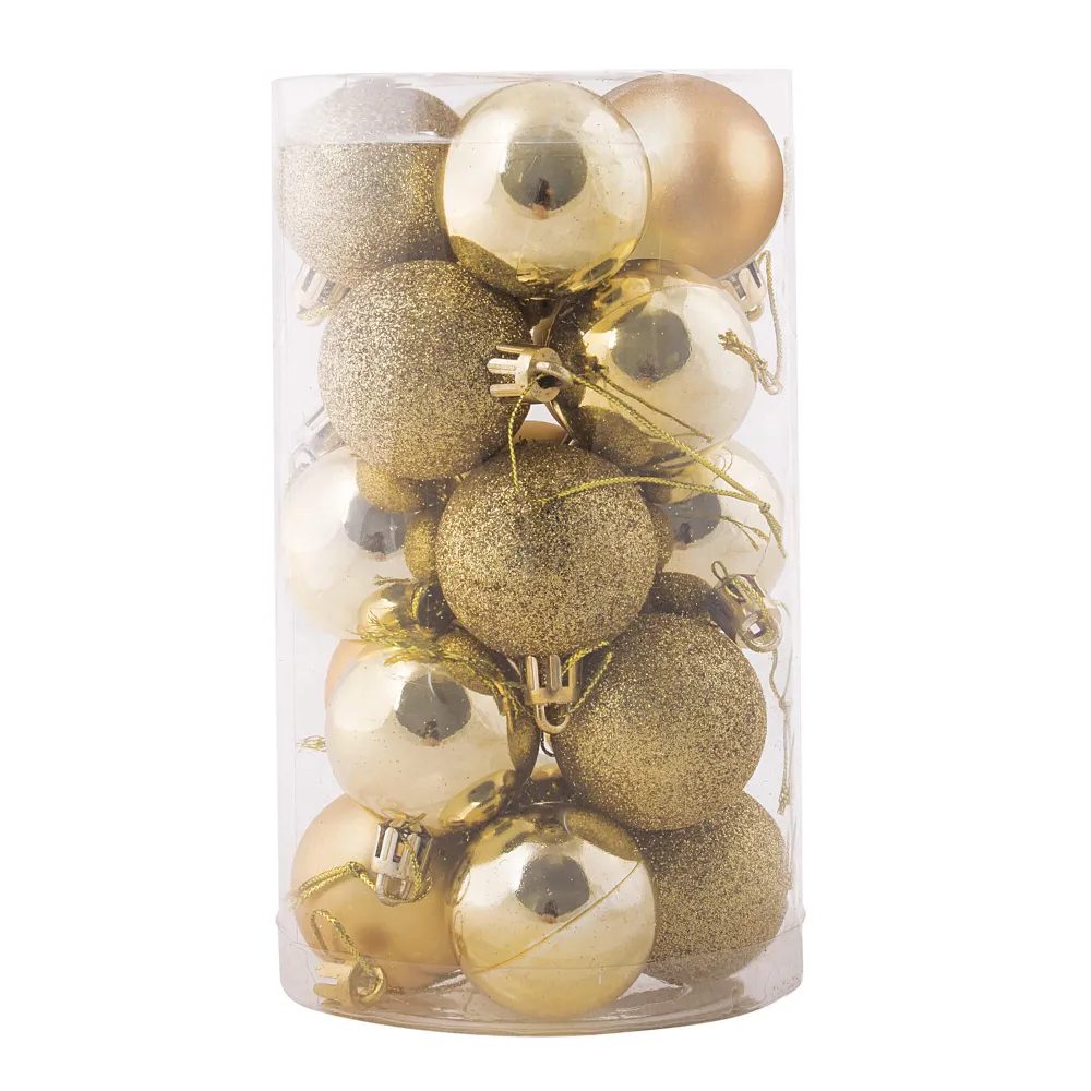 Súprava 20 ks zlatých baniek na stromček s tromi rôznymi vzormi. Priemer banky je 4 cm, pútko na zavesenie, nerozbitný plastový materiál. Ideálne na výzdobu stromčeka alebo ako vianočné dekorácie. Zadarmo strieborné povrázky pre ľahké zavesenie.