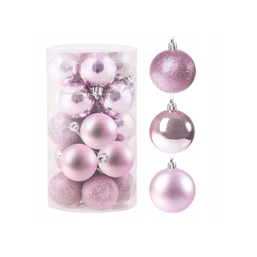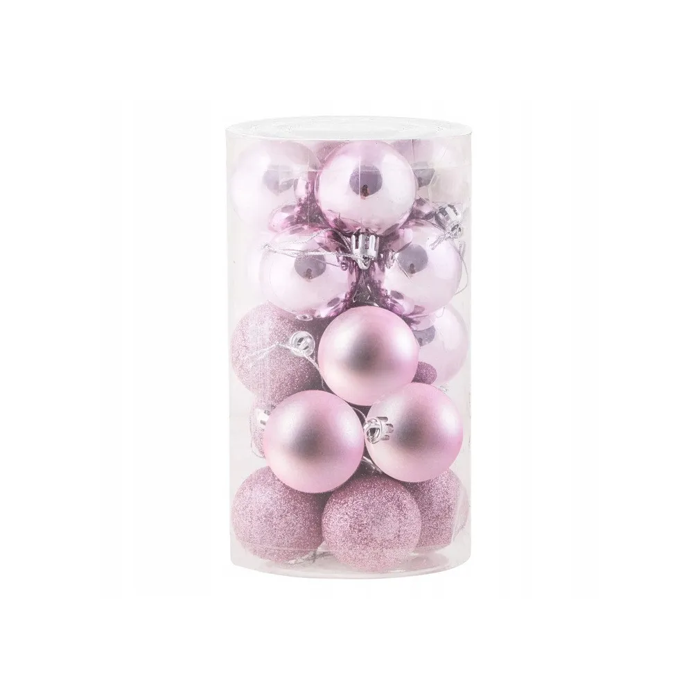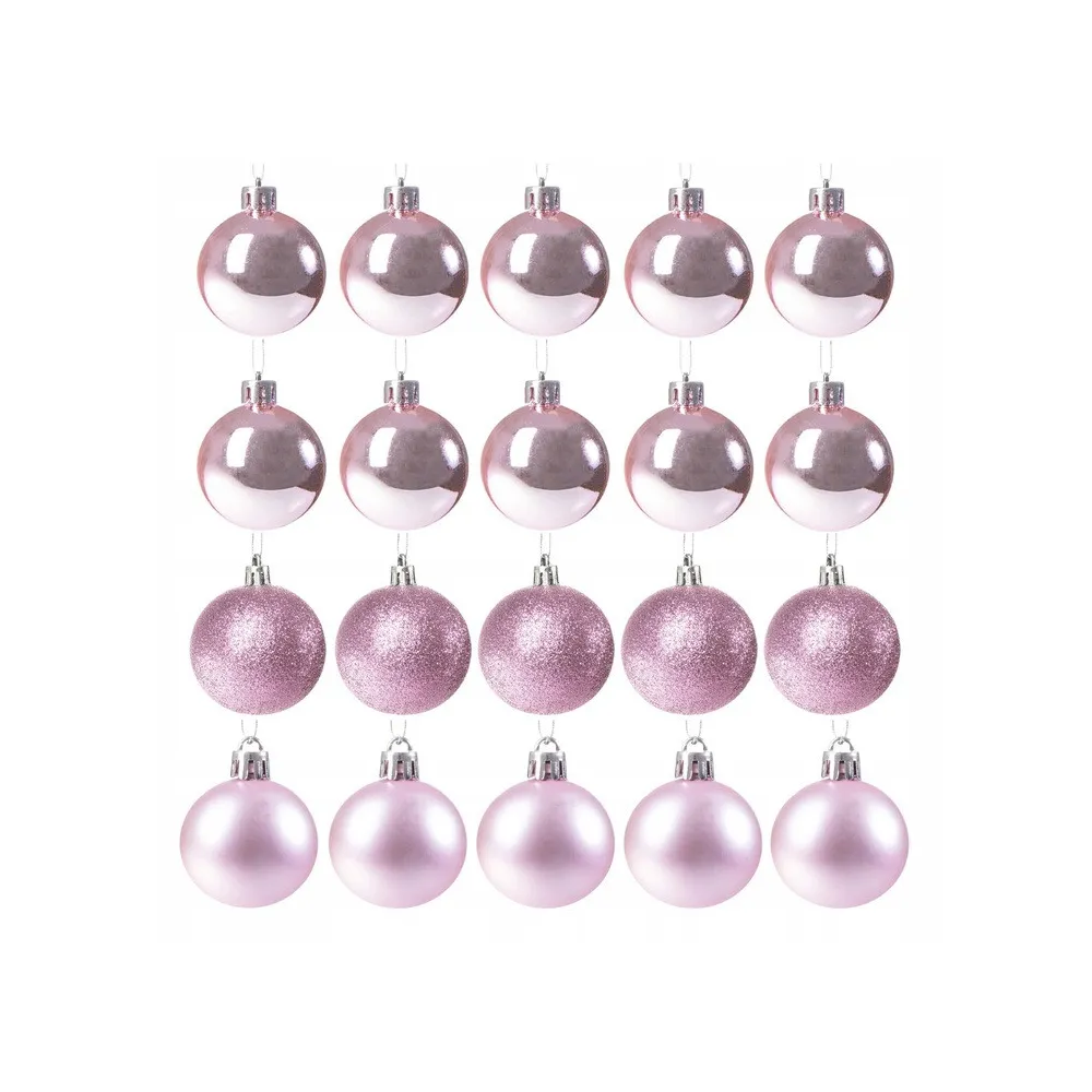 Sada 20 ks ružových baniek na stromček s tromi rôznymi vzormi. Priemer banky 4 cm, pútko na zavesenie, nerozbitný plastový materiál. Ideálne na výzdobu stromčeka alebo ako vianočné dekorácie. Zadarmo povrázky pre ľahké zavesenie.