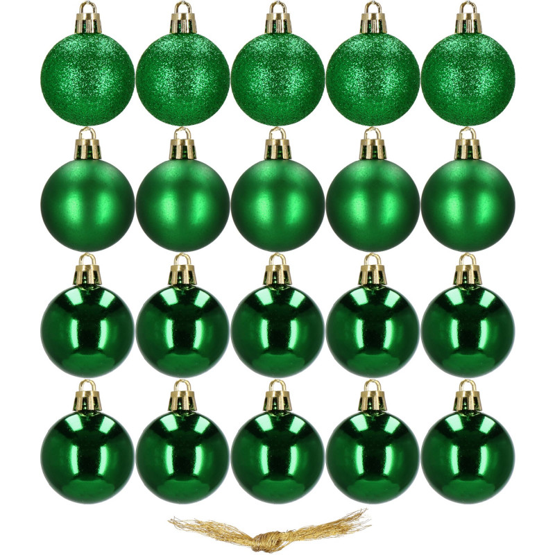 Sada 20 ks zelených baniek na stromček s tromi rôznymi vzormi. Priemer banky 4 cm, pútko na zavesenie, nerozbitný plastový materiál. Ideálne na výzdobu stromčeka alebo ako vianočné dekorácie. Zadarmo povrázky pre ľahké zavesenie.