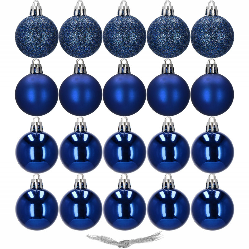 Sada 20 ks tmavomodrých baniek na stromček s tromi rôznymi vzormi. Priemer banky 4 cm, pútko na zavesenie, nerozbitný plastový materiál. Ideálne na výzdobu stromčeka alebo ako vianočné dekorácie. Zadarmo povrázky pre ľahké zavesenie.