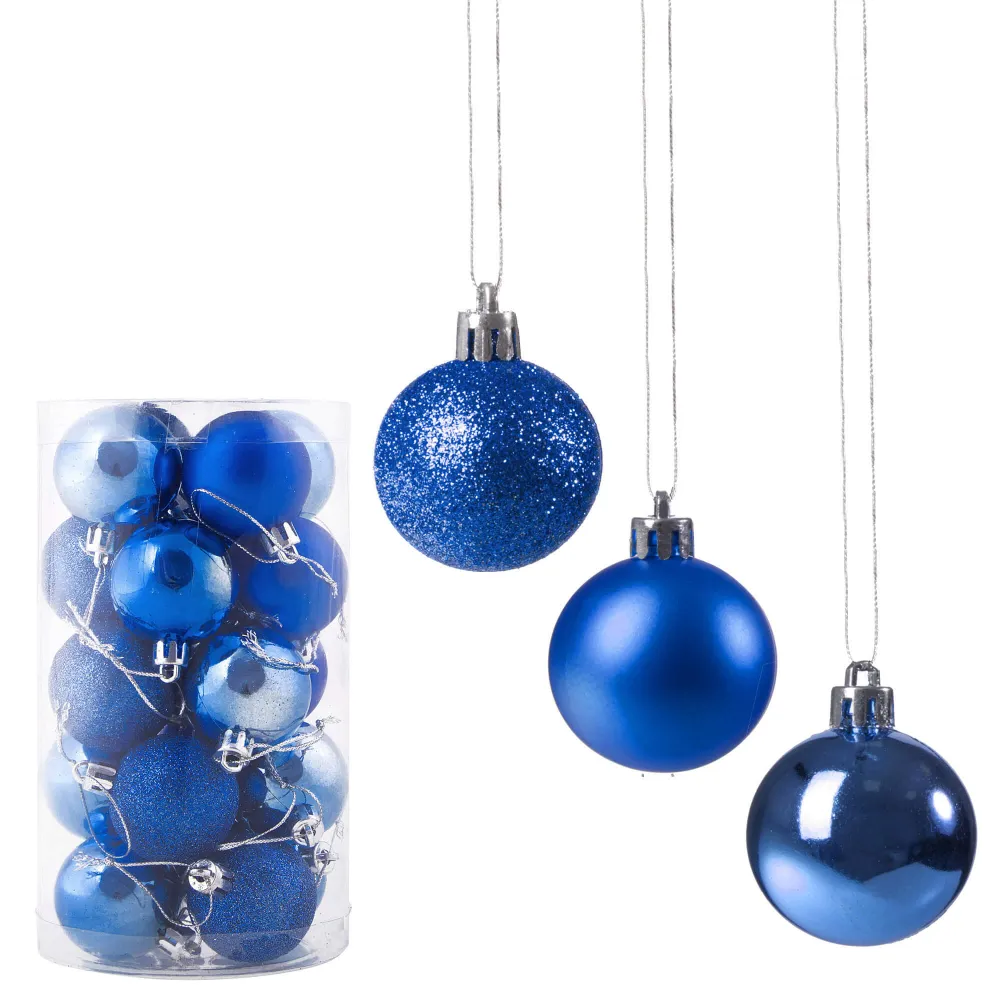 Sada 20 ks tmavomodrých baniek na stromček s tromi rôznymi vzormi. Priemer banky 4 cm, pútko na zavesenie, nerozbitný plastový materiál. Ideálne na výzdobu stromčeka alebo ako vianočné dekorácie. Zadarmo povrázky pre ľahké zavesenie.