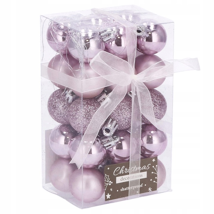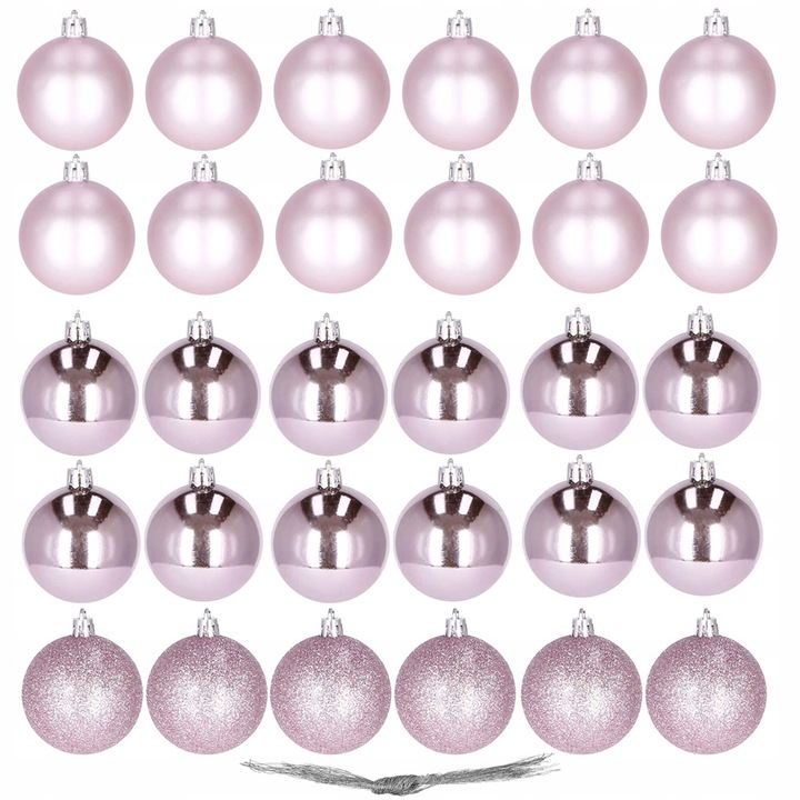 Sada 30 ks ružových baniek na stromček s tromi rôznymi vzormi. Priemer banky 3 cm, pútko na zavesenie, nerozbitný plastový materiál. Ideálne na výzdobu stromčeka alebo ako vianočné dekorácie. Zadarmo povrázky pre ľahké zavesenie.