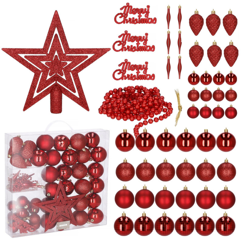 Luxusná 53 dielna sada vianočných ozdôb na stromček. Set tvorí 9 rôznych vzorov ozdôb červenej farby vrátane kúzelnej hviezdy na špičku stromčeka a 2m girlandy . Všetko z nerozbitného plastového materiálu. Ideálne na výzdobu stromčeka alebo ako vianočné dekorácie. Zadarmo strieborné povrázky pre ľahké zavesenie.
