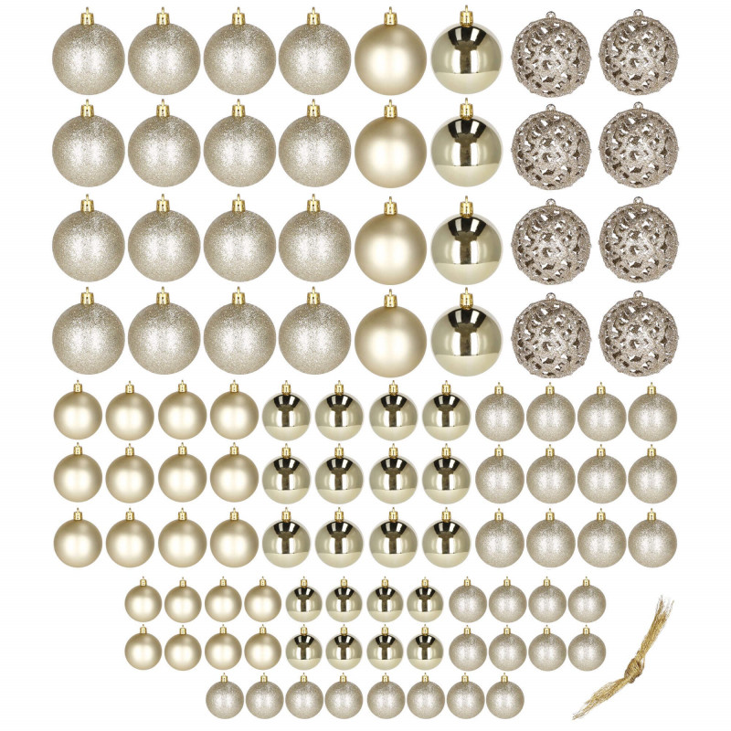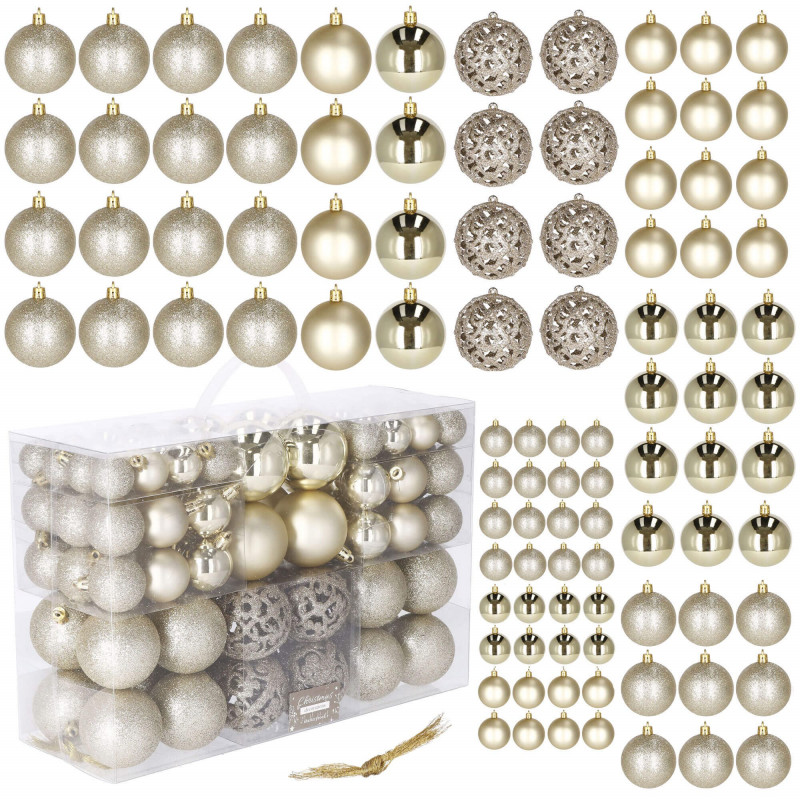 Luxusná 100 dielna sada vianočných ozdôb na stromček. Set tvorí 10 rôznych vzorov zlatej farby. Všetko z nerozbitného plastového materiálu. Ideálne na výzdobu stromčeka alebo ako vianočné dekorácie. Zadarmo zlaté povrázky pre ľahké zavesenie.