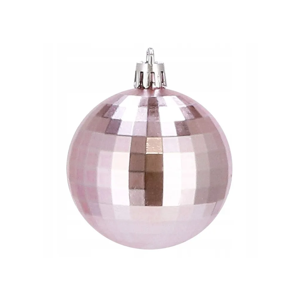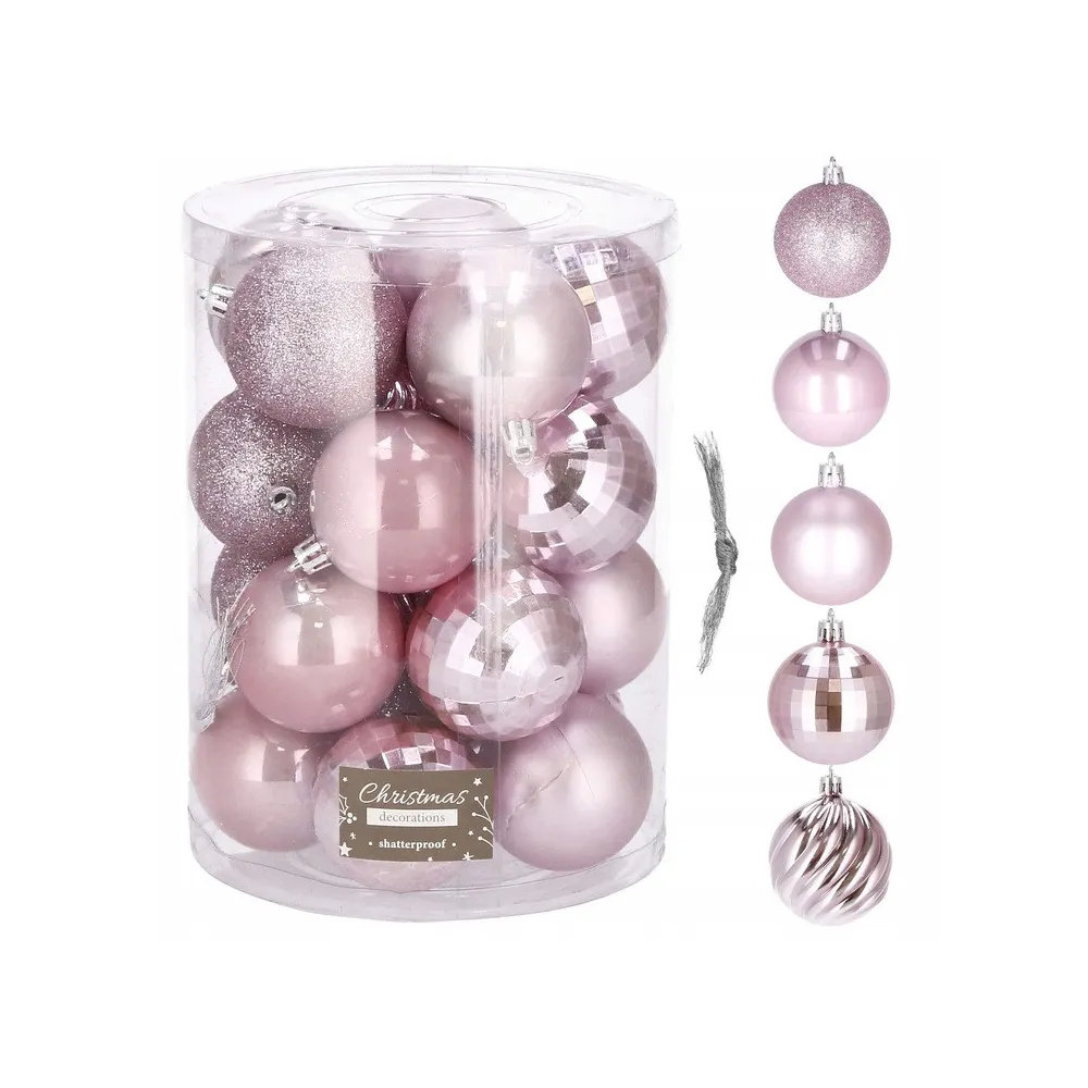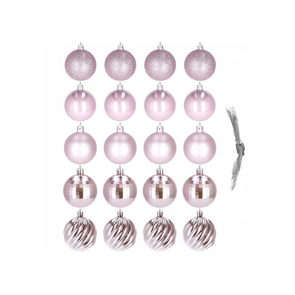Sada 20 ks ružových baniek na stromček s piatimi rôznymi vzormi. Priemer banky je 6 cm, pútko na zavesenie, nerozbitný plastový materiál. Ideálne na výzdobu stromčeka alebo ako vianočné dekorácie. Zadarmo strieborné povrázky pre ľahké zavesenie.