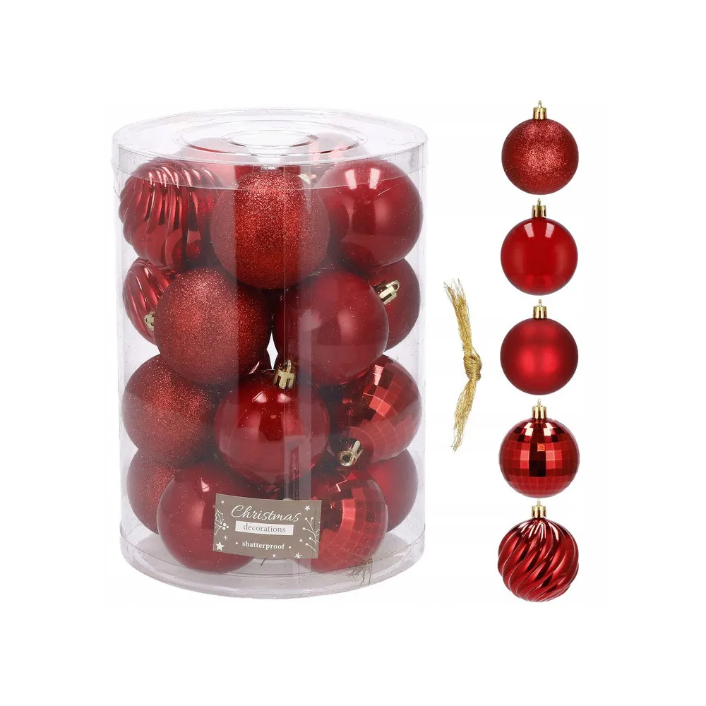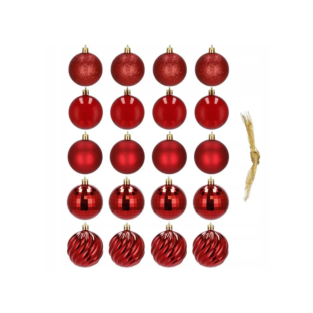 Sada 20 ks červených baniek na stromček s piatimi rôznymi vzormi. Priemer banky 6 cm, pútko na zavesenie, nerozbitný plastový materiál. Ideálne na výzdobu stromčeka alebo ako vianočné dekorácie. Zadarmo povrázky pre ľahké zavesenie.