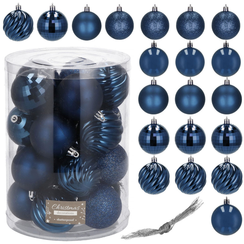 Sada 20 ks modrých baniek na stromček s piatimi rôznymi vzormi. Priemer banky je 6 cm. Pútko na zavesenie, nerozbitný plastový materiál. Ideálne na výzdobu stromčeka alebo ako vianočné dekorácie. Zadarmo povrázky pre ľahké zavesenie.