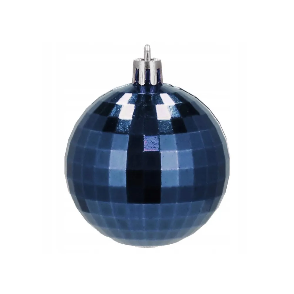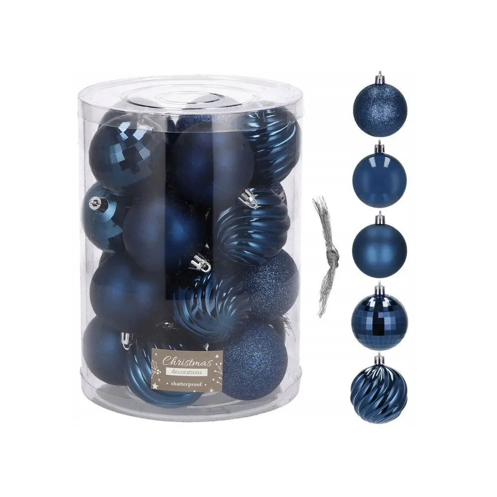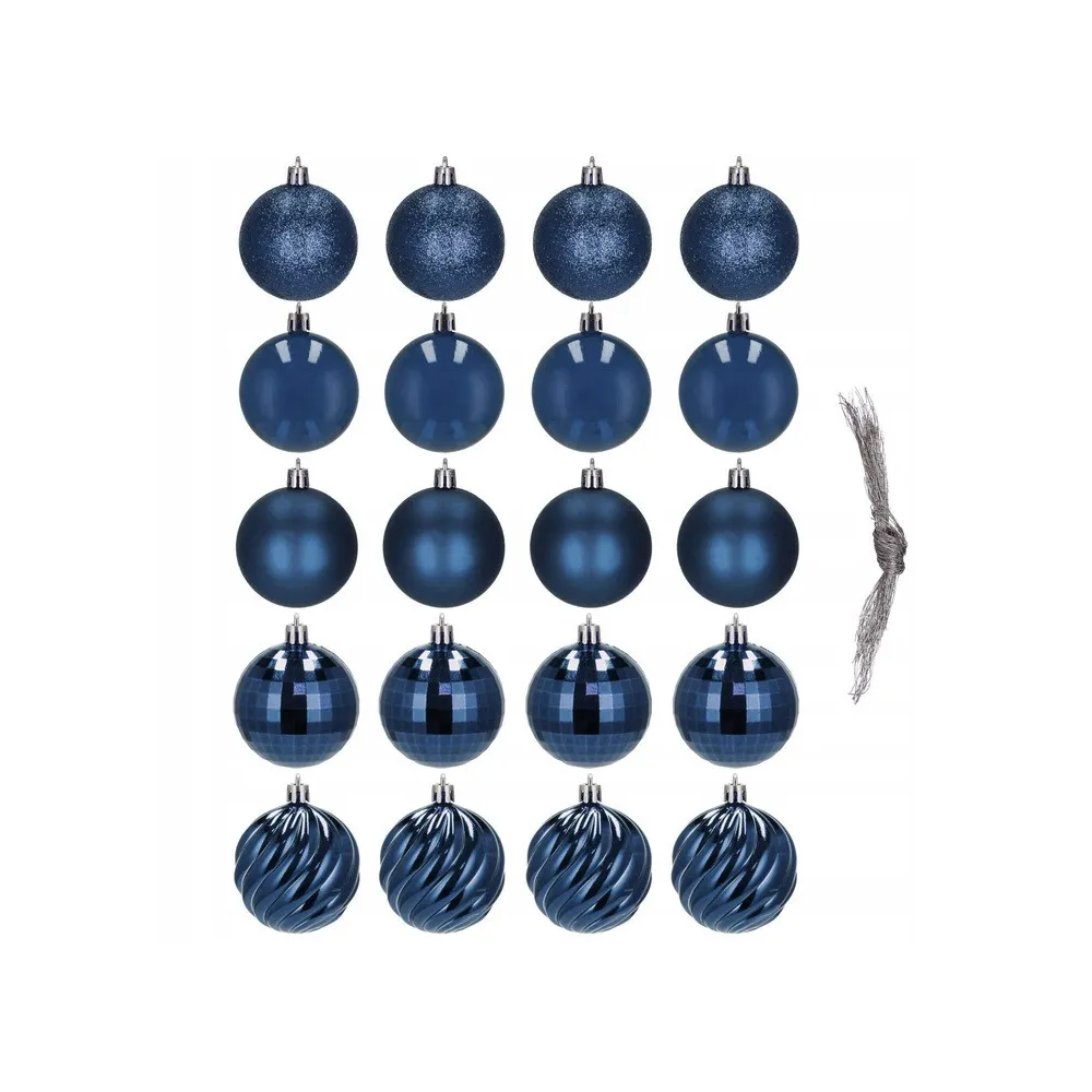 Sada 20 ks modrých baniek na stromček s piatimi rôznymi vzormi. Priemer banky je 6 cm. Pútko na zavesenie, nerozbitný plastový materiál. Ideálne na výzdobu stromčeka alebo ako vianočné dekorácie. Zadarmo povrázky pre ľahké zavesenie.
