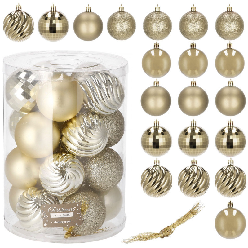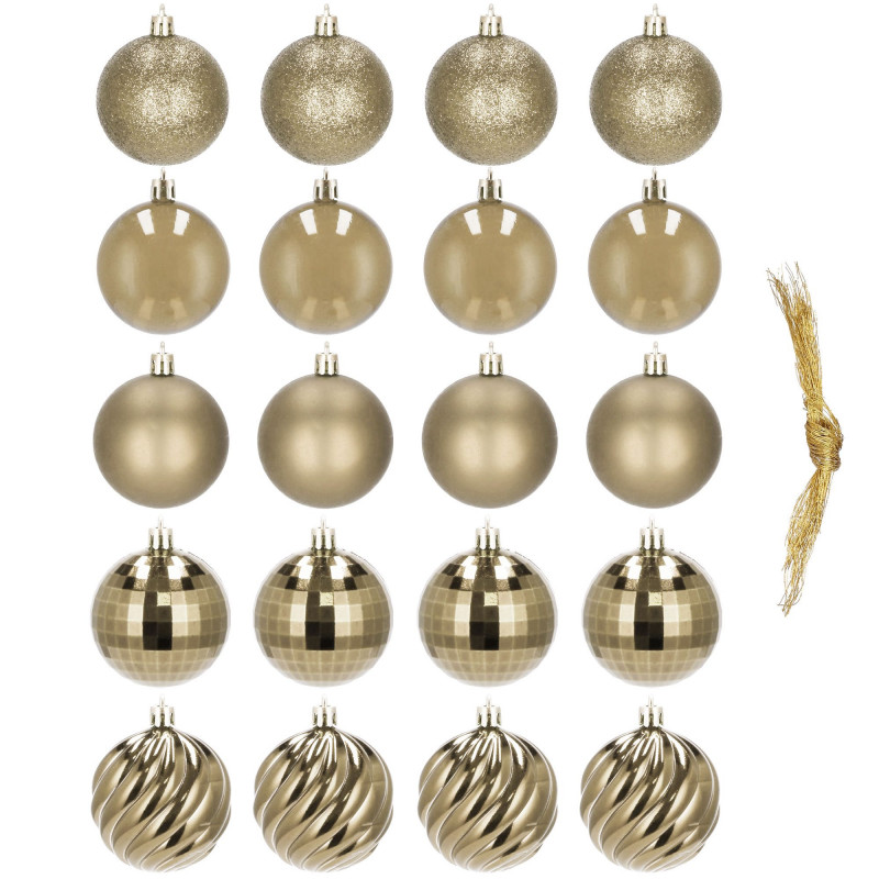 Sada 20 ks zlatých baniek na stromček s piatimi rôznymi vzormi. Priemer banky je 6 cm. Pútko na zavesenie, nerozbitný plastový materiál. Ideálne na výzdobu stromčeka alebo ako vianočné dekorácie. Zadarmo povrázky pre ľahké zavesenie.