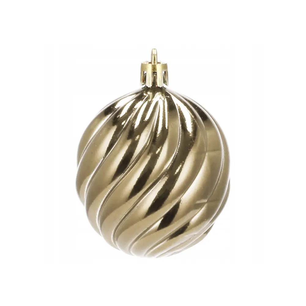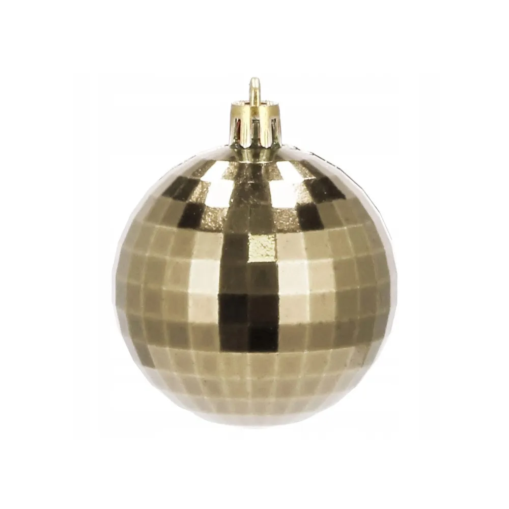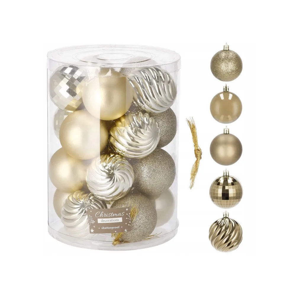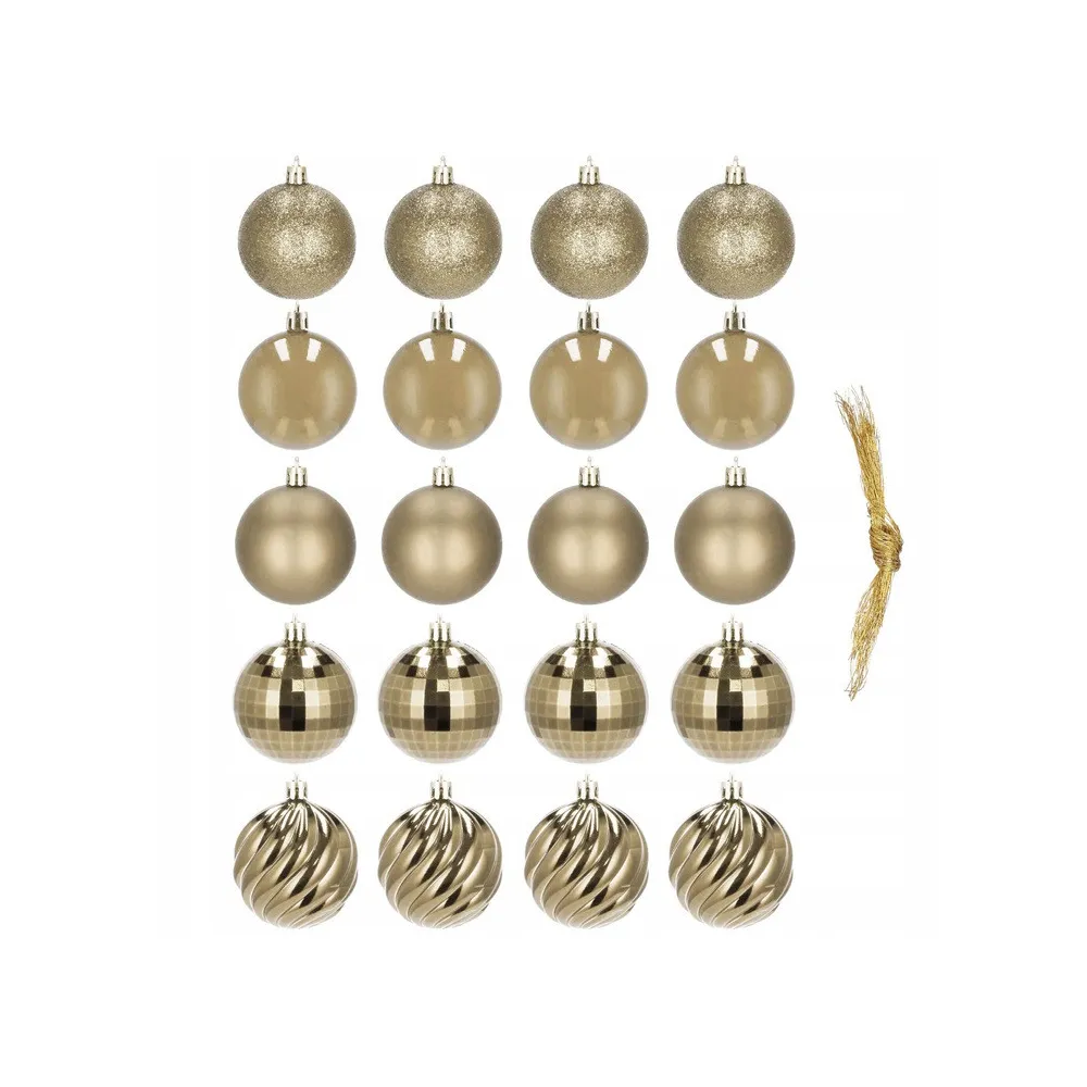 Sada 20 ks zlatých baniek na stromček s piatimi rôznymi vzormi. Priemer banky je 6 cm. Pútko na zavesenie, nerozbitný plastový materiál. Ideálne na výzdobu stromčeka alebo ako vianočné dekorácie. Zadarmo povrázky pre ľahké zavesenie.