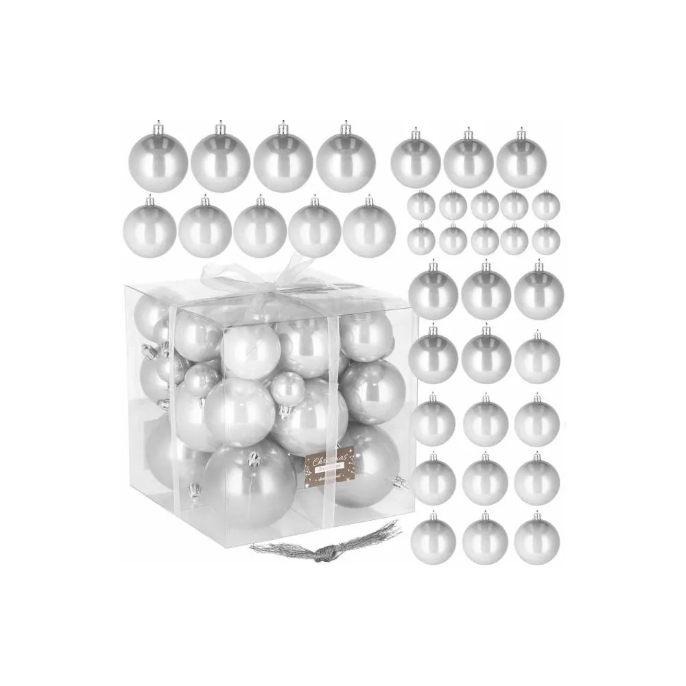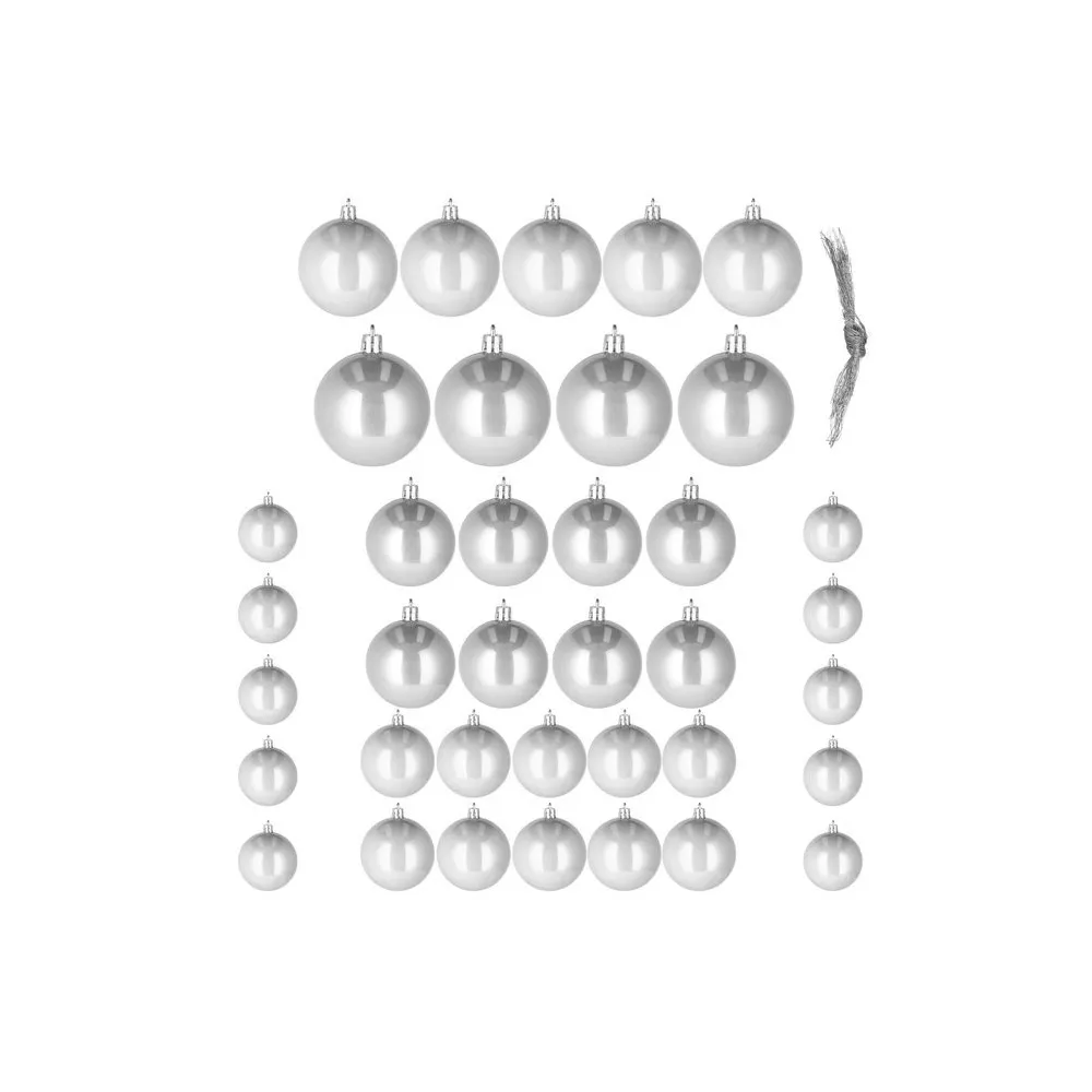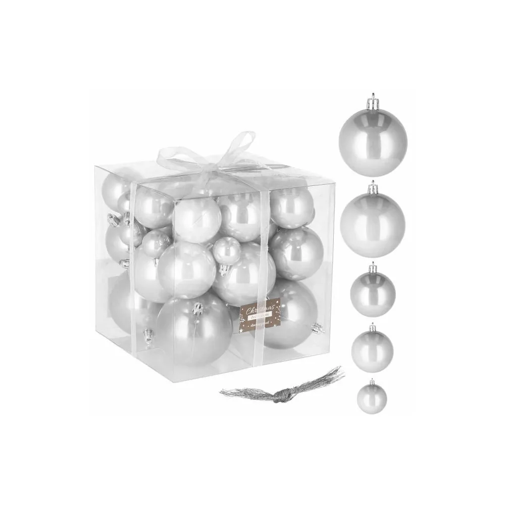 Sada 37 ks perleťovo strieborných baniek na stromček. 5 rôznych priemerov baniek, pútko na zavesenie, nerozbitný plastový materiál. Ideálne na výzdobu stromčeka alebo ako vianočné dekorácie. Zadarmo strieborné povrázky pre ľahké zavesenie.