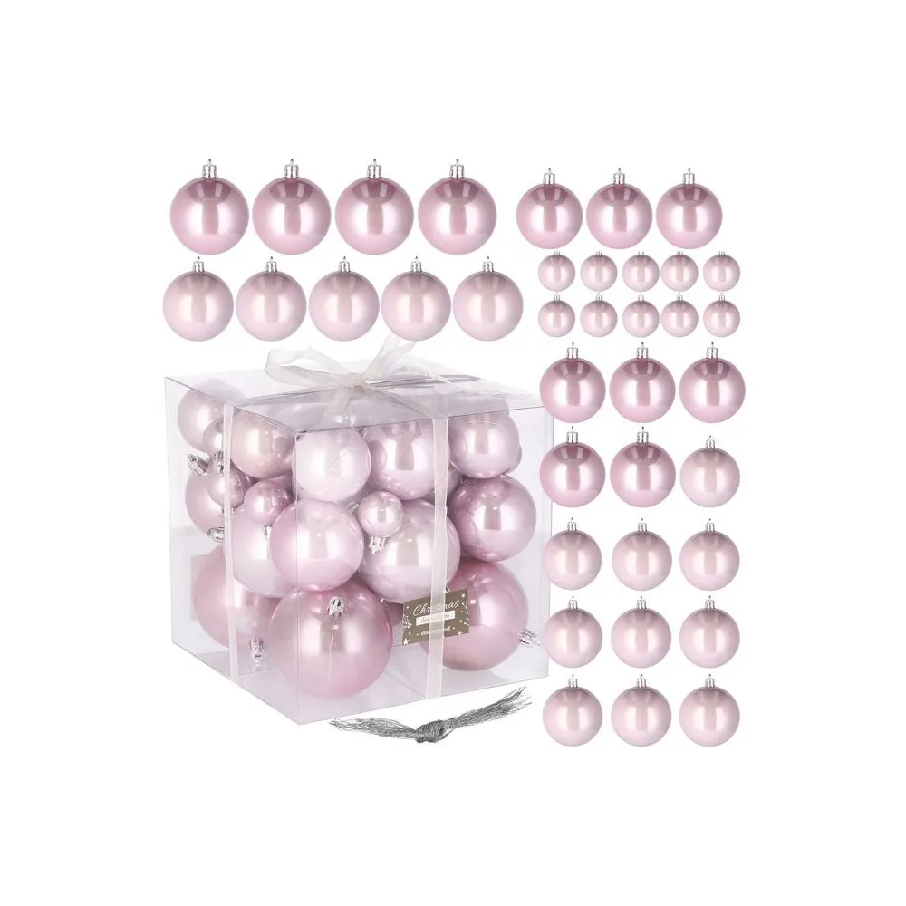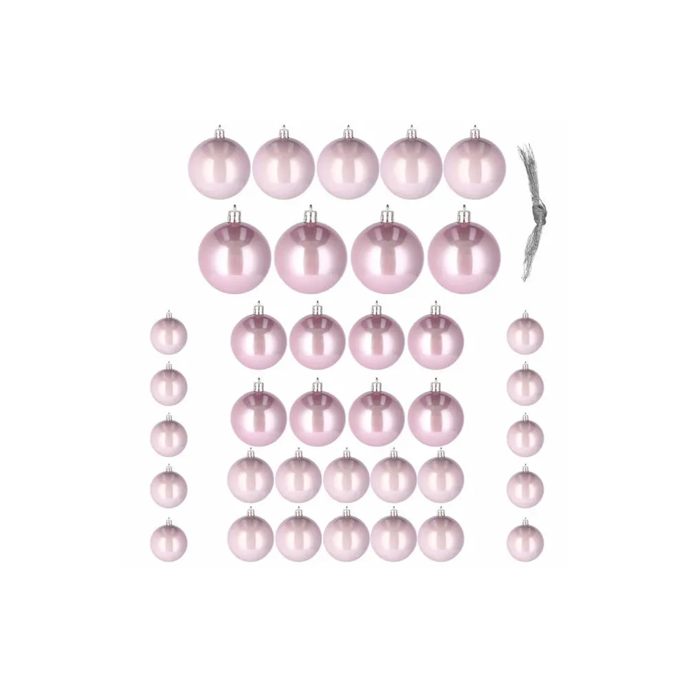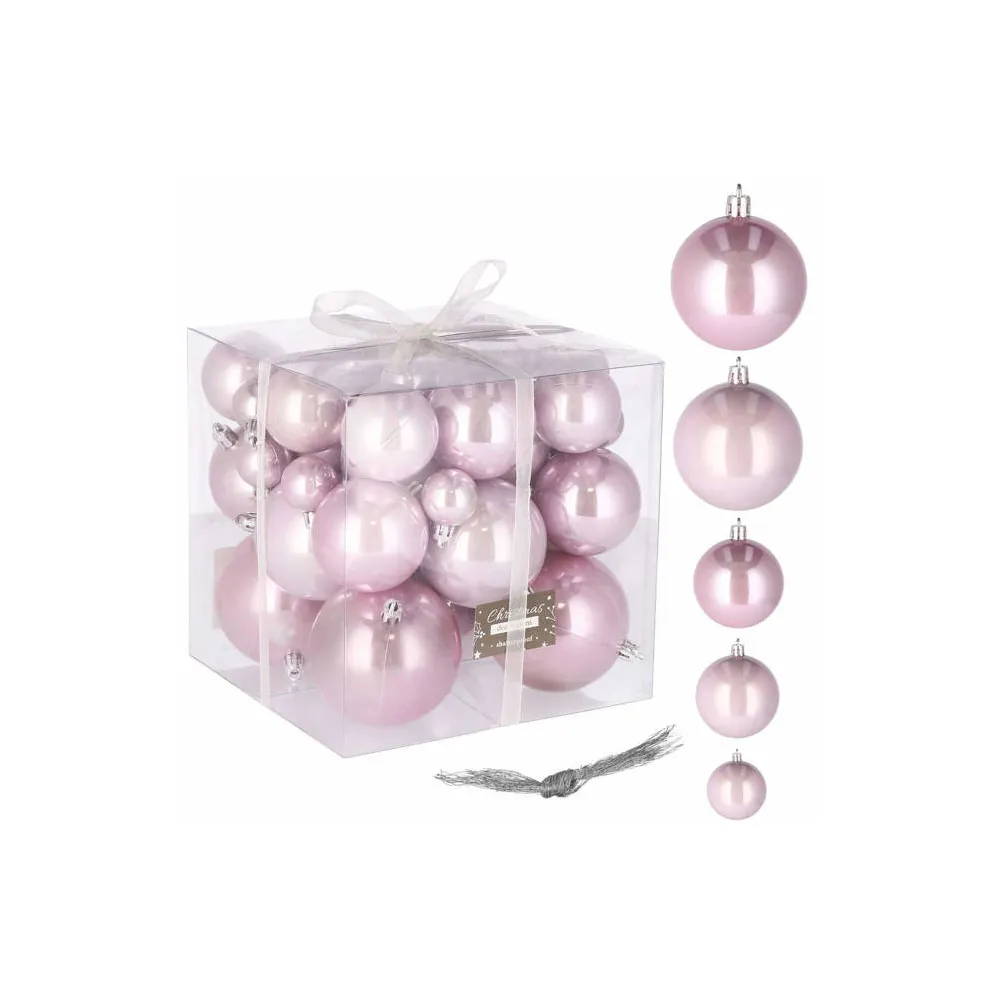 Sada 30 ks ružových baniek na stromček v rôznych veľkostiach. Priemer banky je 3/5/6/7/8 cm. Pútko na zavesenie, nerozbitný plastový materiál. Ideálne na výzdobu stromčeka alebo ako vianočné dekorácie. Zadarmo povrázky pre ľahké zavesenie.