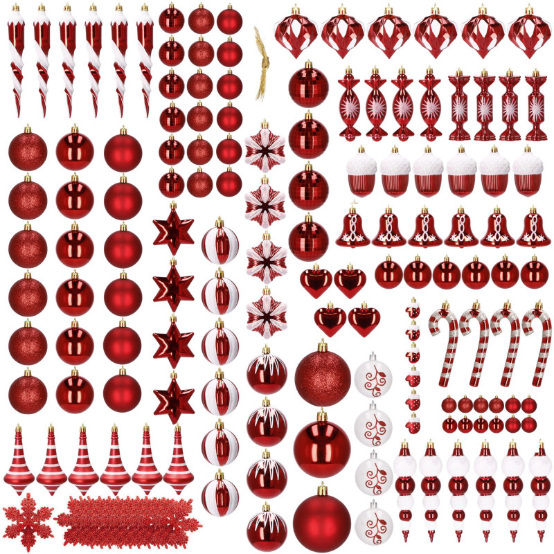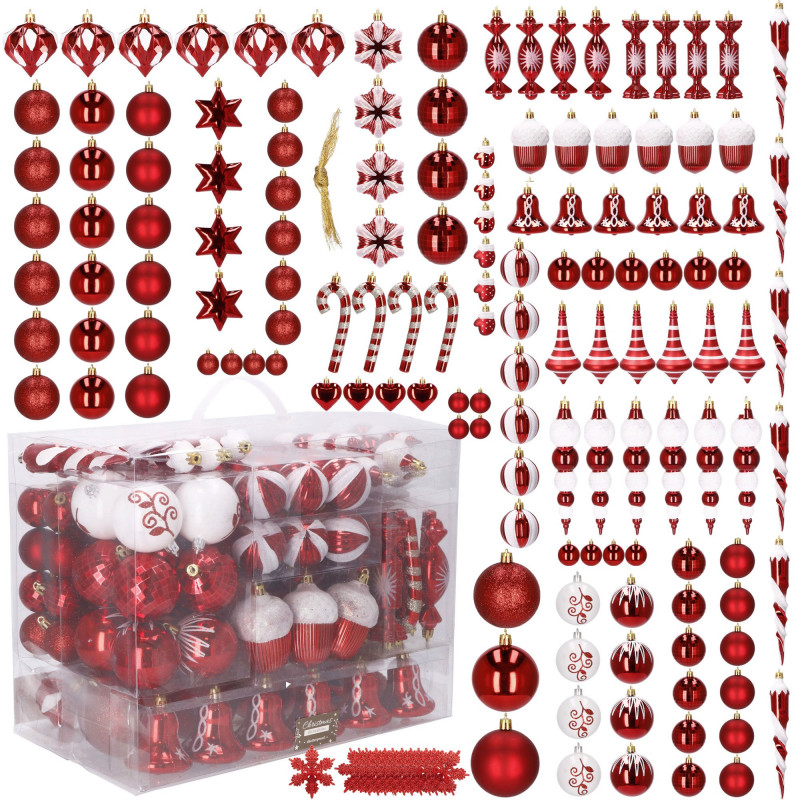 Nádherne zdobená 153 dielna sada vianočných ozdôb na stromček. Set tvorí 22 rôznych vzorov ozdôb červeno-bielej farby. Všetko z nerozbitného plastového materiálu. Ideálne na výzdobu stromčeka alebo ako vianočné dekorácie. Zadarmo povrázky pre ľahké zavesenie.