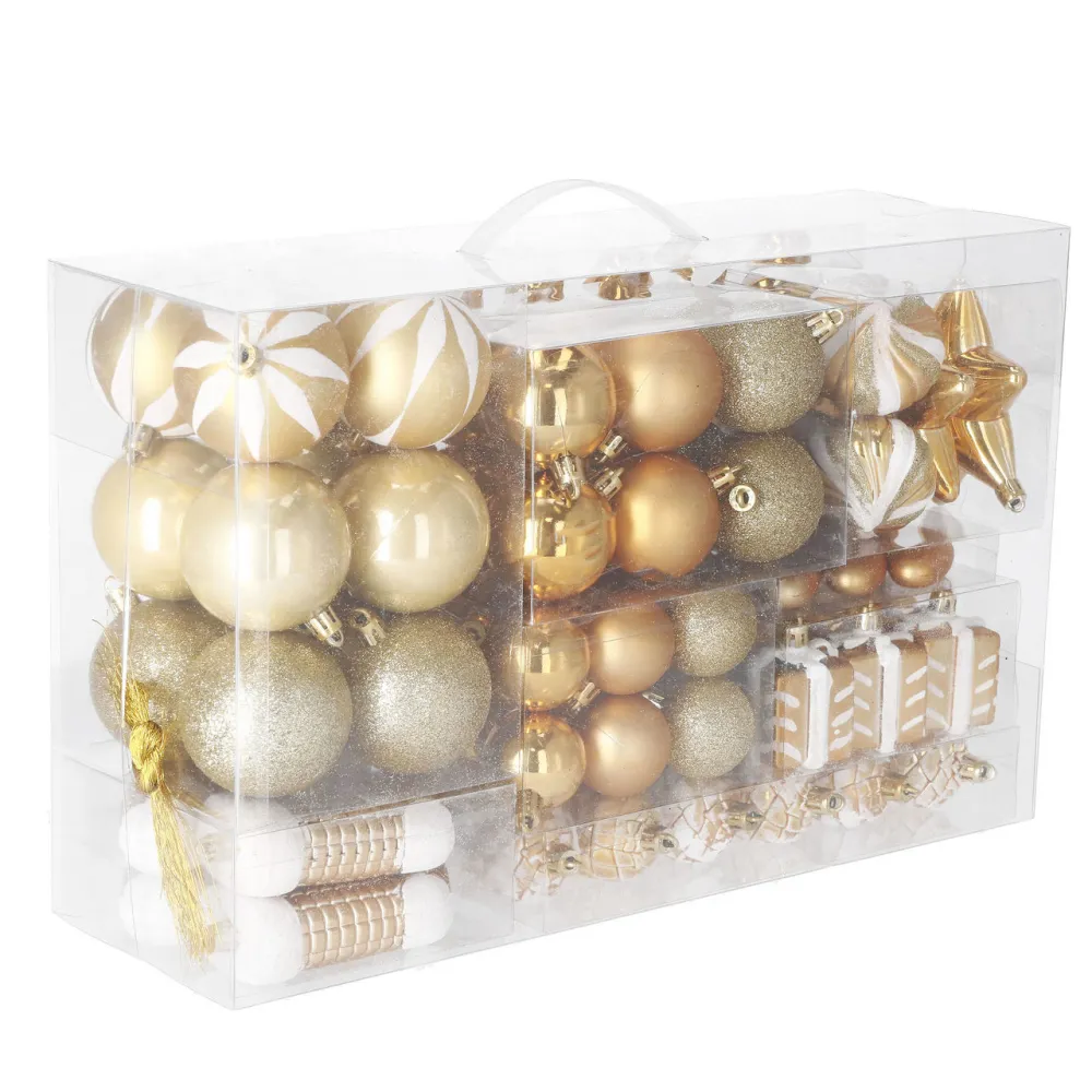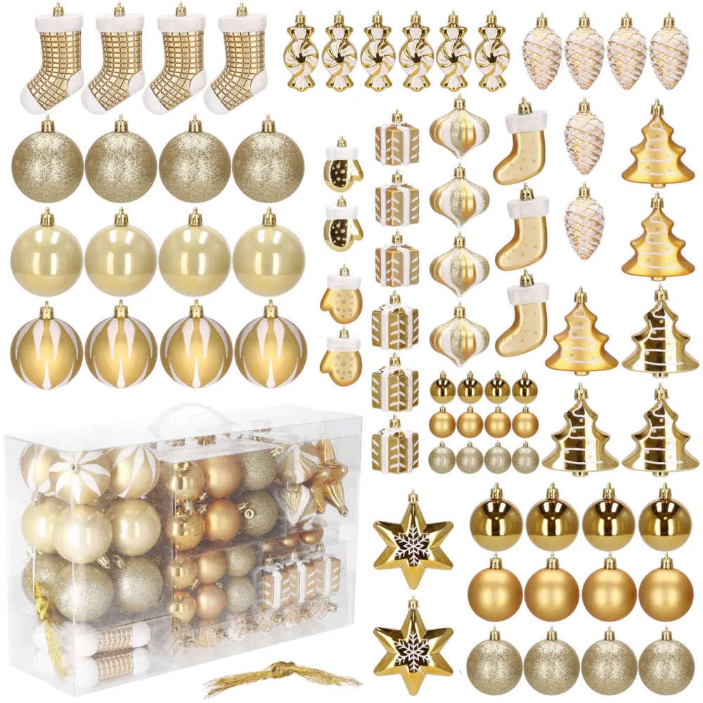 Luxusná 77 dielna sada vianočných ozdôb na stromček. Set tvorí 21 rôznych vzorov zlatej farby. Všetko z nerozbitného plastového materiálu. Ideálne na výzdobu stromčeka alebo ako vianočné dekorácie. Zadarmo zlaté povrázky pre ľahké zavesenie.