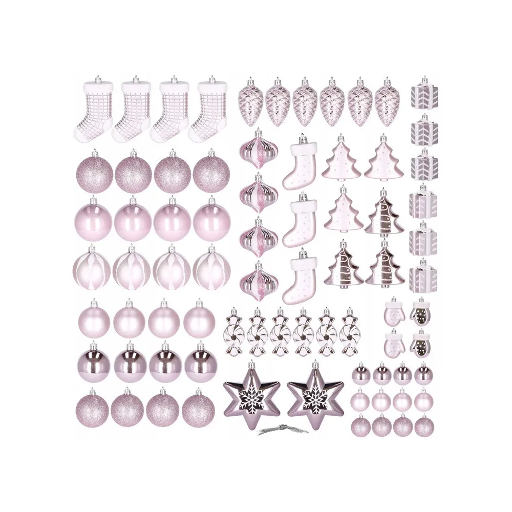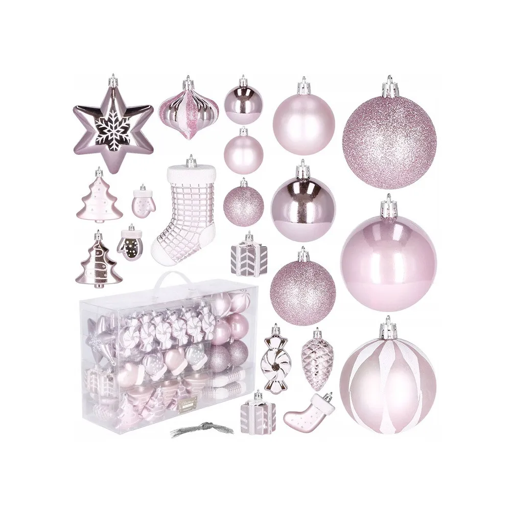Luxusná 77 dielna sada vianočných ozdôb na stromček. Set tvorí 21 rôznych vzorov ozdôb svetlo ružovej farby. Všetko z nerozbitného plastového materiálu. Ideálne na výzdobu stromčeka alebo ako vianočné dekorácie. Zadarmo strieborné povrázky pre ľahké zavesenie.