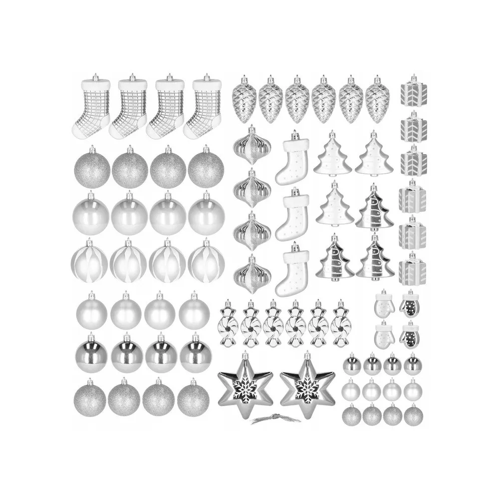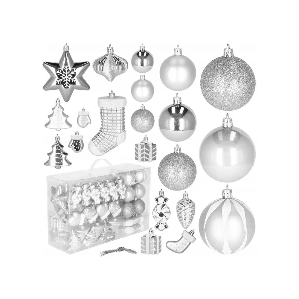 Luxusná 77 dielna sada vianočných ozdôb na stromček. Set tvorí 21 rôznych vzorov striebornej farby. Všetko z nerozbitného plastového materiálu. Ideálne na výzdobu stromčeka alebo ako vianočné dekorácie. Zadarmo zlaté povrázky pre ľahké zavesenie.