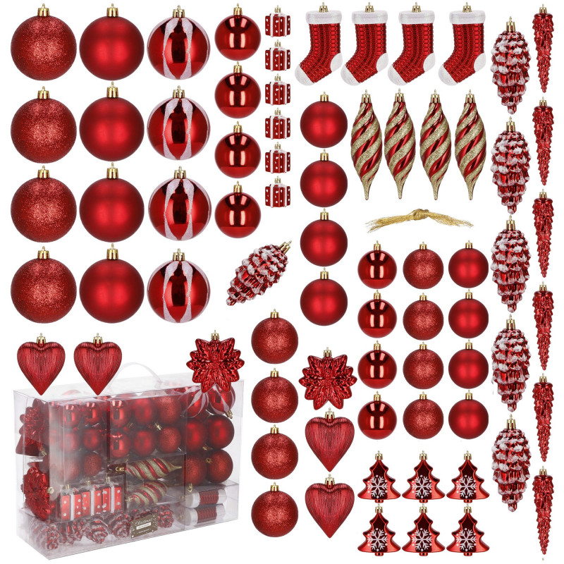Luxusná 72 dielna sada vianočných ozdôb na stromček. Set tvorí 10 rôznych vzorov ozdôb červenej farby. Všetko z nerozbitného plastového materiálu. Ideálne na výzdobu stromčeka alebo ako vianočné dekorácie. Zadarmo strieborné povrázky pre ľahké zavesenie.