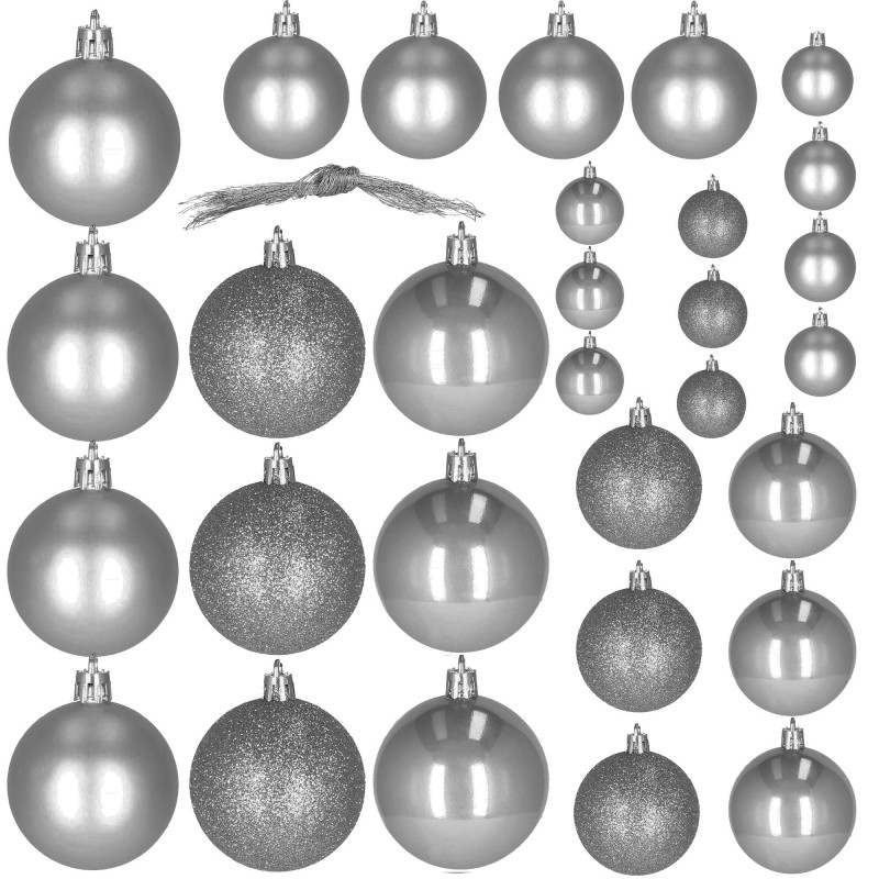 Sada 30 ks šedých baniek na stromček s tromi rôznymi vzormi. Priemery baniek sú 4 cm, 5 cm a 6 cm. Pútko na zavesenie, nerozbitný plastový materiál. Ideálne na výzdobu stromčeka alebo ako vianočné dekorácie. Zadarmo strieborné povrázky pre ľahké zavesenie.
