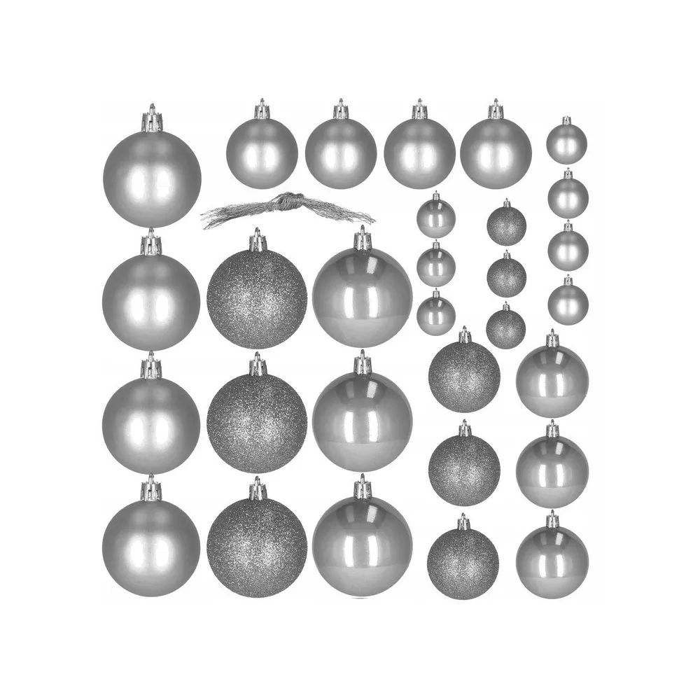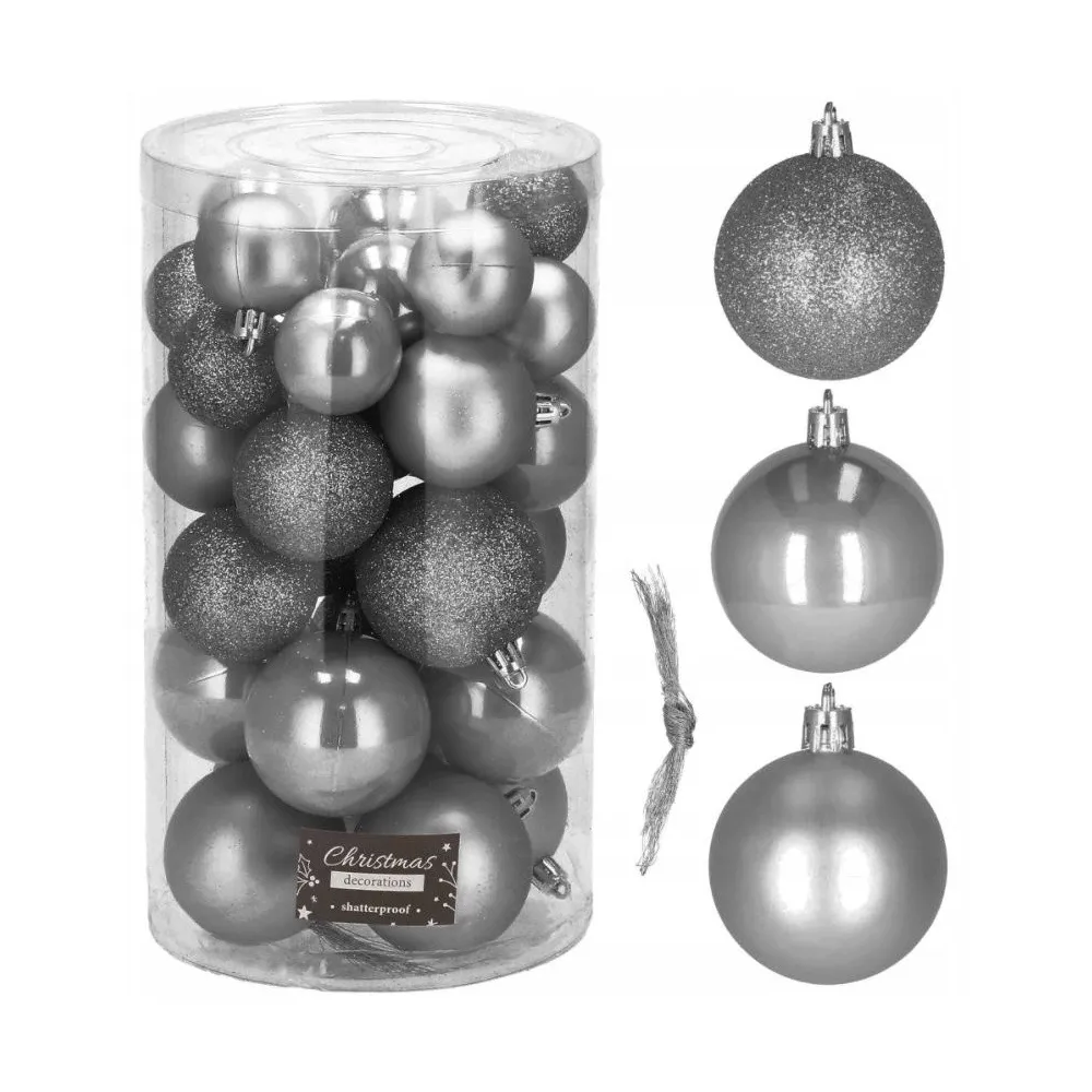 Sada 30 ks šedých baniek na stromček s tromi rôznymi vzormi. Priemery baniek sú 4 cm, 5 cm a 6 cm. Pútko na zavesenie, nerozbitný plastový materiál. Ideálne na výzdobu stromčeka alebo ako vianočné dekorácie. Zadarmo strieborné povrázky pre ľahké zavesenie.