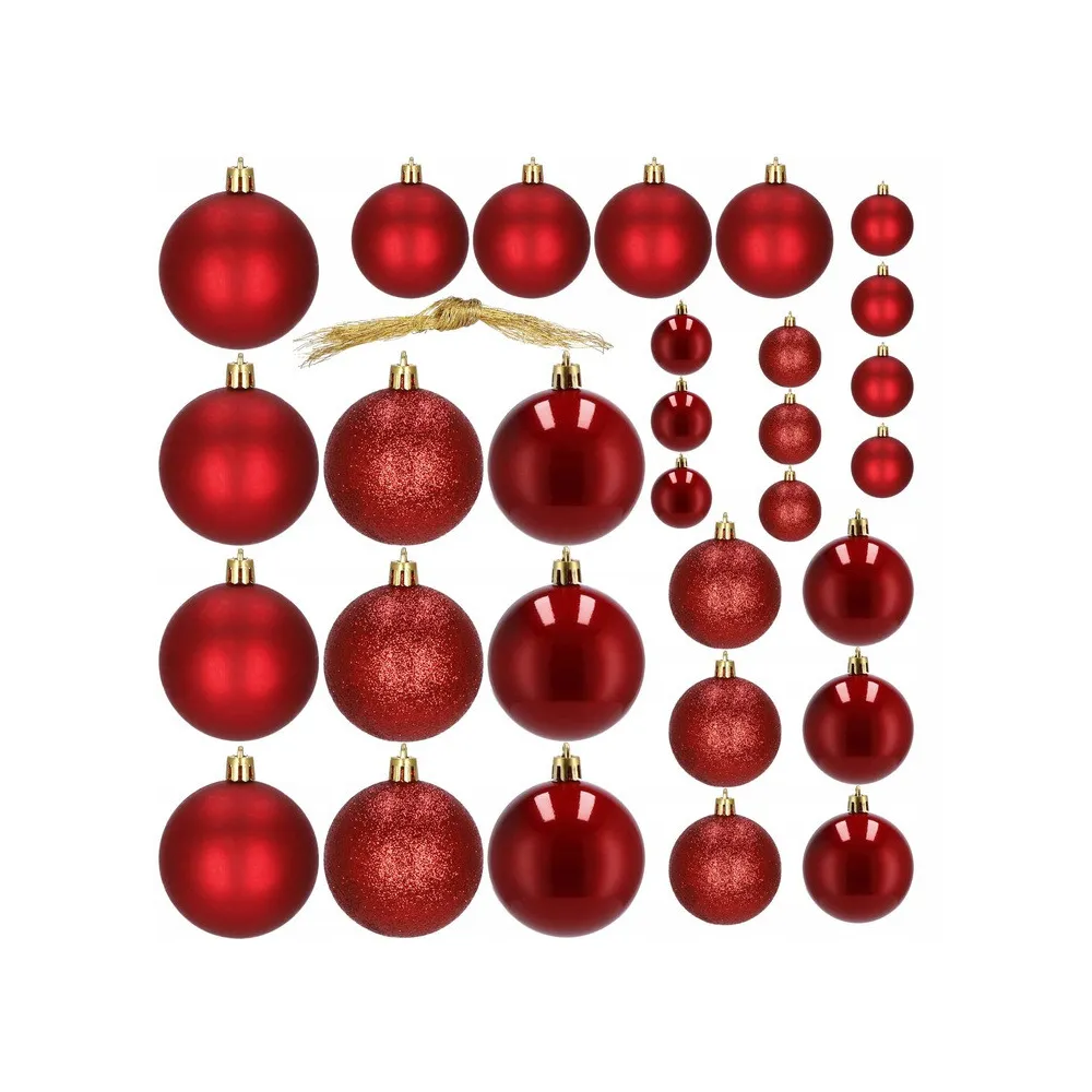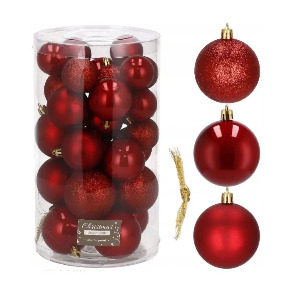 Súprava 30 ks červených baniek na stromček s tromi rôznymi vzormi. Priemer banky je 4, 5, 6 cm. Pútko na zavesenie, nerozbitný plastový materiál. Ideálne na výzdobu stromčeka alebo ako vianočné dekorácie. Zadarmo povrázky pre ľahké zavesenie.