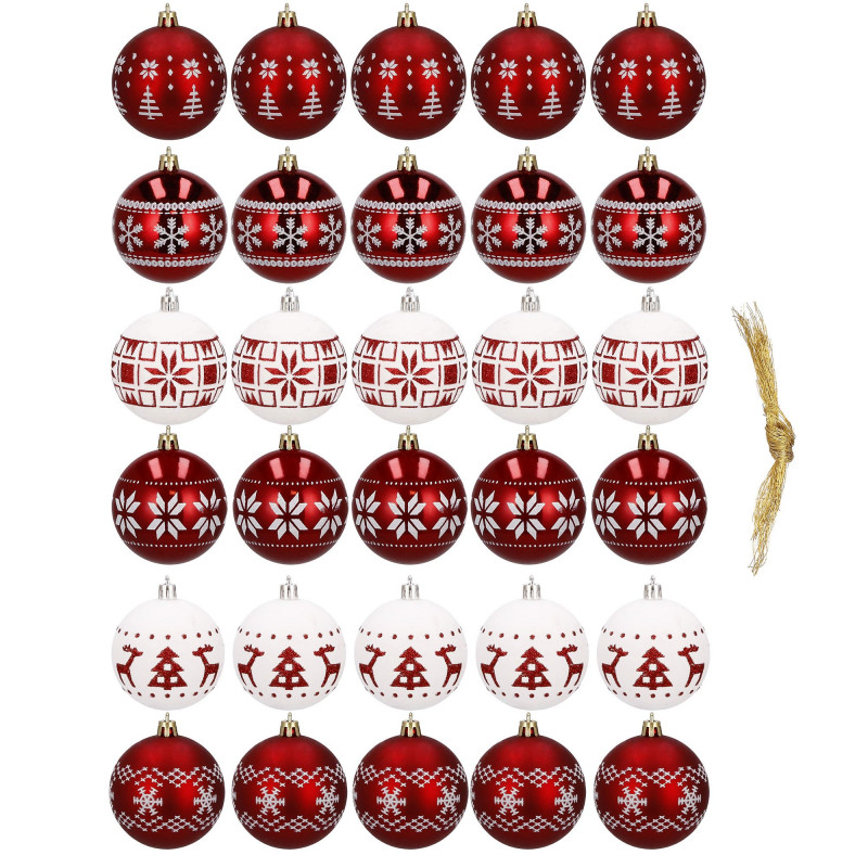 Sada 30 ks červených a bielych baniek na stromček s tromi rôznymi vzormi. Priemer banky 7 cm, pútko na zavesenie, nerozbitný plastový materiál. Ideálne na výzdobu stromčeka alebo ako vianočné dekorácie. Zadarmo povrázky pre ľahké zavesenie.