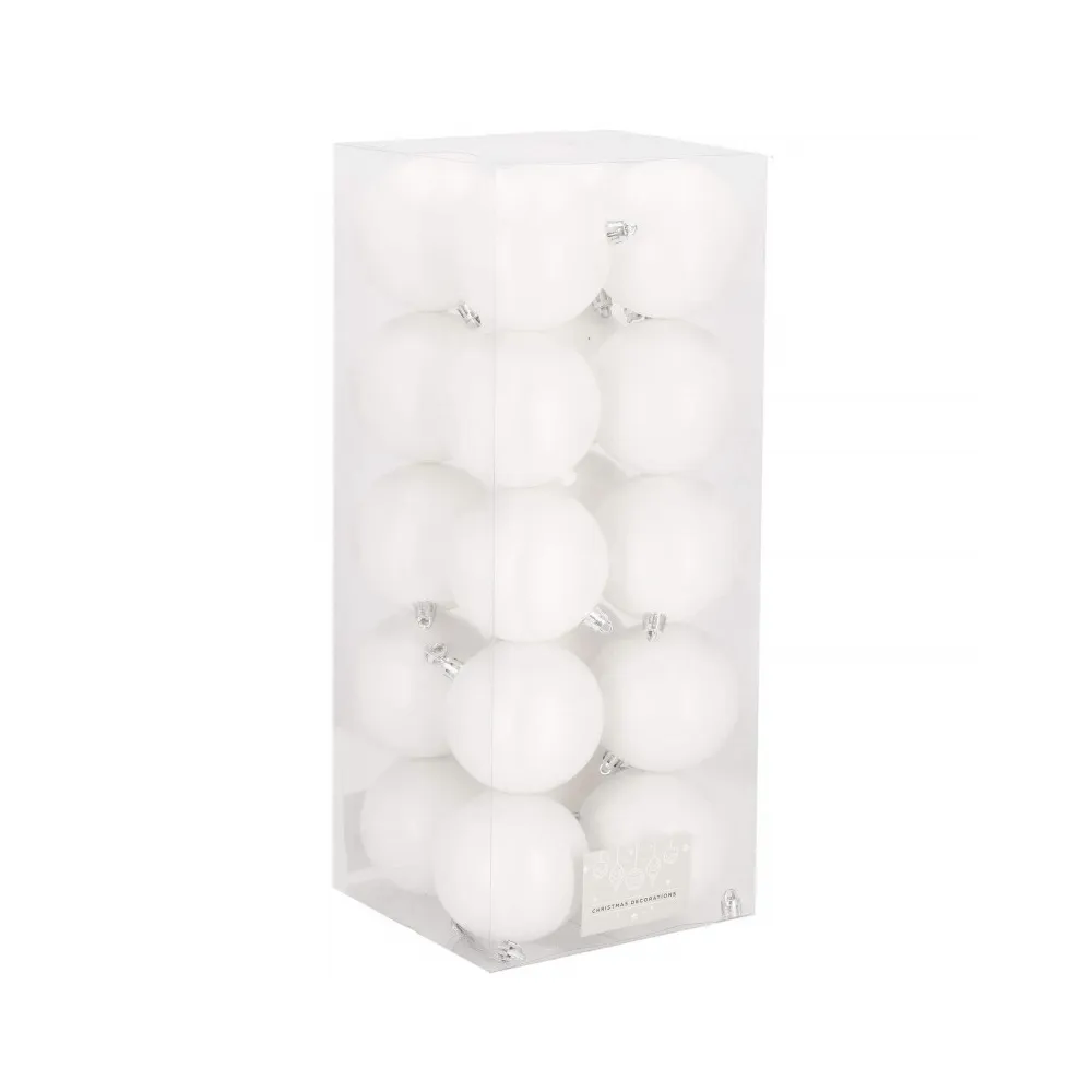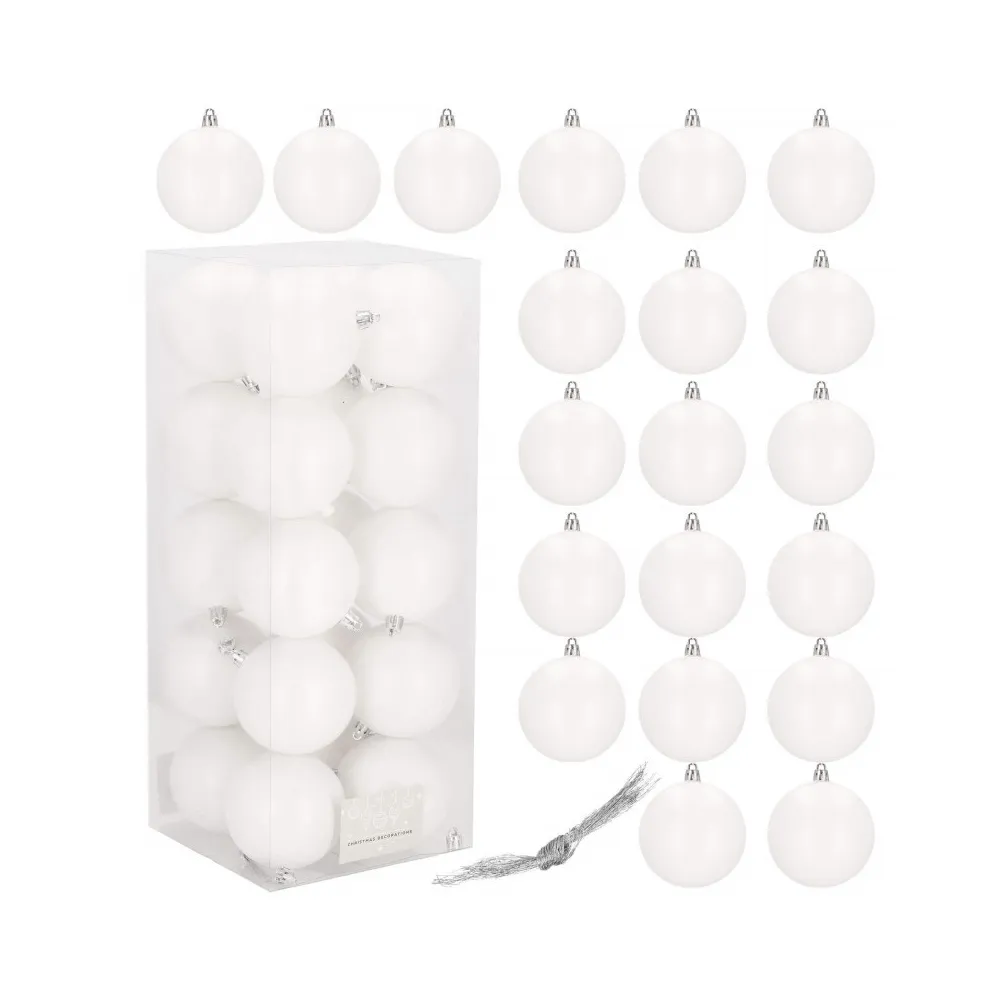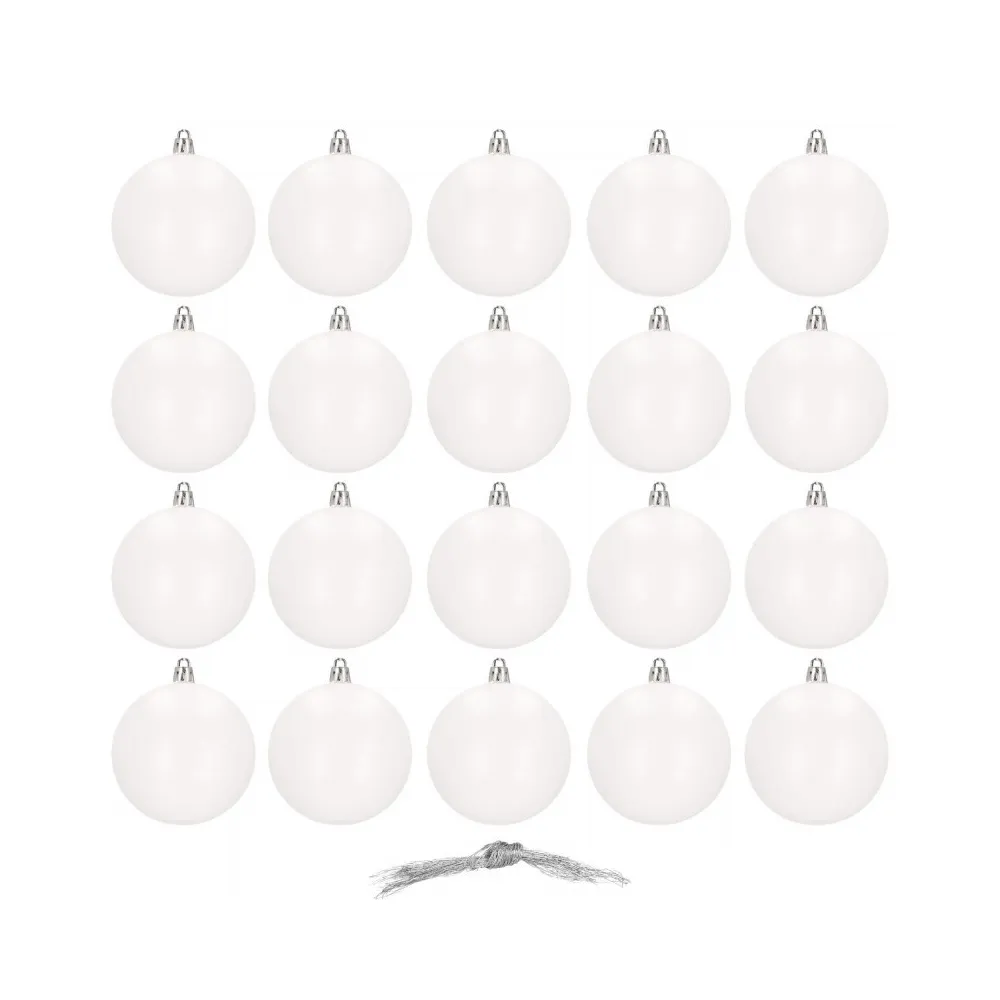 Sada 20 ks bielych baniek na stromček. Priemer banky je 8 cm. Pútko na zavesenie, nerozbitný plastový materiál. Ideálne na výzdobu stromčeka alebo ako vianočné dekorácie. Zadarmo povrázky pre ľahké zavesenie.