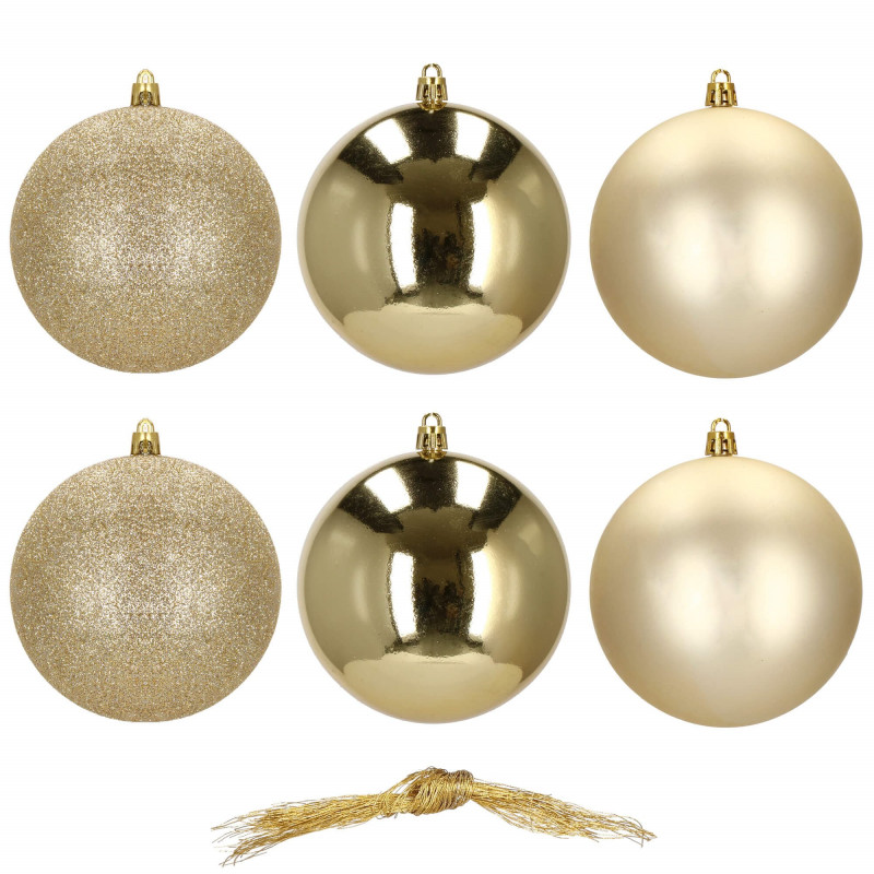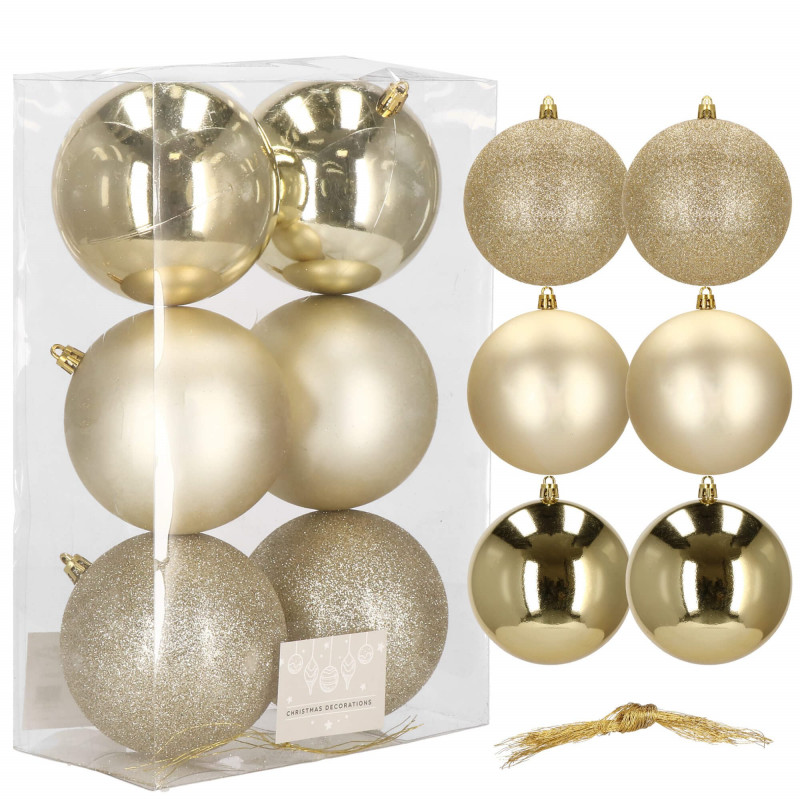 Sada 6 ks zlatých baniek na stromček s tromi rôznymi vzormi. Priemer banky 10 cm, pútko na zavesenie, nerozbitný plastový materiál. Ideálne na výzdobu stromčeka alebo ako vianočné dekorácie. Zadarmo povrázky pre ľahké zavesenie.