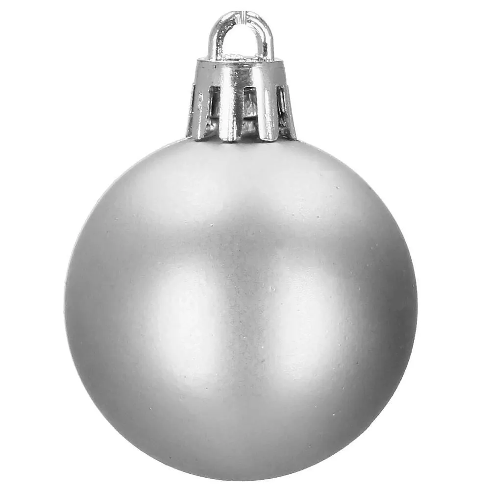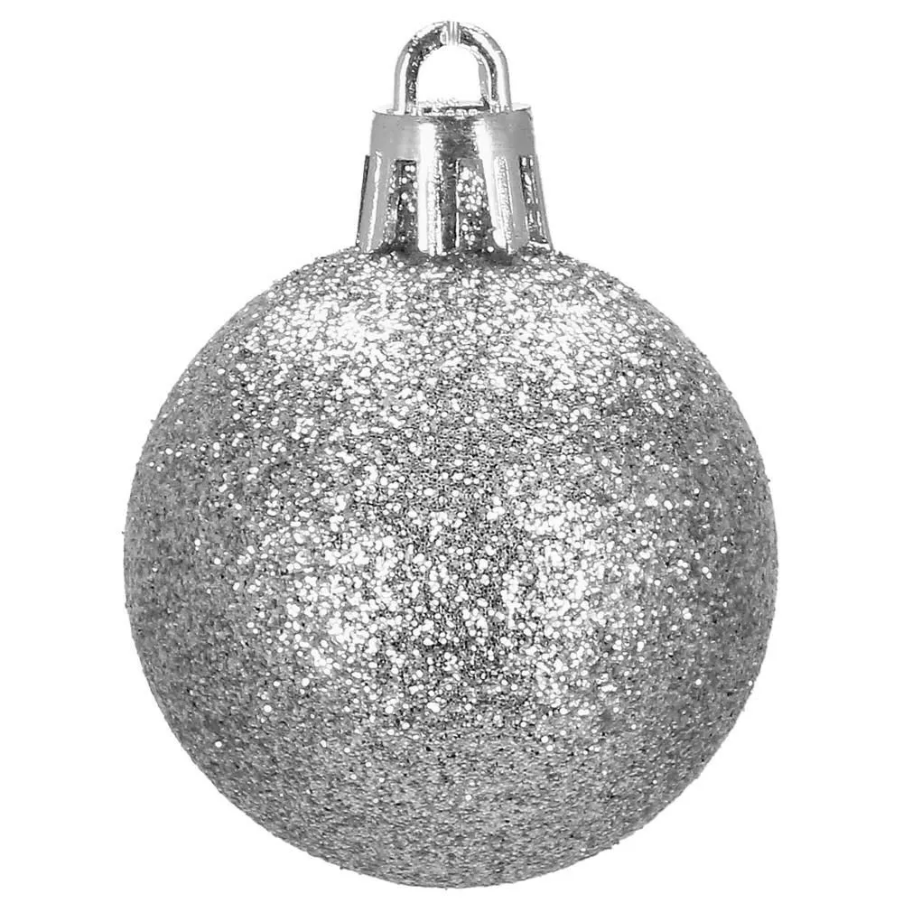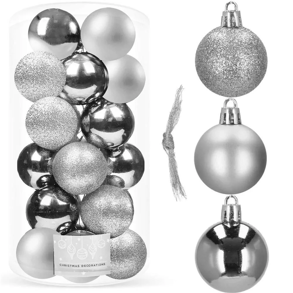 Súprava 20 ks strieborných baniek na stromček s tromi rôznymi vzormi. Priemer banky je 4 cm. Pútko na zavesenie, nerozbitný plastový materiál. Ideálne na výzdobu stromčeka alebo ako vianočné dekorácie. Zadarmo povrázky pre ľahké zavesenie.