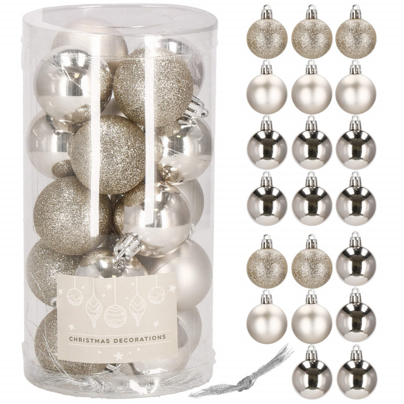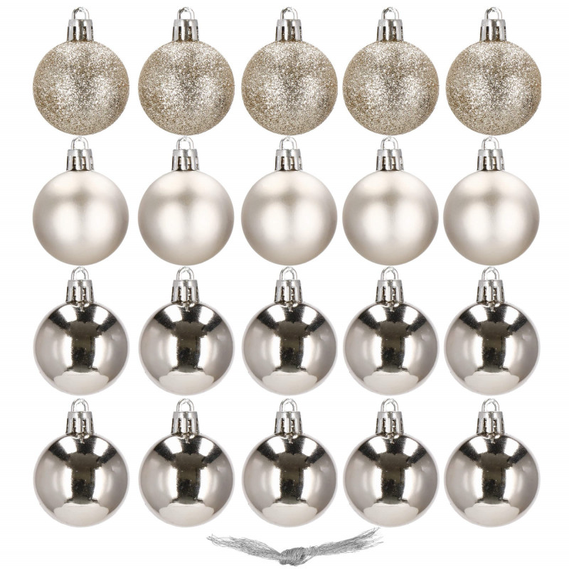 Sada 20 ks baniek vo farebnom odtieni champagne na stromček s tromi rôznymi vzormi. Pútko na zavesenie, nerozbitný plastový materiál. Ideálne na výzdobu stromčeka alebo ako vianočné dekorácie. Zadarmo strieborné povrázky pre ľahké zavesenie.