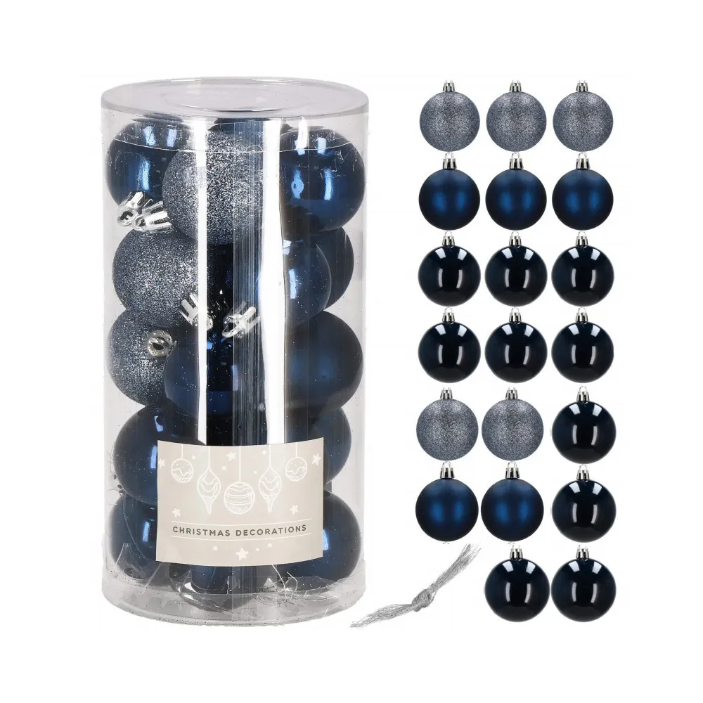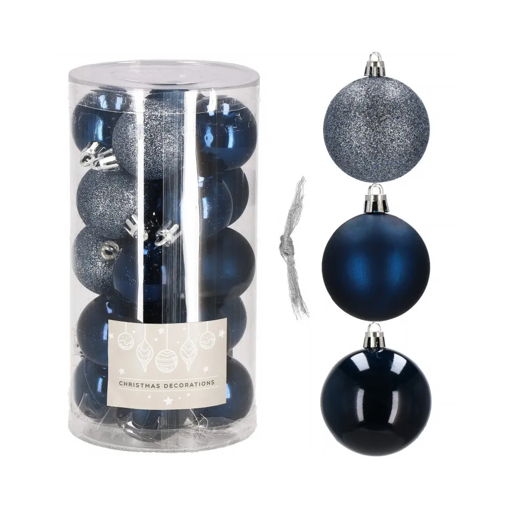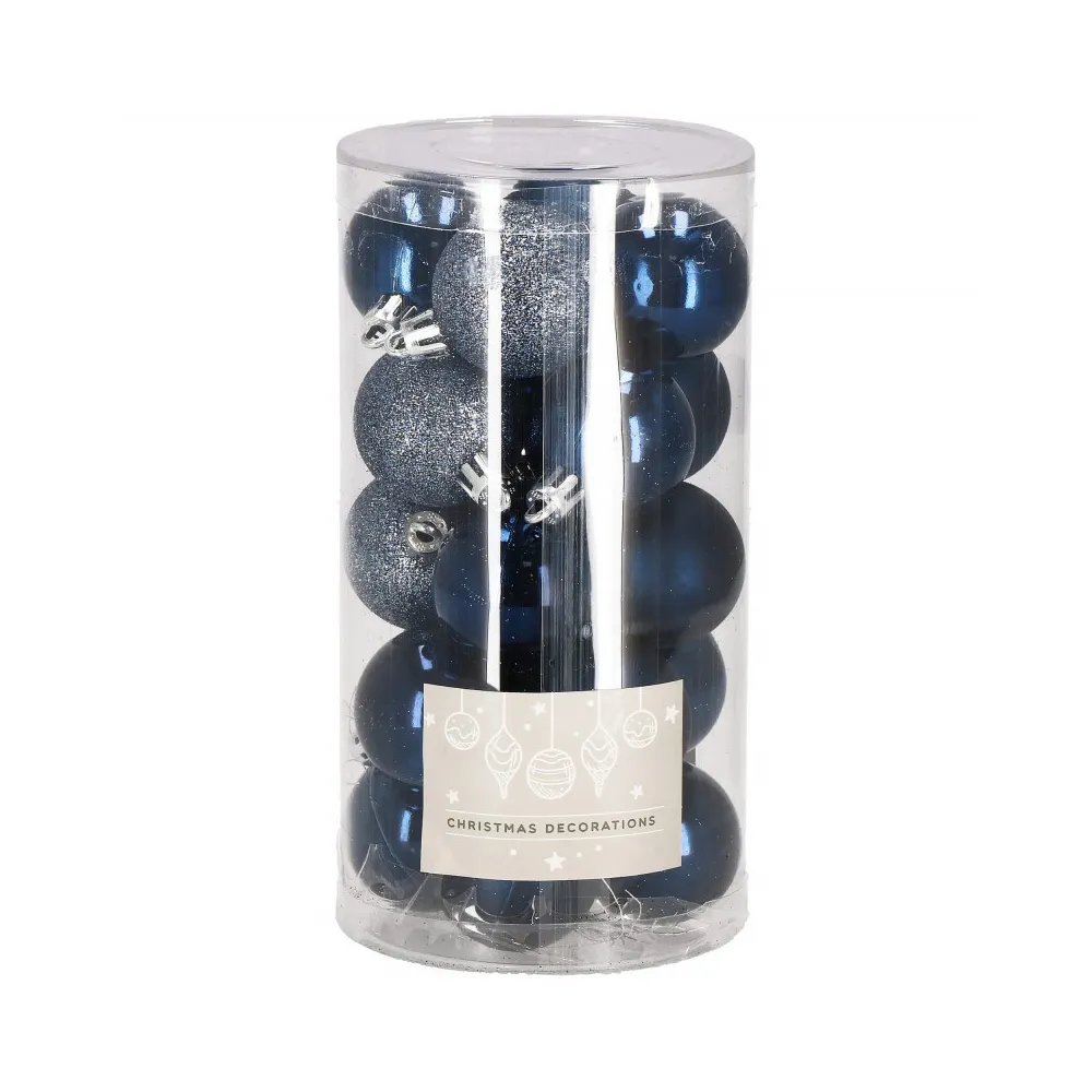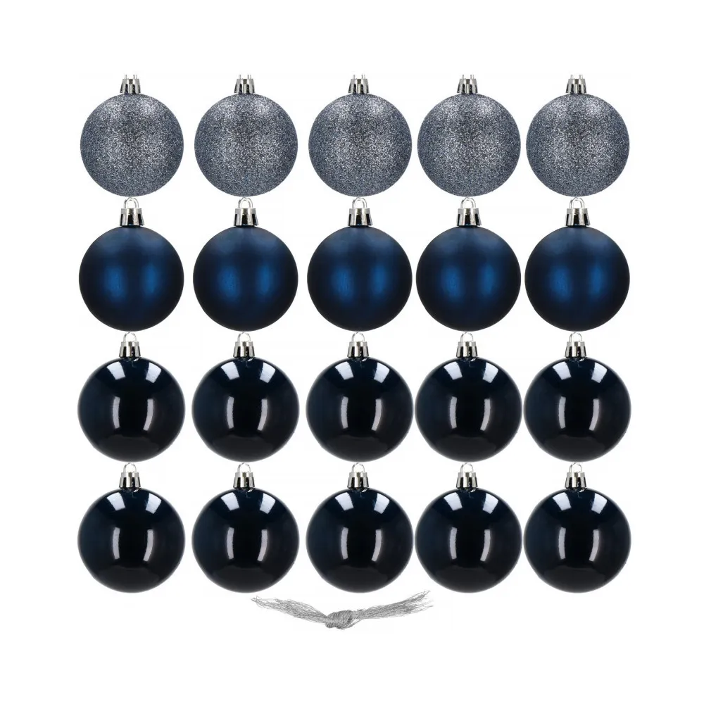 Sada 20 ks modrých baniek na stromček s tromi rôznymi vzormi. Priemer banky je 4 cm, pútko na zavesenie, nerozbitný plastový materiál. Ideálne na výzdobu stromčeka alebo ako vianočné dekorácie. Zadarmo strieborné povrázky pre ľahké zavesenie.