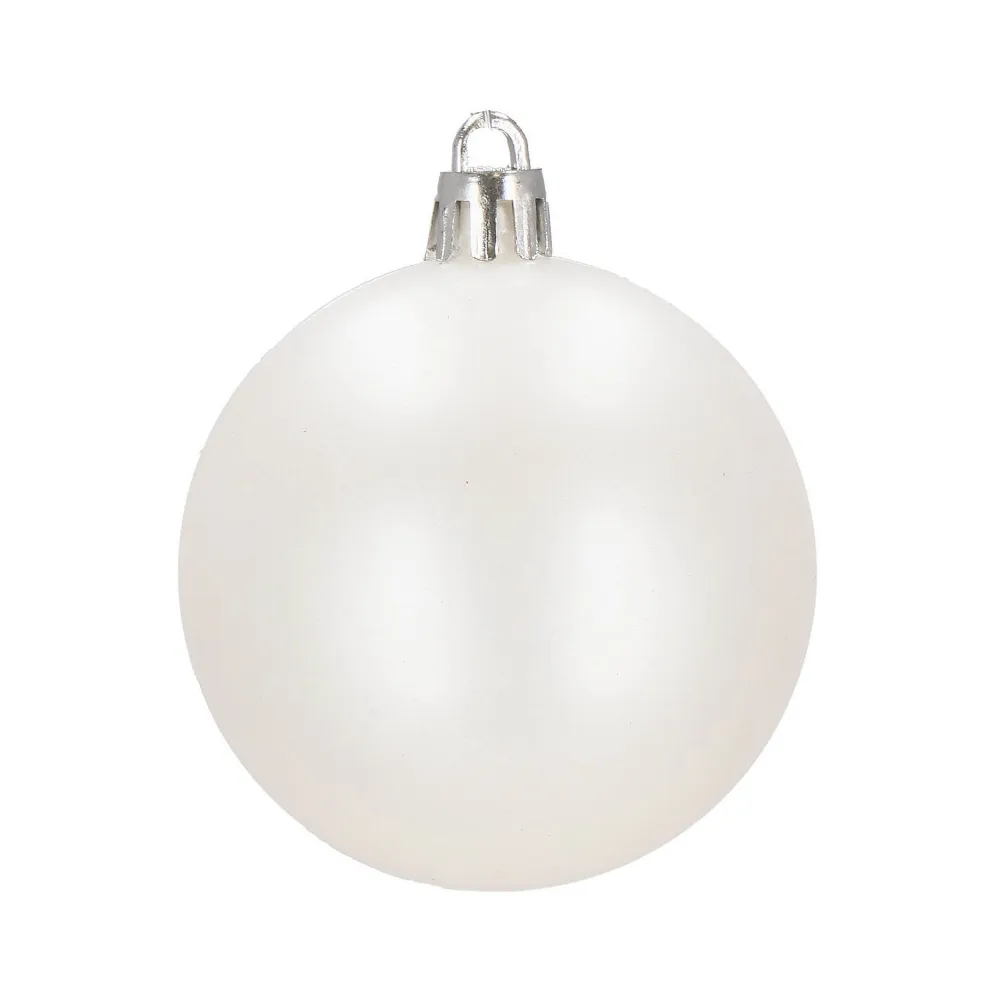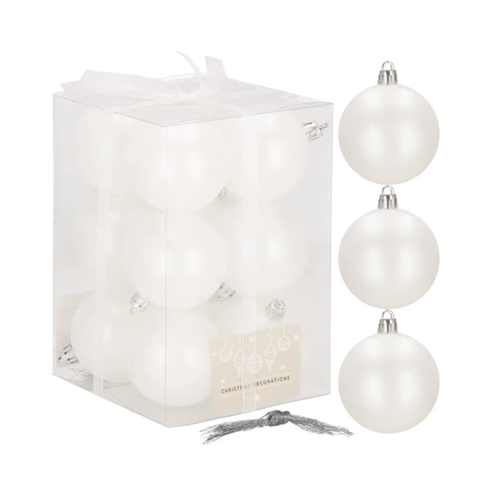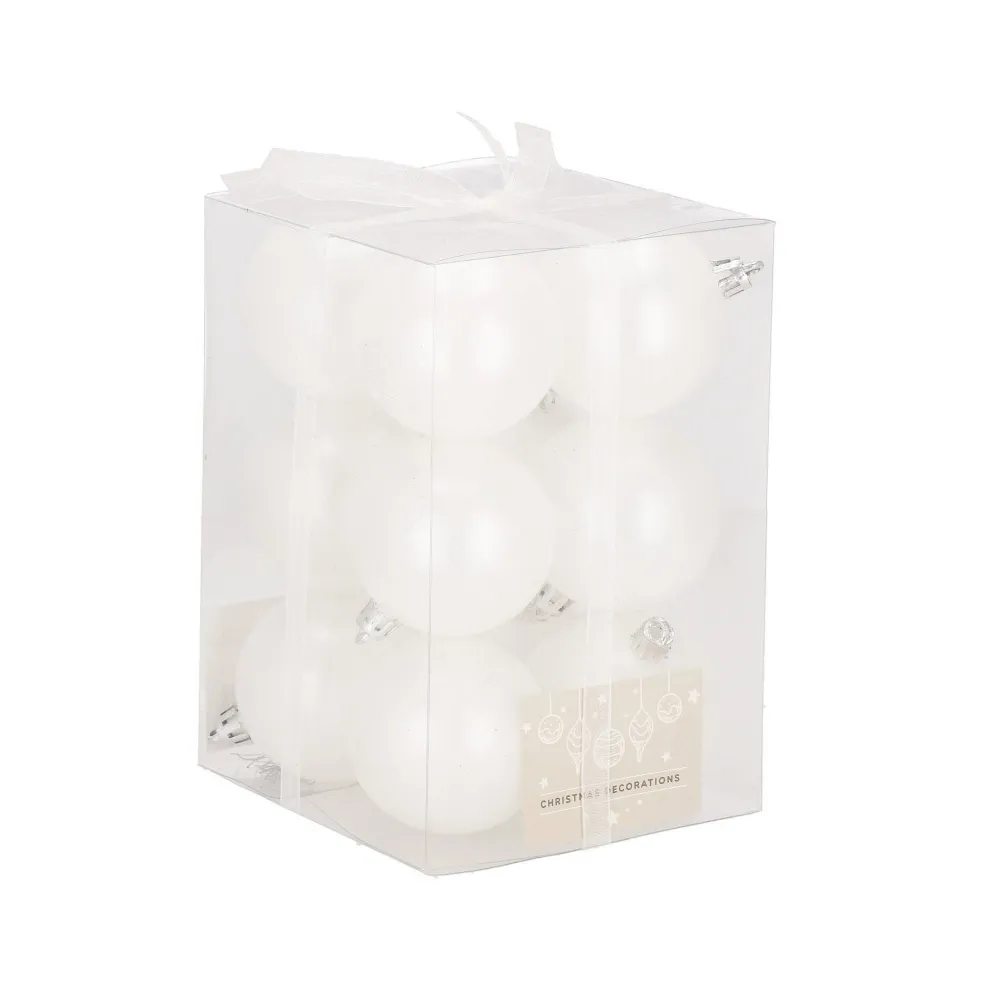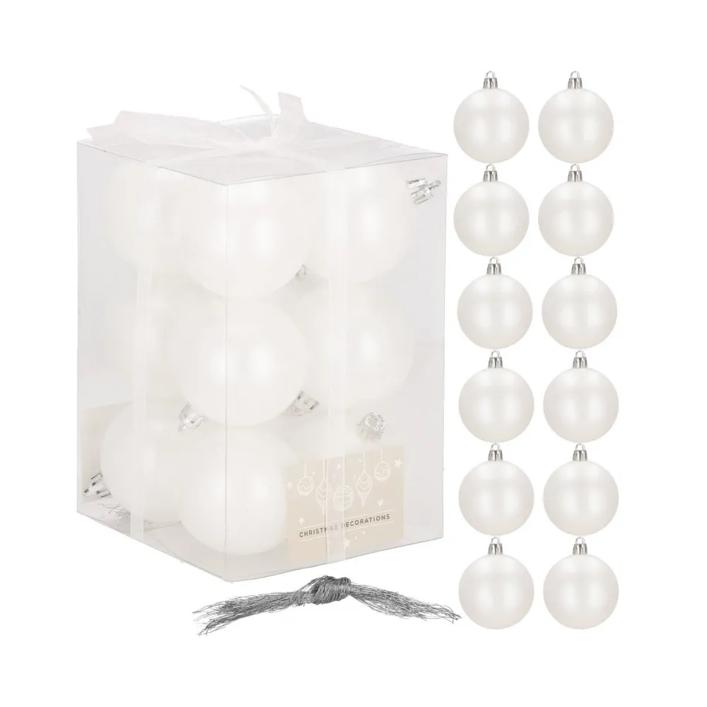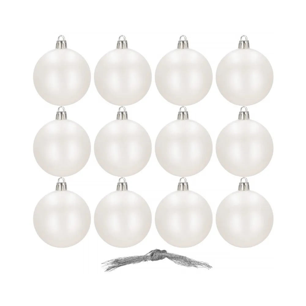 Sada 12 ks matne bielych baniek na stromček. Priemer banky je 6 cm. Pútko na zavesenie, nerozbitný plastový materiál. Ideálne na výzdobu stromčeka alebo ako vianočné dekorácie. Zadarmo povrázky pre ľahké zavesenie.