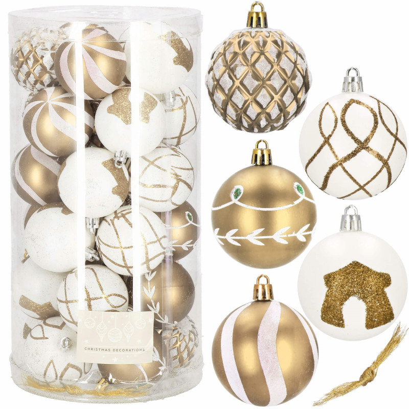 Sada 30 ks zlato-bielych baniek na stromček s piatimi rôznymi vzormi. Priemer banky je 6 cm. Pútko na zavesenie, nerozbitný plastový materiál. Ideálne na výzdobu stromčeka alebo ako vianočné dekorácie. Zadarmo povrázky pre ľahké zavesenie.