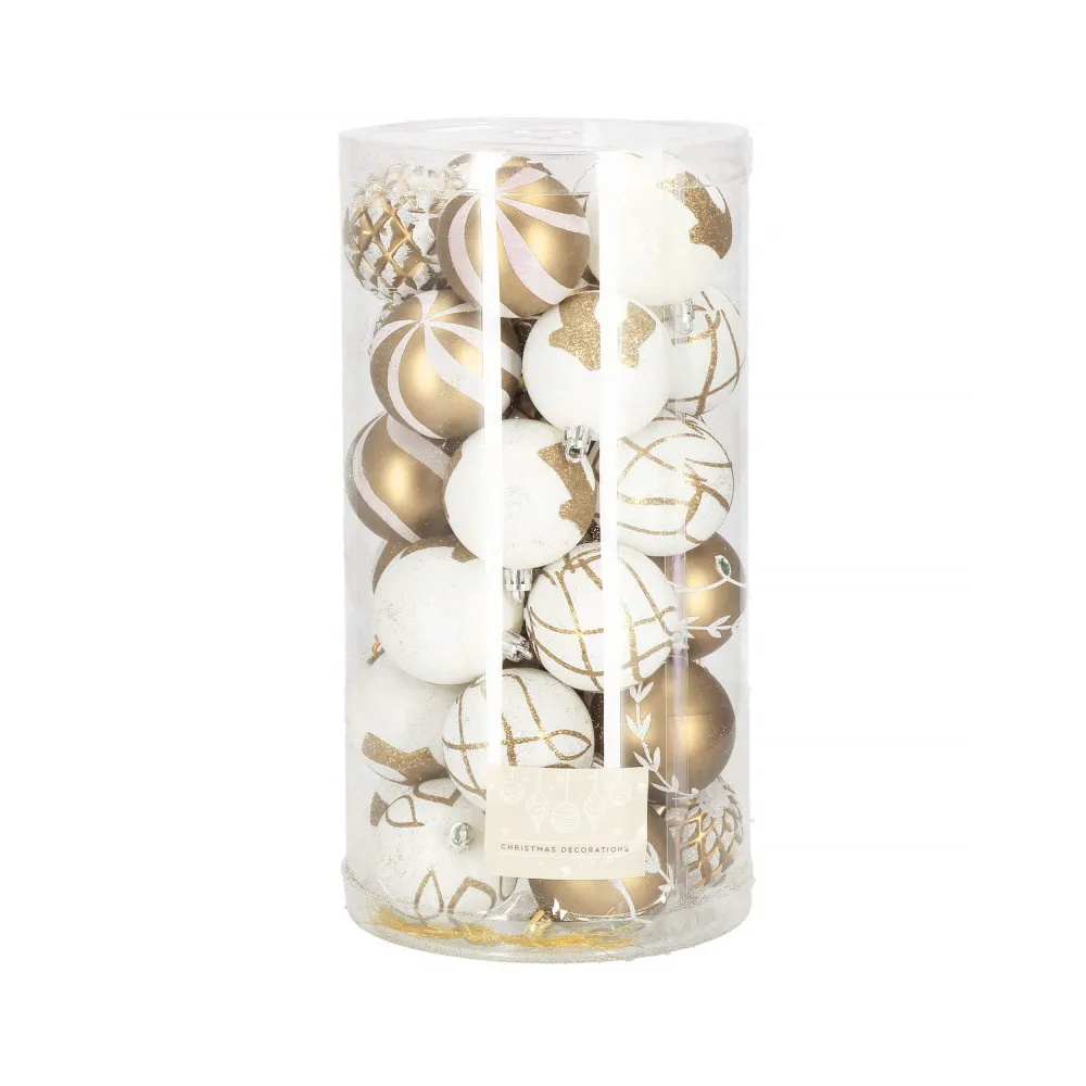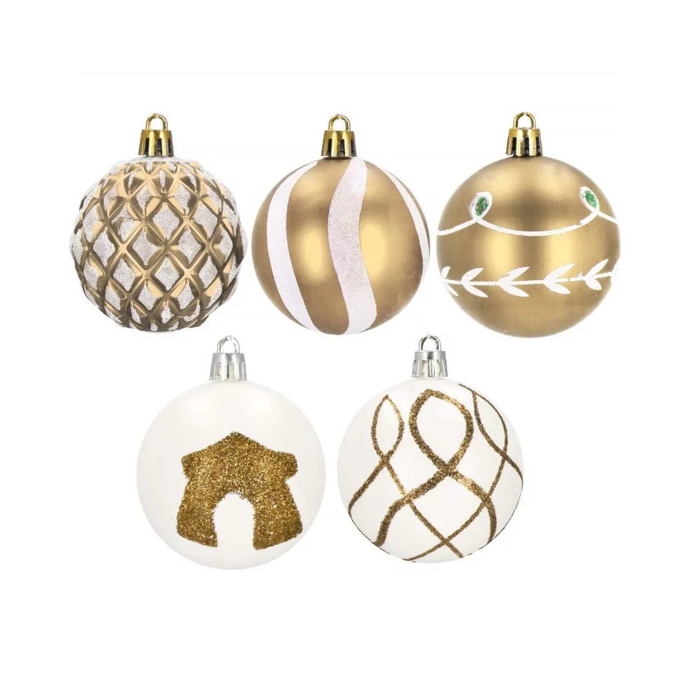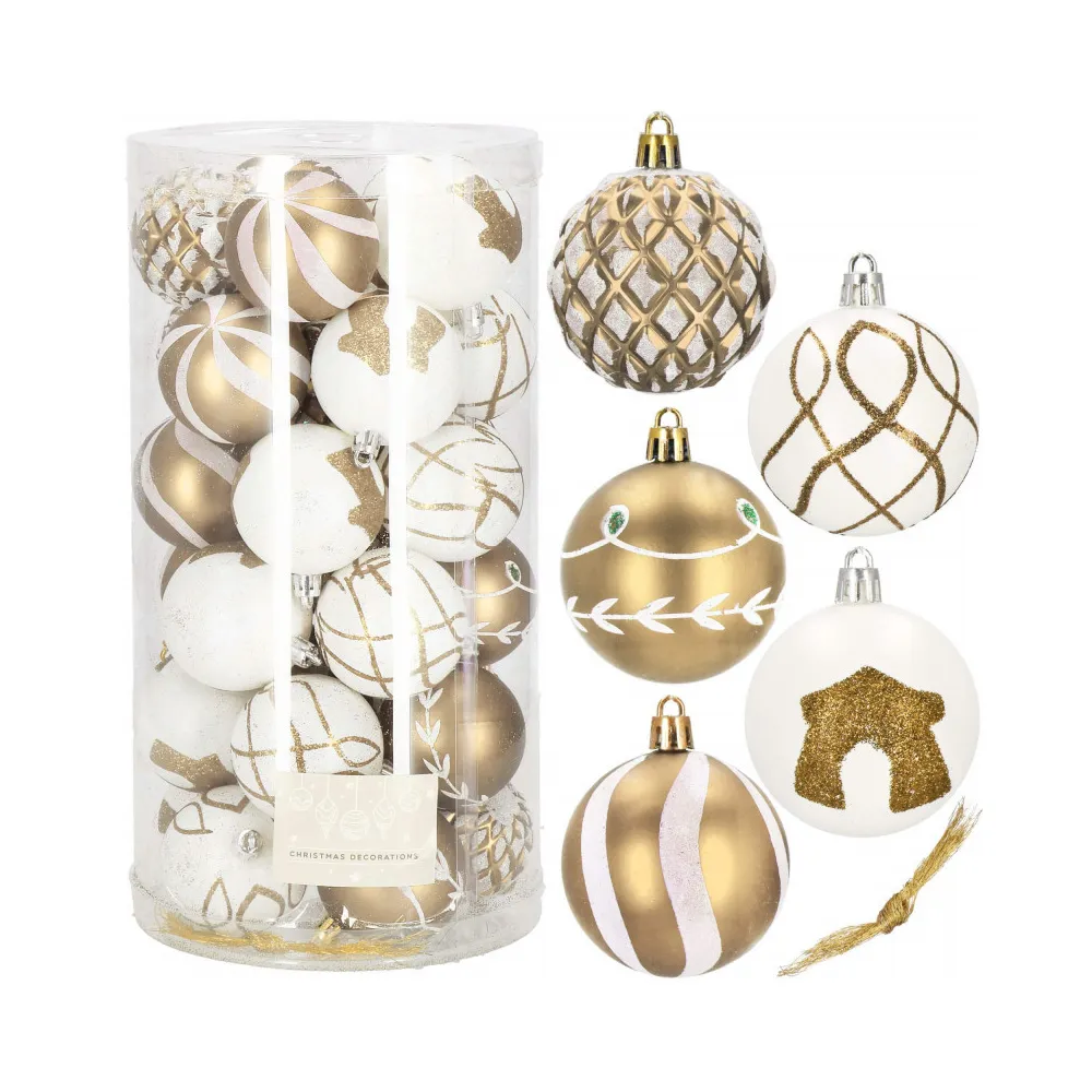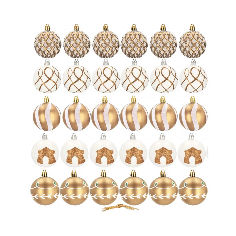 Sada 30 ks zlato-bielych baniek na stromček s piatimi rôznymi vzormi. Priemer banky je 6 cm. Pútko na zavesenie, nerozbitný plastový materiál. Ideálne na výzdobu stromčeka alebo ako vianočné dekorácie. Zadarmo povrázky pre ľahké zavesenie.