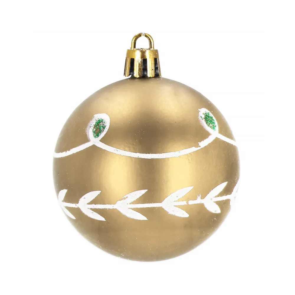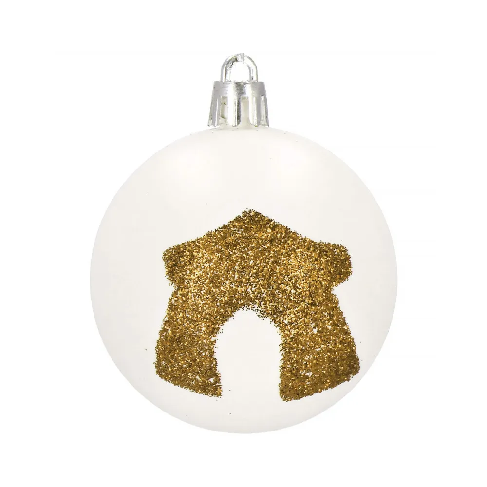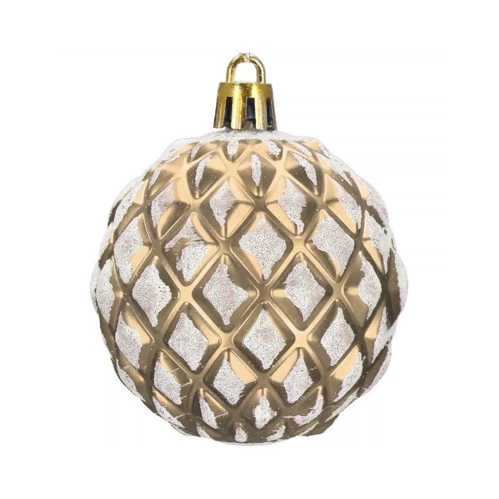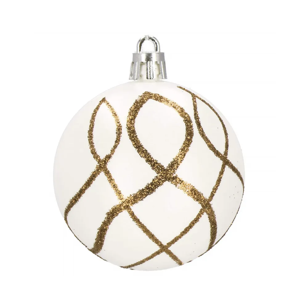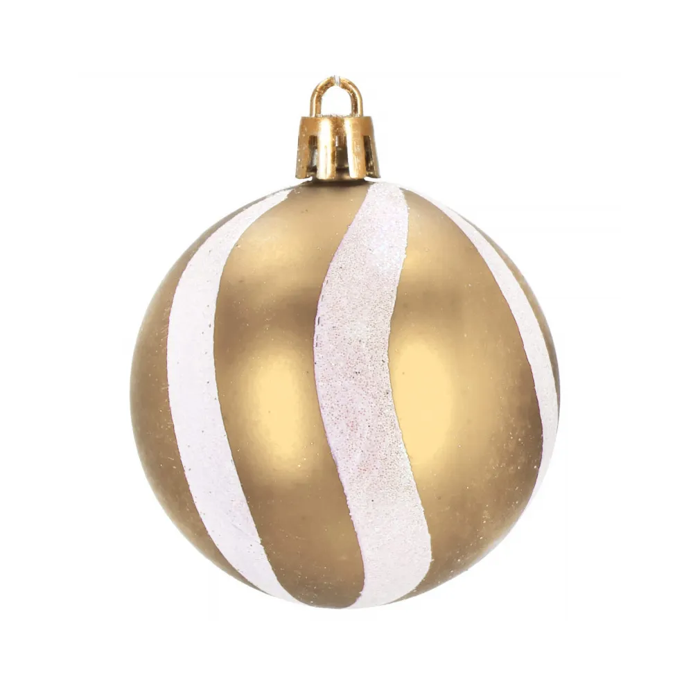 Sada 30 ks zlato-bielych baniek na stromček s piatimi rôznymi vzormi. Priemer banky je 6 cm. Pútko na zavesenie, nerozbitný plastový materiál. Ideálne na výzdobu stromčeka alebo ako vianočné dekorácie. Zadarmo povrázky pre ľahké zavesenie.
