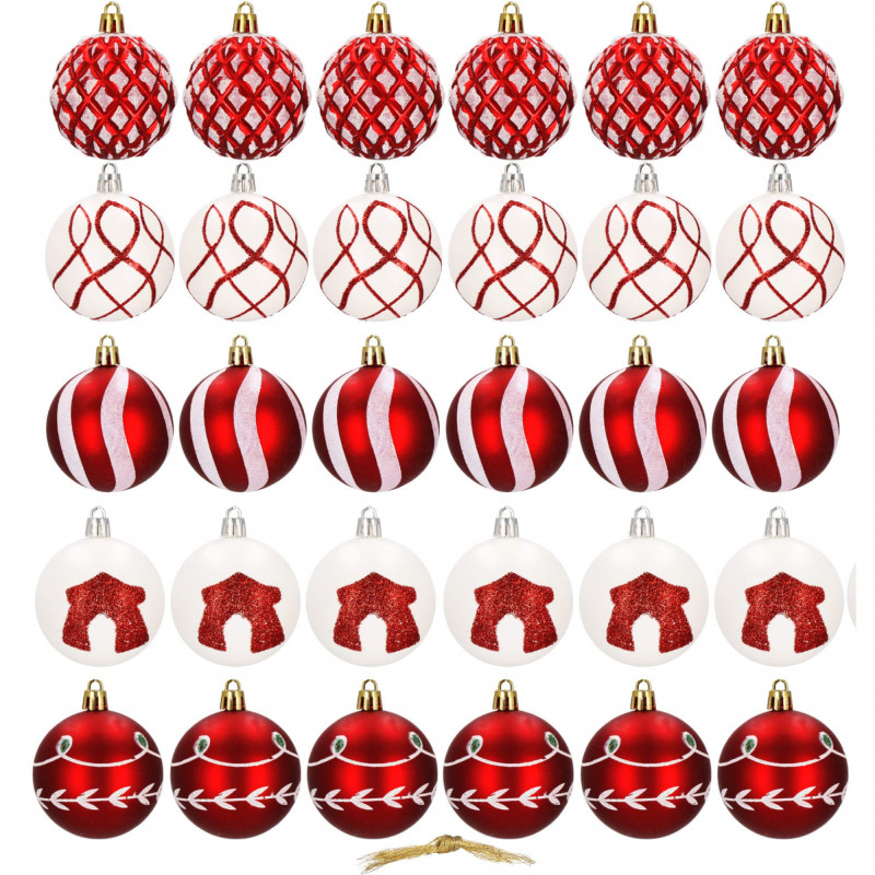 Sada 30 ks červeno-bielych baniek na stromček s piatimi rôznymi vzormi. Priemer banky je 6 cm. Pútko na zavesenie, nerozbitný plastový materiál. Ideálne na výzdobu stromčeka alebo ako vianočné dekorácie. Zadarmo povrázky pre ľahké zavesenie.