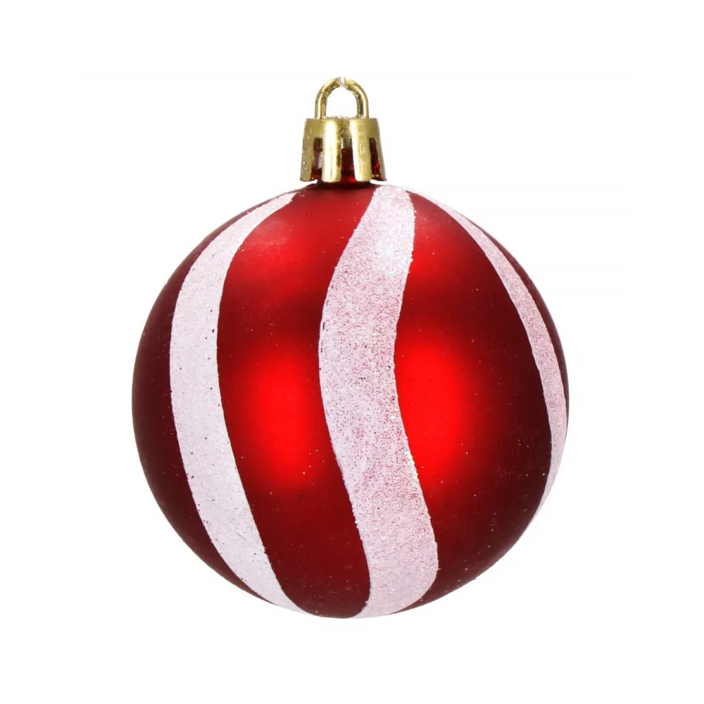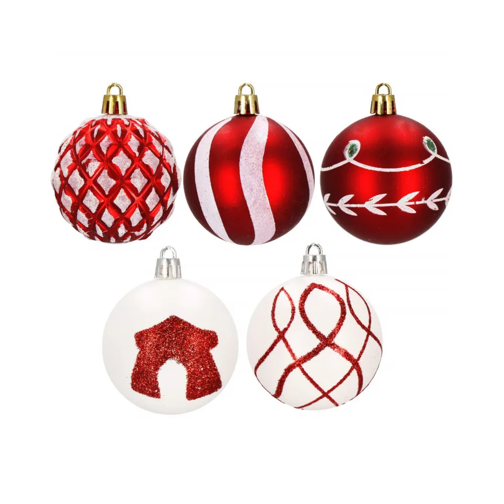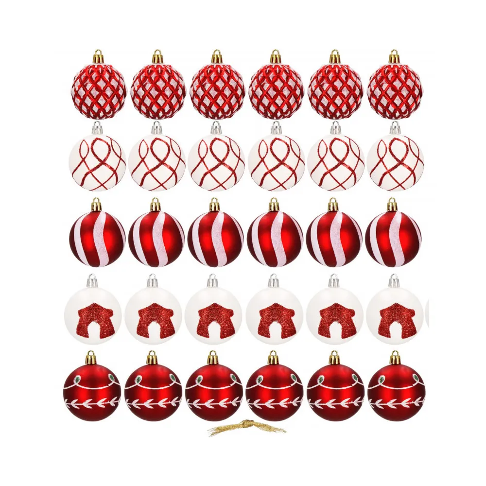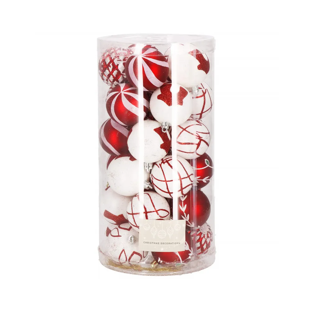 Sada 30 ks červeno-bielych baniek na stromček s piatimi rôznymi vzormi. Priemer banky je 6 cm. Pútko na zavesenie, nerozbitný plastový materiál. Ideálne na výzdobu stromčeka alebo ako vianočné dekorácie. Zadarmo povrázky pre ľahké zavesenie.