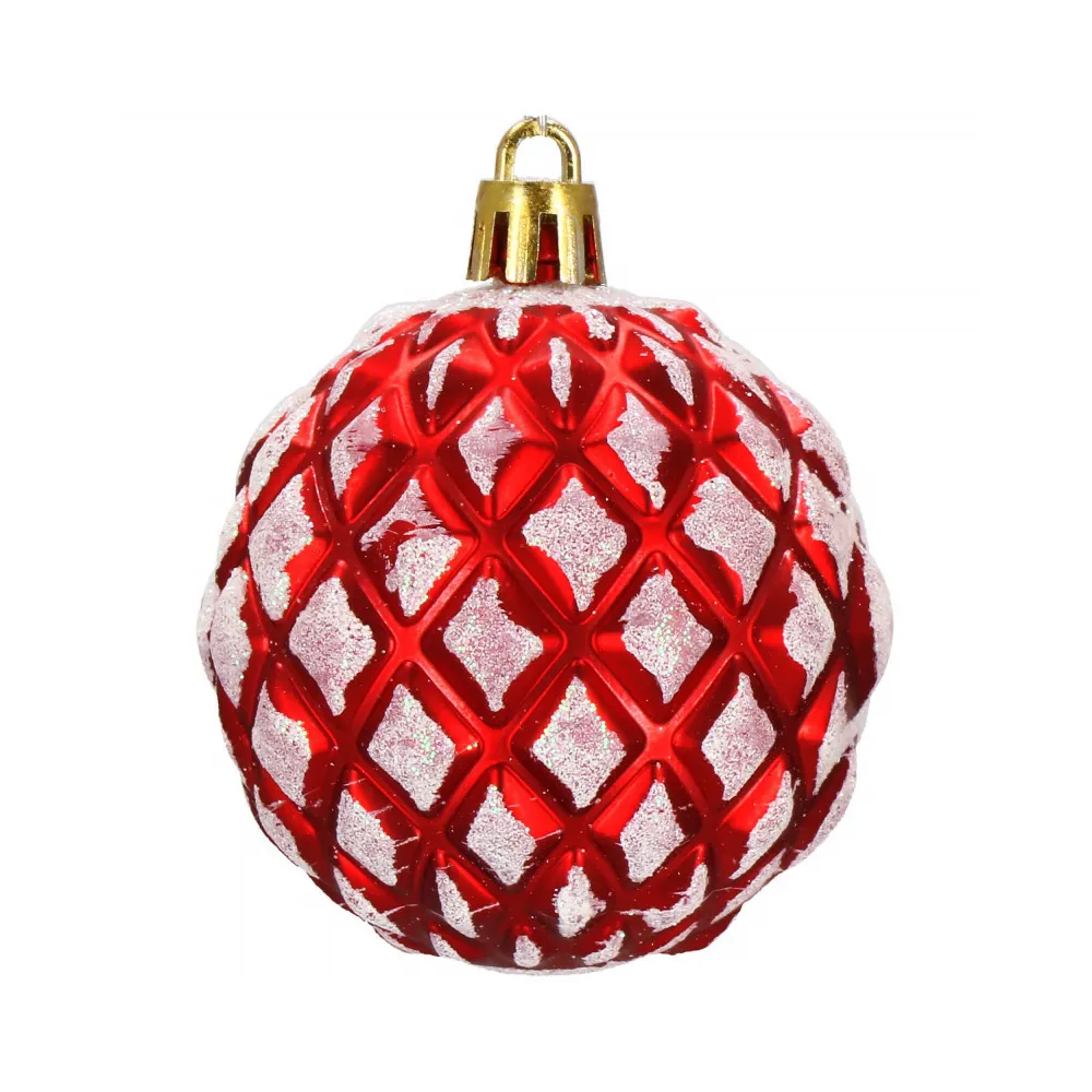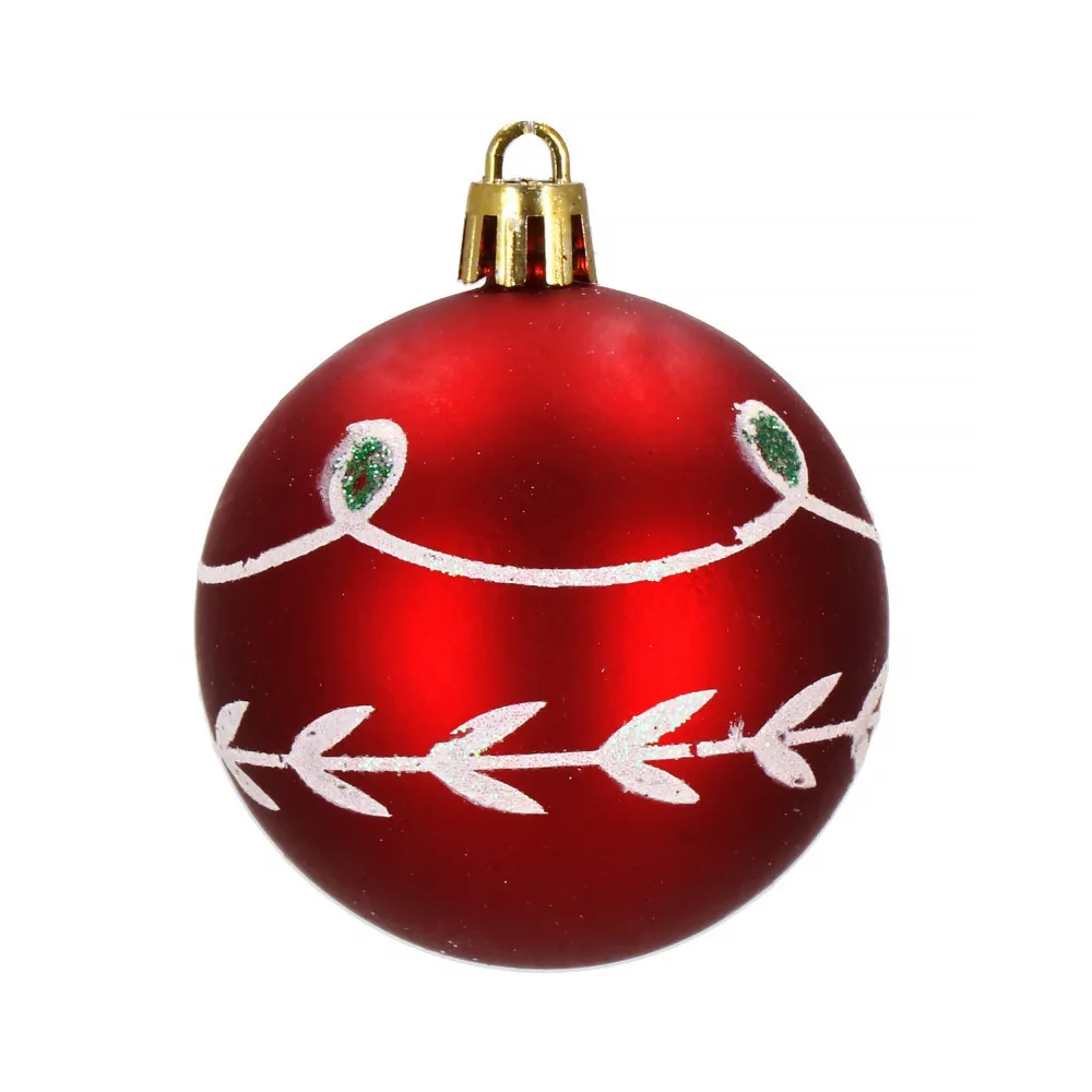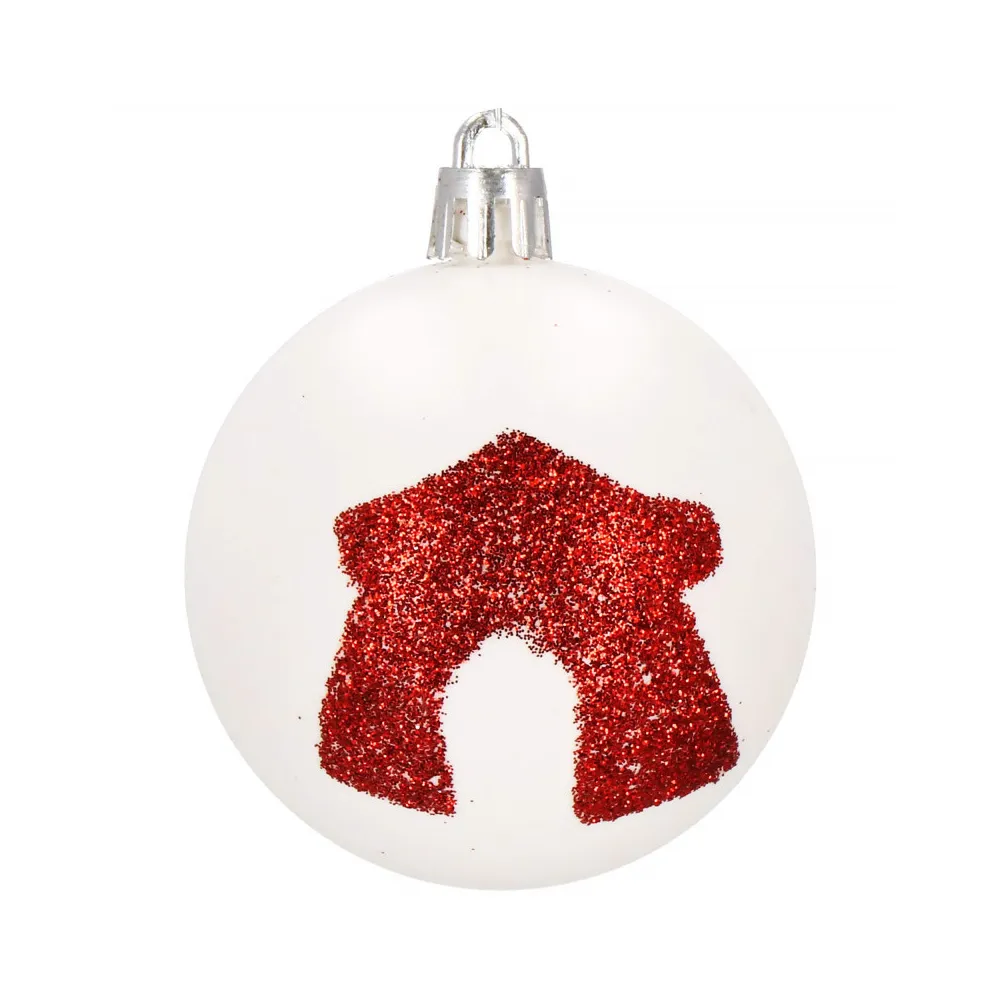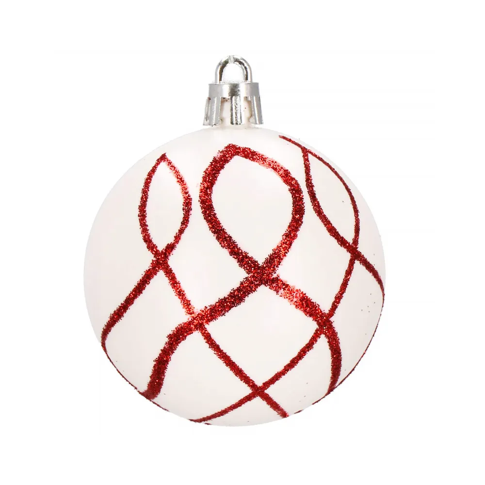 Sada 30 ks červeno-bielych baniek na stromček s piatimi rôznymi vzormi. Priemer banky je 6 cm. Pútko na zavesenie, nerozbitný plastový materiál. Ideálne na výzdobu stromčeka alebo ako vianočné dekorácie. Zadarmo povrázky pre ľahké zavesenie.