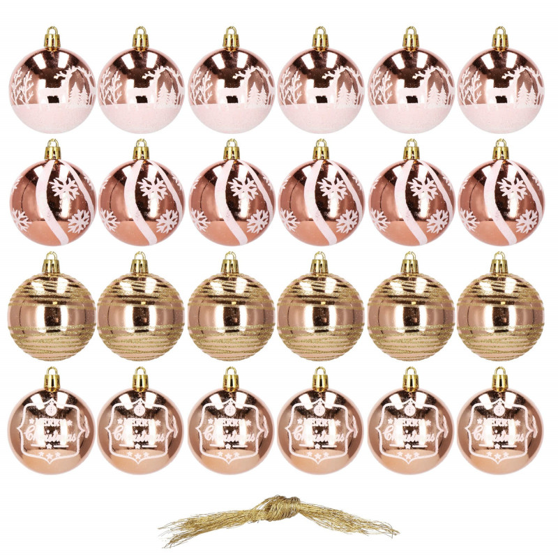 Súprava 24 ks zlatých baniek na stromček so štyrmi rôznymi vzormi. Priemer banky je 6 cm. Pútko na zavesenie, nerozbitný plastový materiál. Ideálne na výzdobu stromčeka alebo ako vianočné dekorácie. Zadarmo povrázky pre ľahké zavesenie.