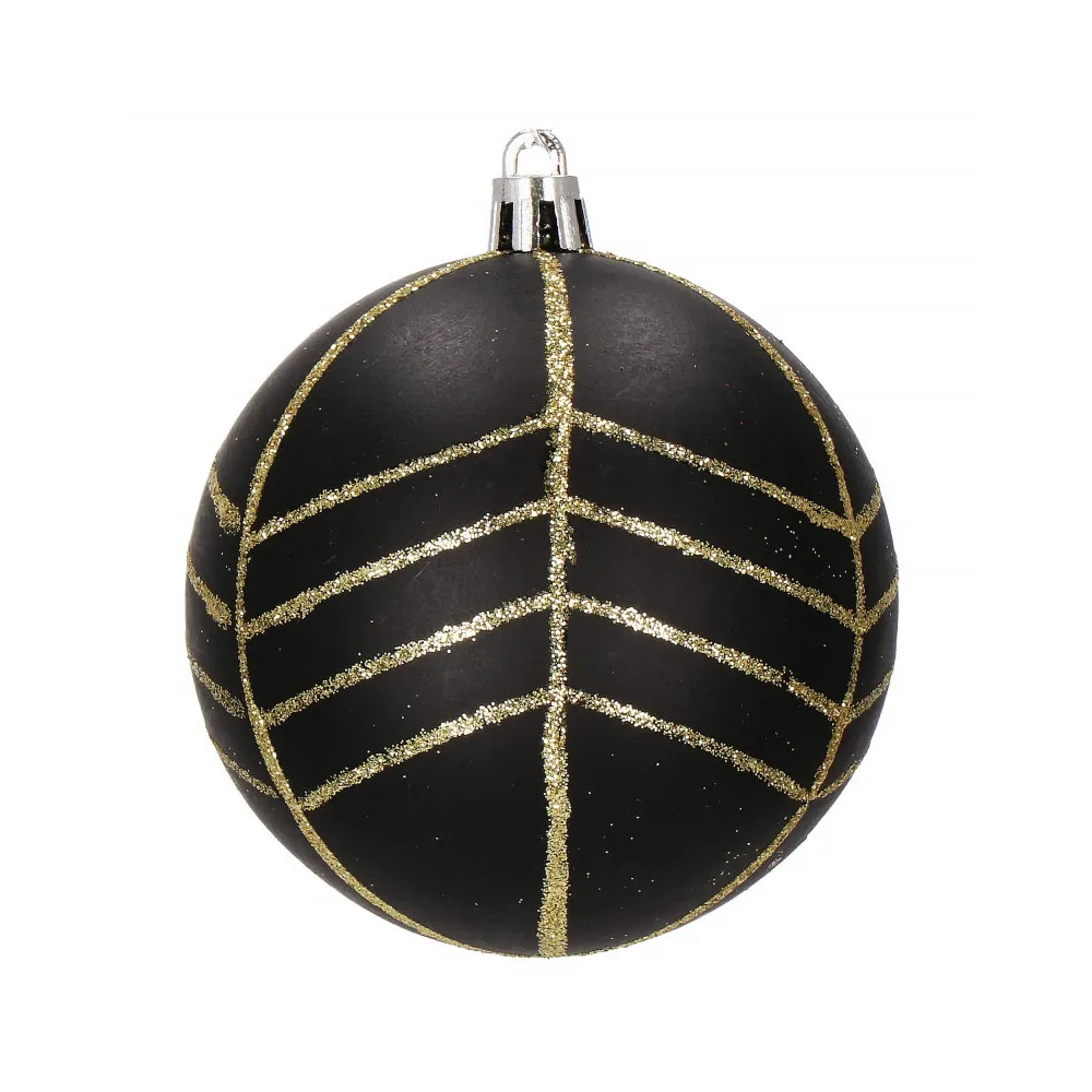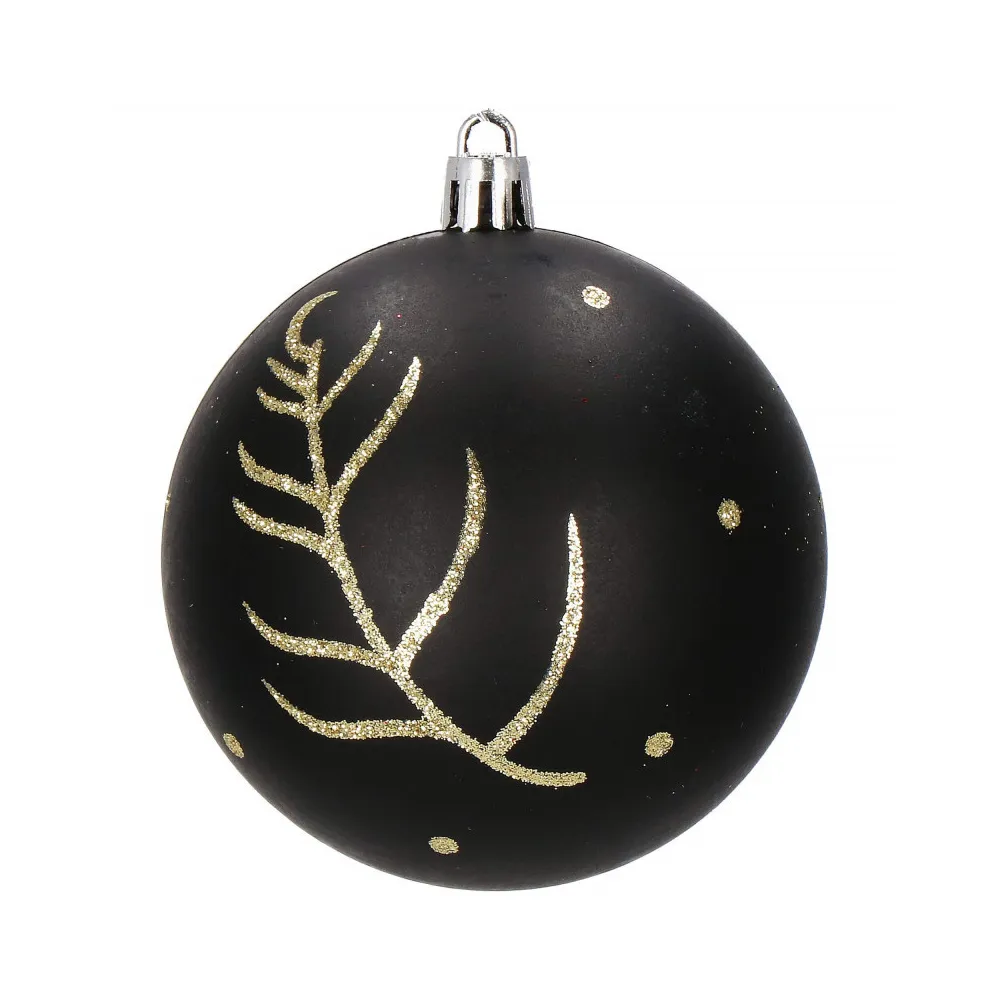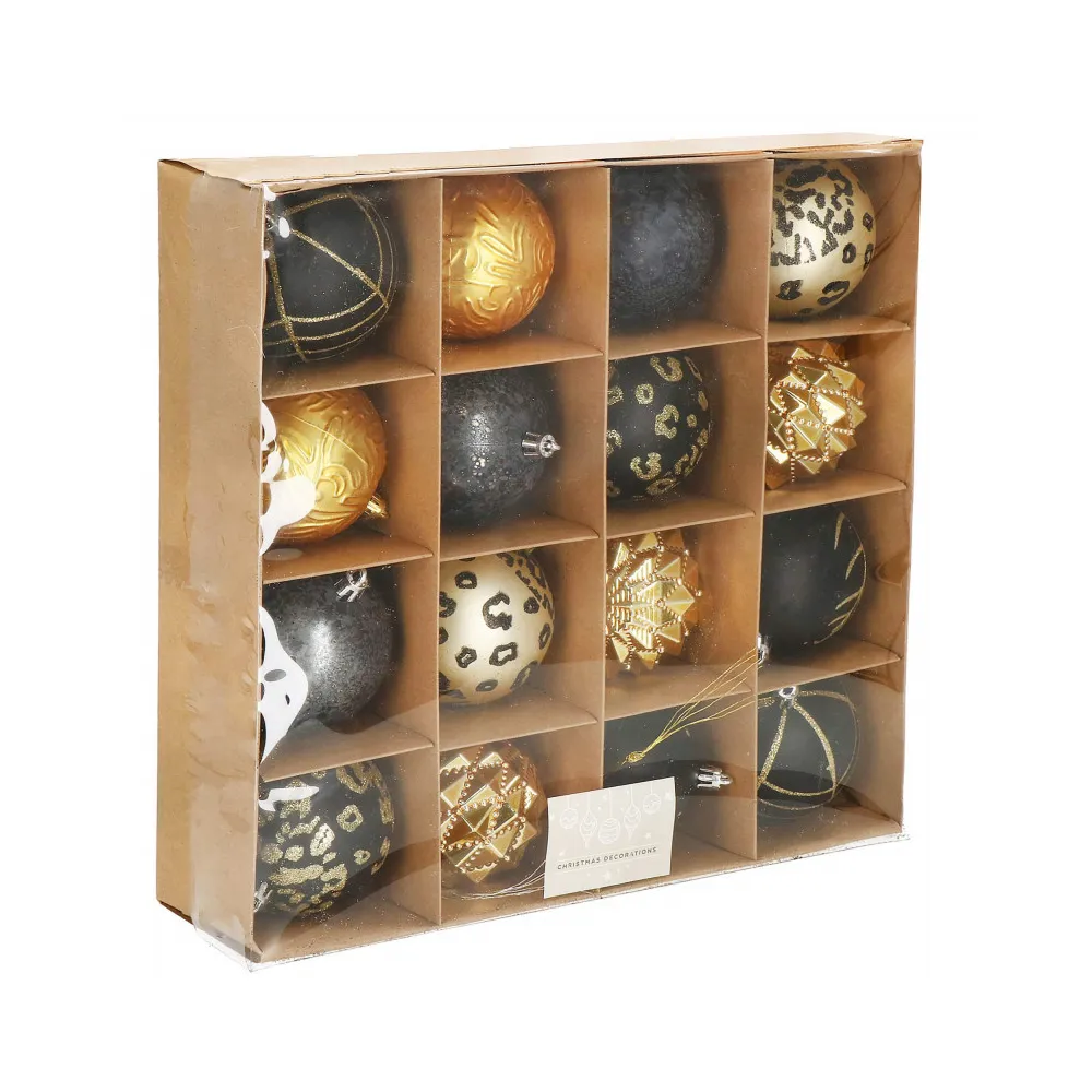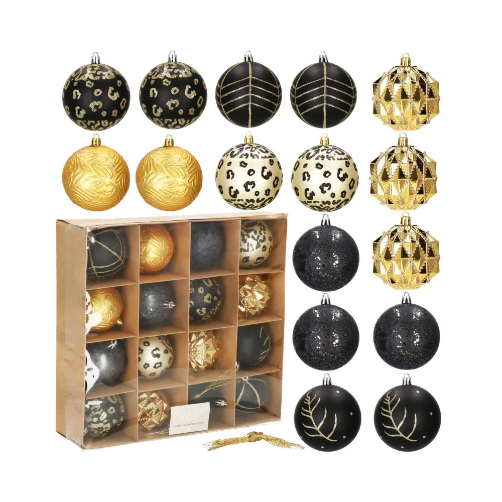 Sada 16 ks zlatých a čiernych baniek na stromček s tromi rôznymi vzormi. Priemer banky 8 cm, pútko na zavesenie, nerozbitný plastový materiál. Ideálne na výzdobu stromčeka alebo ako vianočné dekorácie. Zadarmo povrázky pre ľahké zavesenie.
