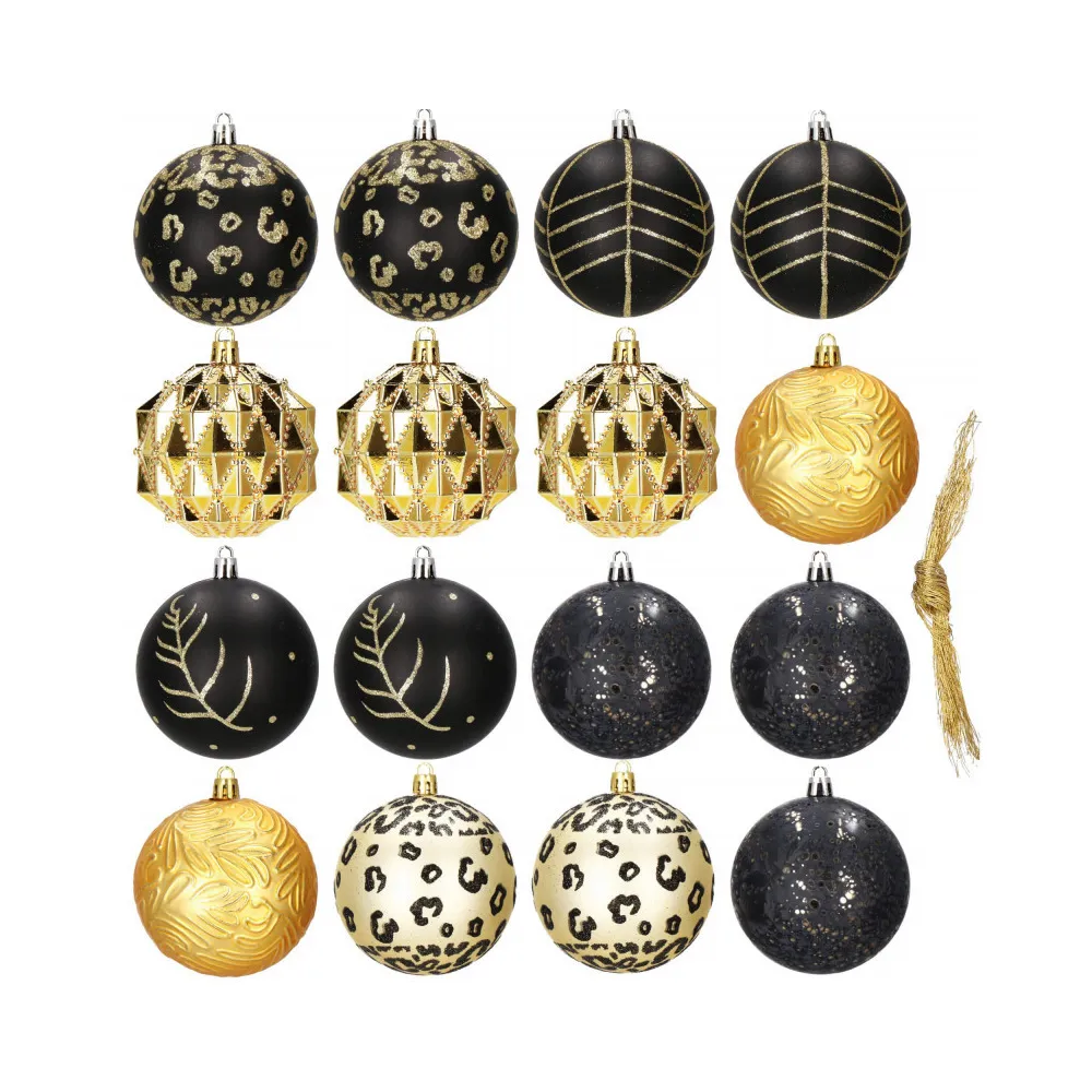 Súprava 16 ks zlatých a čiernych baniek na stromček s tromi rôznymi vzormi.