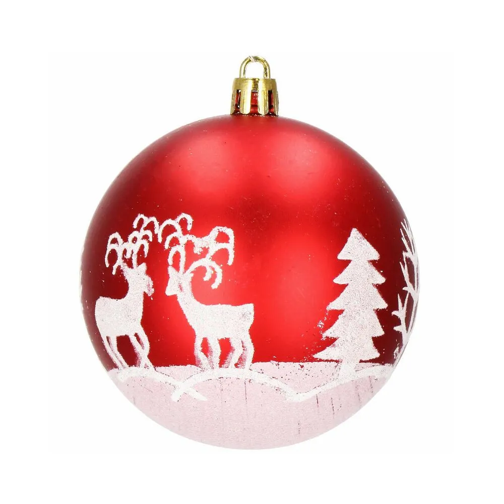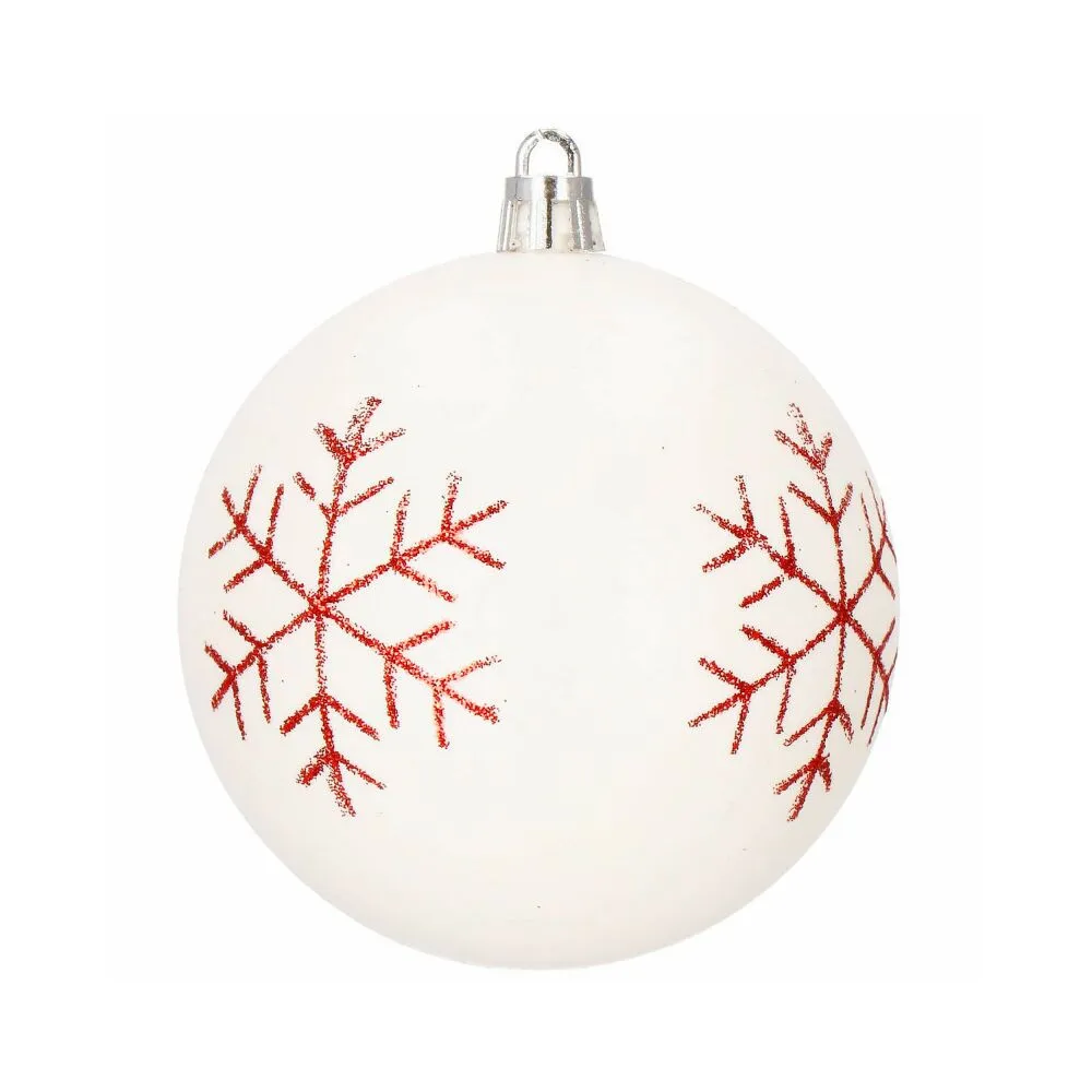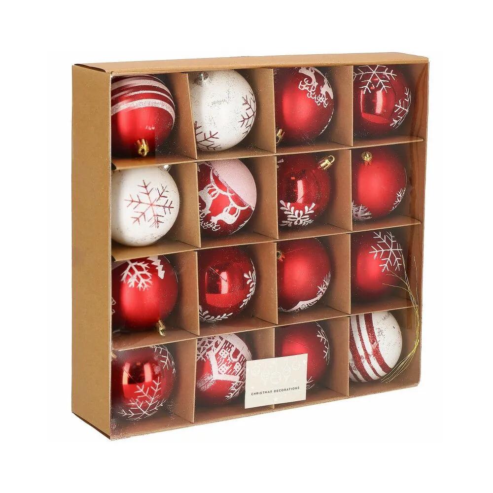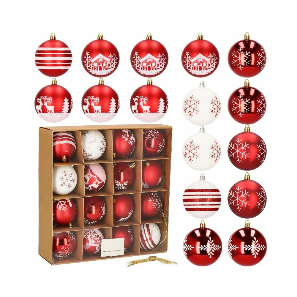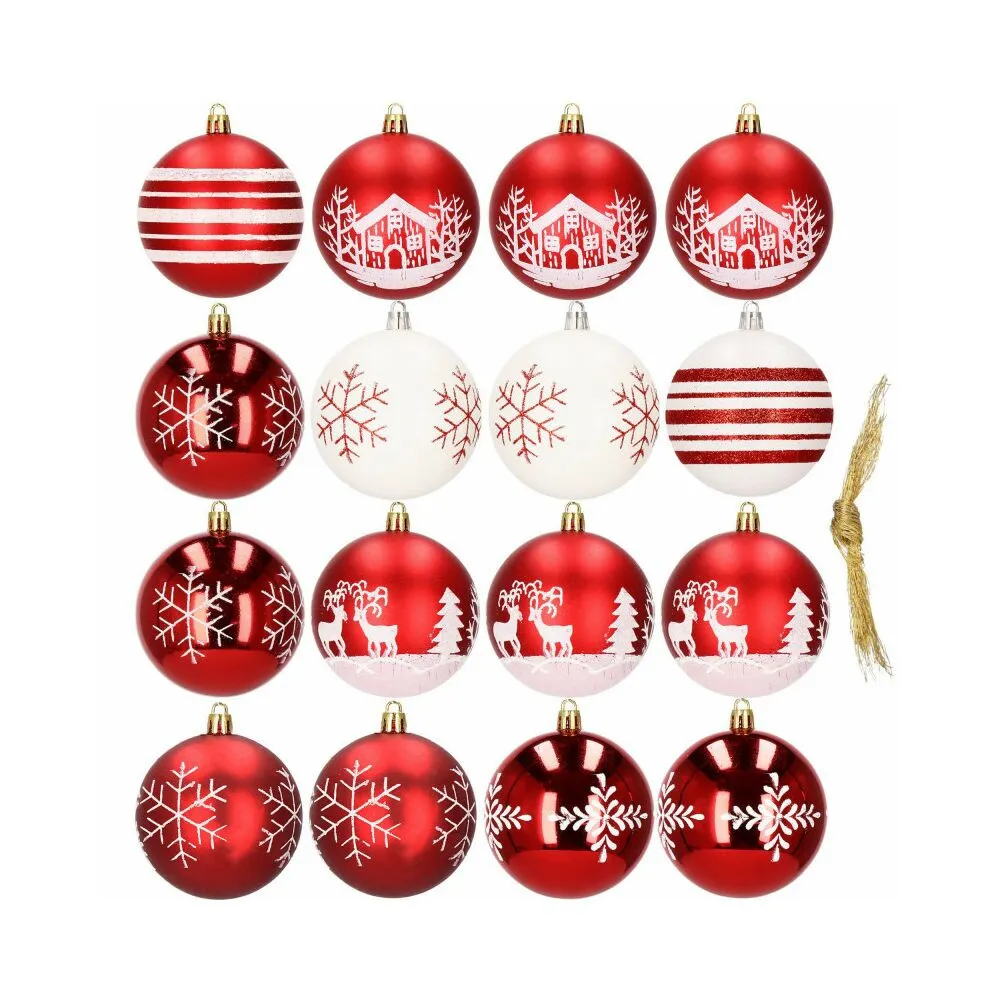 Dvojfarebná sada 16 ks bielych a červených baniek na stromček. Nádherne zdobené zimnými vzormi. Priemer banky 8 cm, pútko na zavesenie, nerozbitný plastový materiál. Ideálne na výzdobu stromčeka alebo ako vianočné dekorácie. Zadarmo povrázky pre ľahké zavesenie.