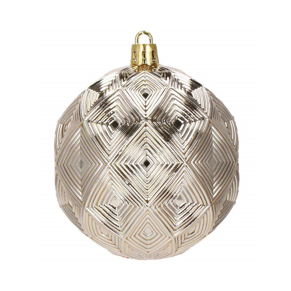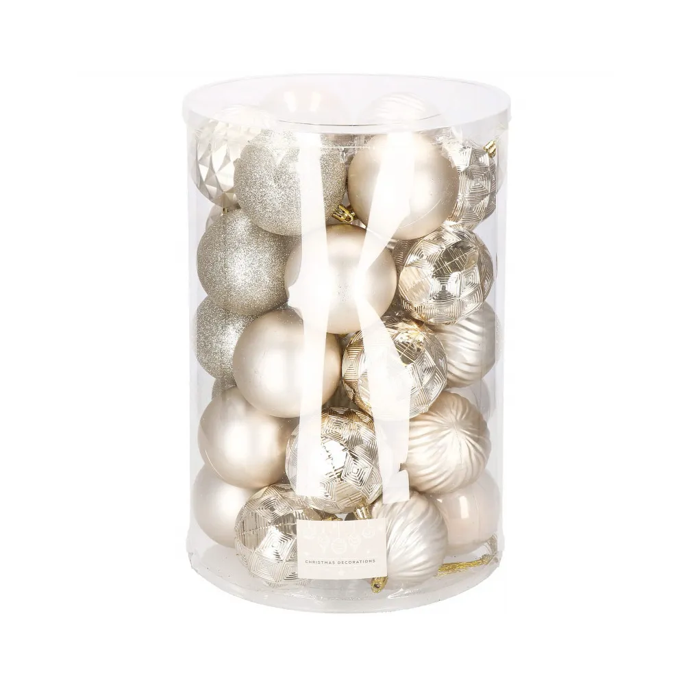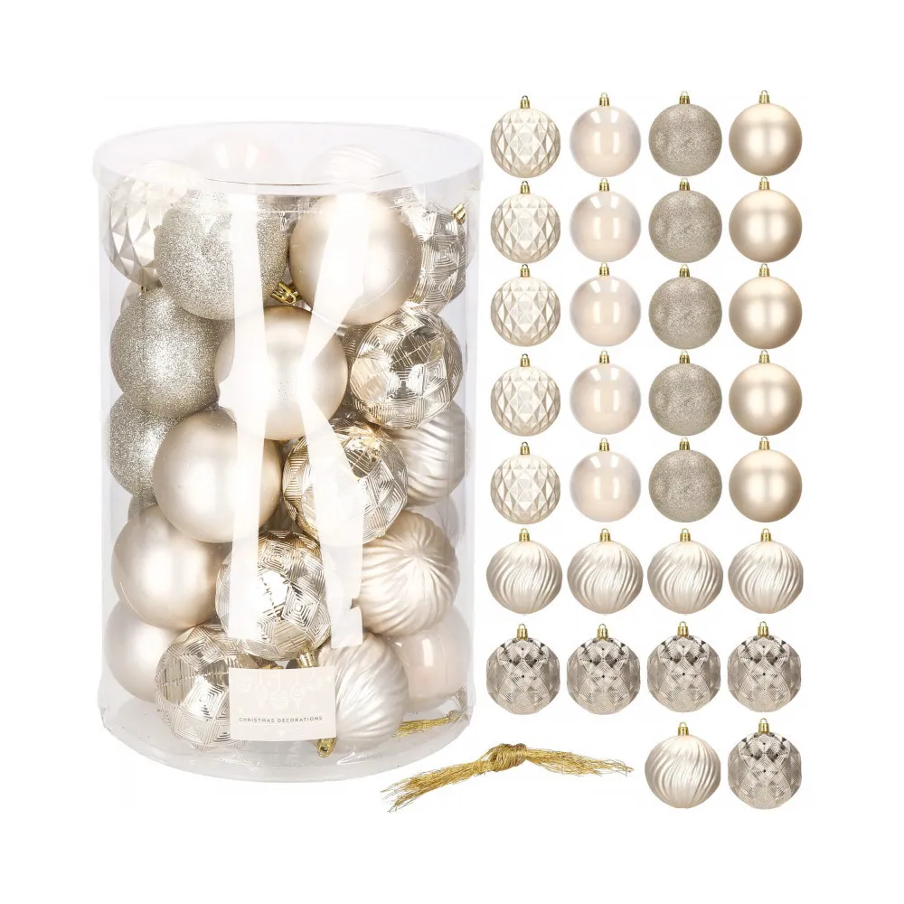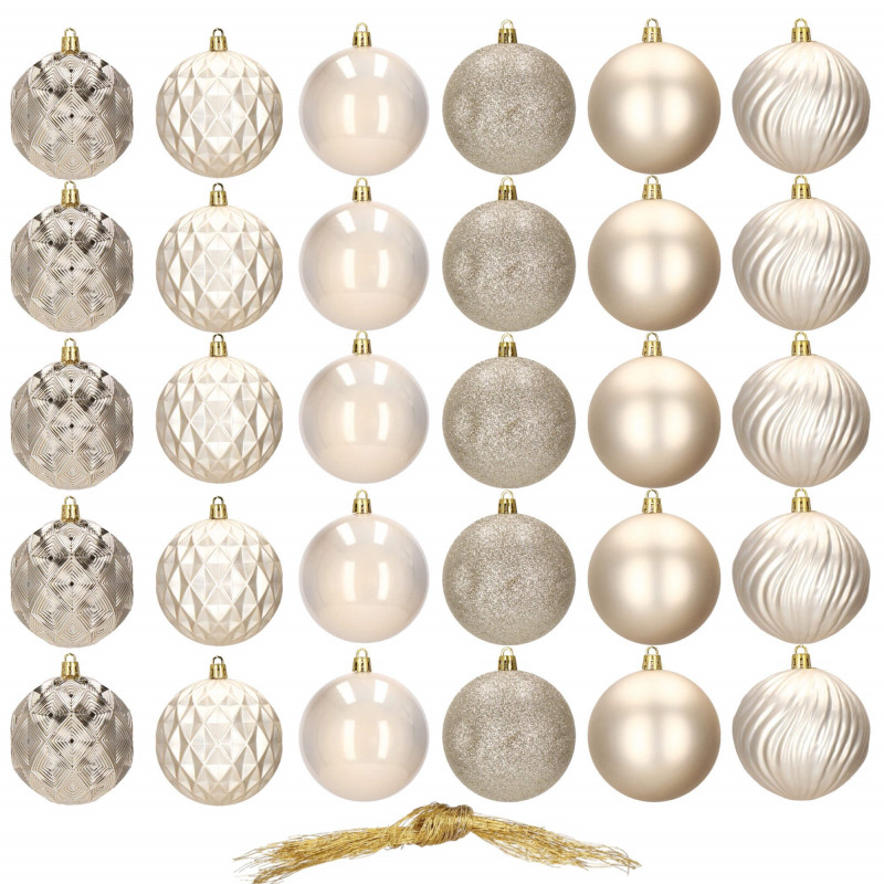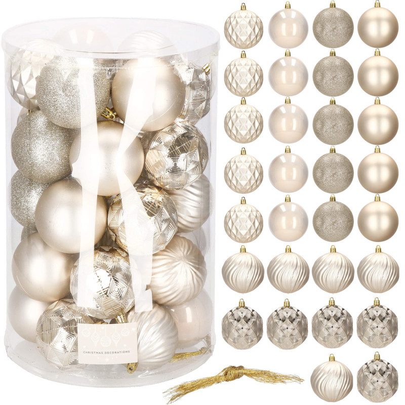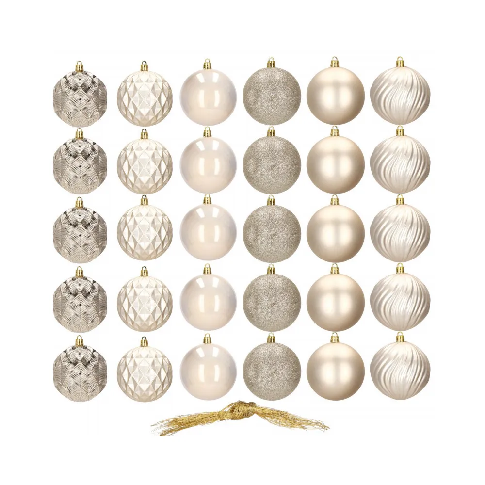 Sada 30 ks zlatých baniek na stromček so šiestimi rôznymi vzormi. Priemer banky je 8 cm. Pútko na zavesenie, nerozbitný plastový materiál. Ideálne na výzdobu stromčeka alebo ako vianočné dekorácie. Zadarmo povrázky pre ľahké zavesenie.