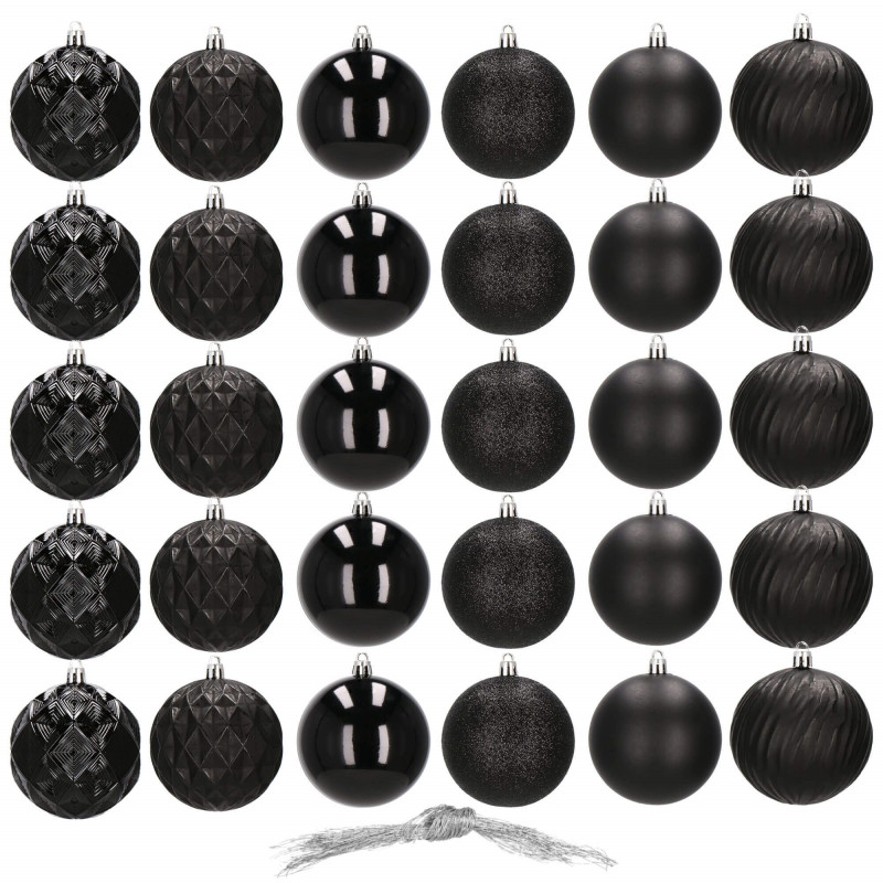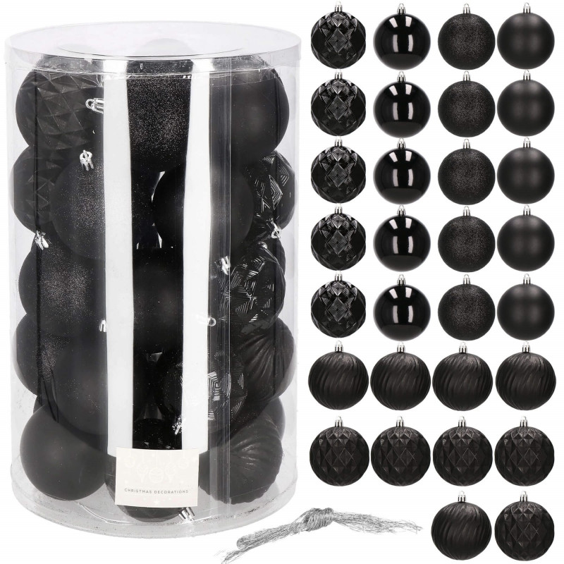 Sada 30 ks čiernych baniek na stromček so šiestimi rôznymi vzormi. Priemer banky je 8 cm. Pútko na zavesenie, nerozbitný plastový materiál. Ideálne na výzdobu stromčeka alebo ako vianočné dekorácie. Zadarmo povrázky pre ľahké zavesenie.